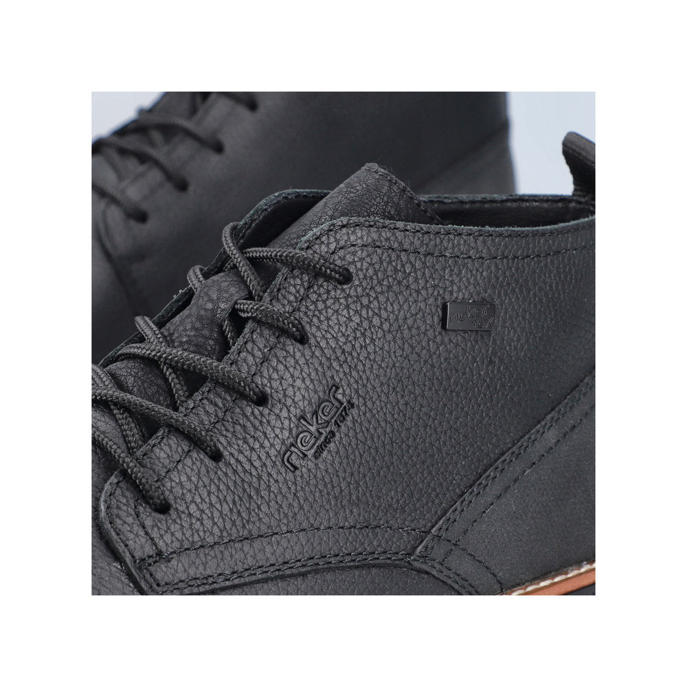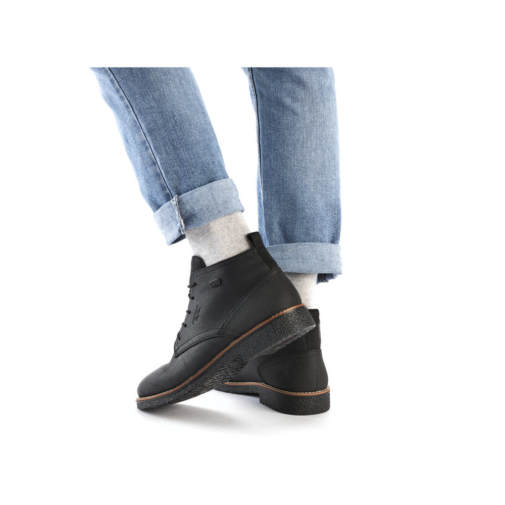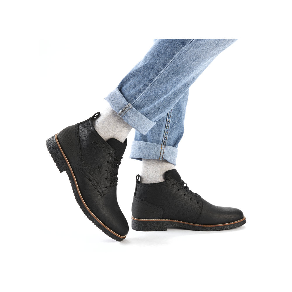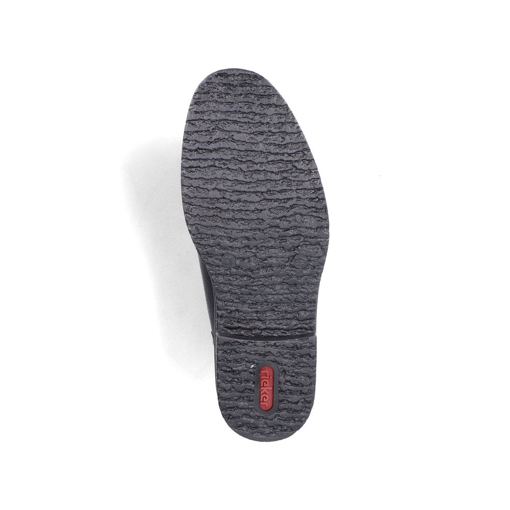 Black Beauty! These graphite black Rieker lace-up boots made of smooth leather offer style and functional features for cool weather. In addition, ideal support and a good fit are guaranteed by the lacing. The sole is grippy and ensures a good traction at all times. On top of that, the extra soft cover sole provides an extra portion of wearing comfort. The comfort width G 1/2 gives the toes more freedom of movement. The cozy and very warm virgin wool lining and the proven RiekerTEX technology make these shoes the perfect companion - no matter when, no matter where! Pure wearing luxury!