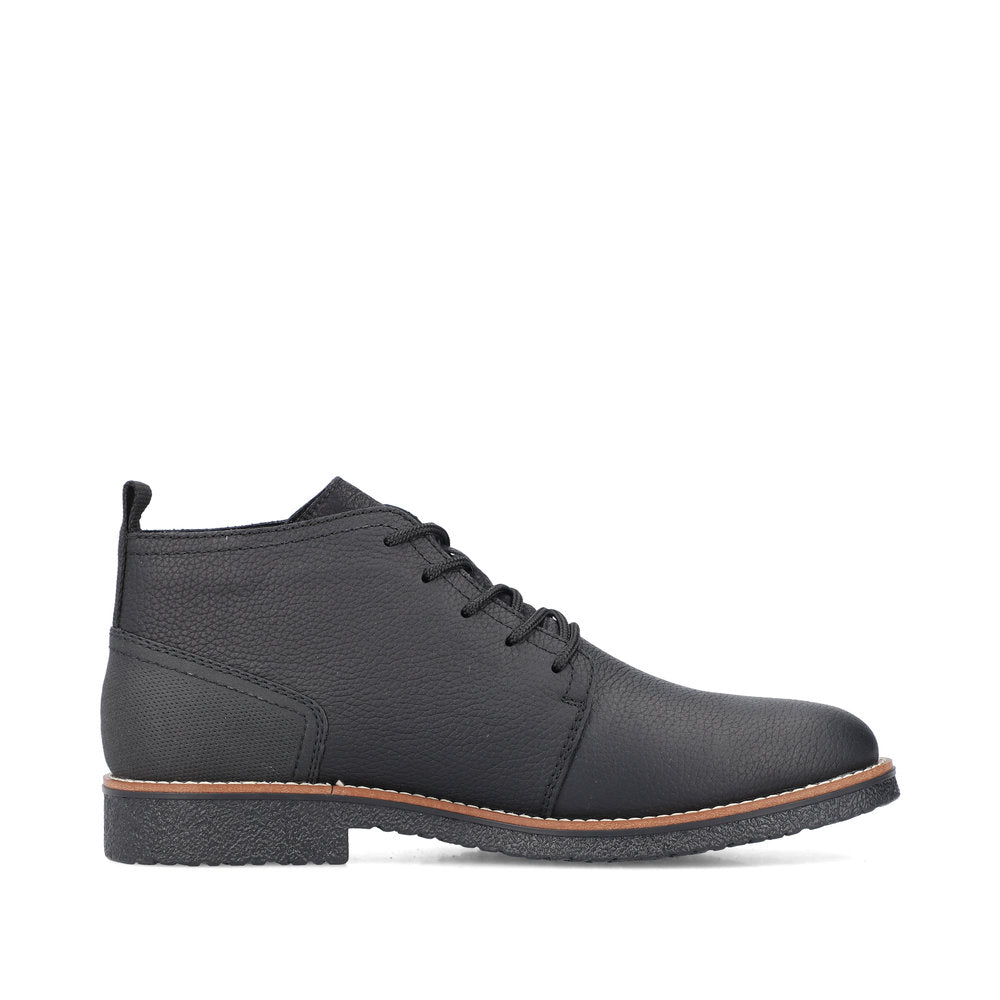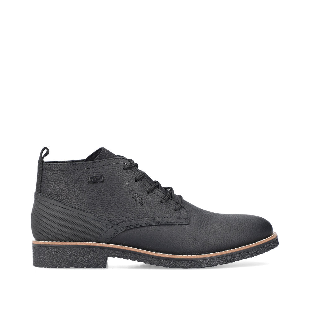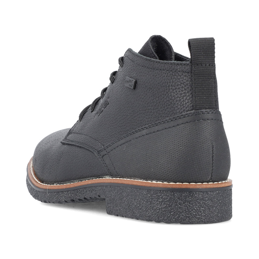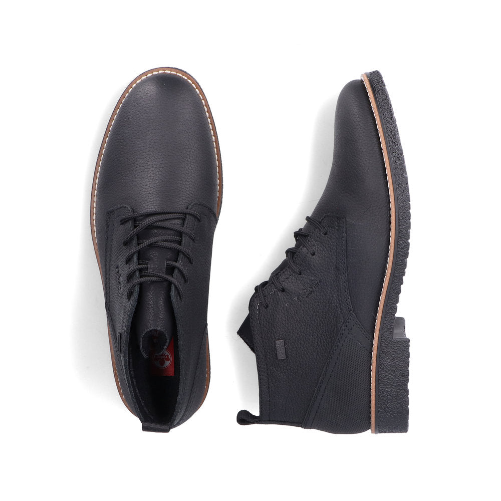 Black Beauty! These graphite black Rieker lace-up boots made of smooth leather offer style and functional features for cool weather. In addition, ideal support and a good fit are guaranteed by the lacing. The sole is grippy and ensures a good traction at all times. On top of that, the extra soft cover sole provides an extra portion of wearing comfort. The comfort width G 1/2 gives the toes more freedom of movement. The cozy and very warm virgin wool lining and the proven RiekerTEX technology make these shoes the perfect companion - no matter when, no matter where! Pure wearing luxury!