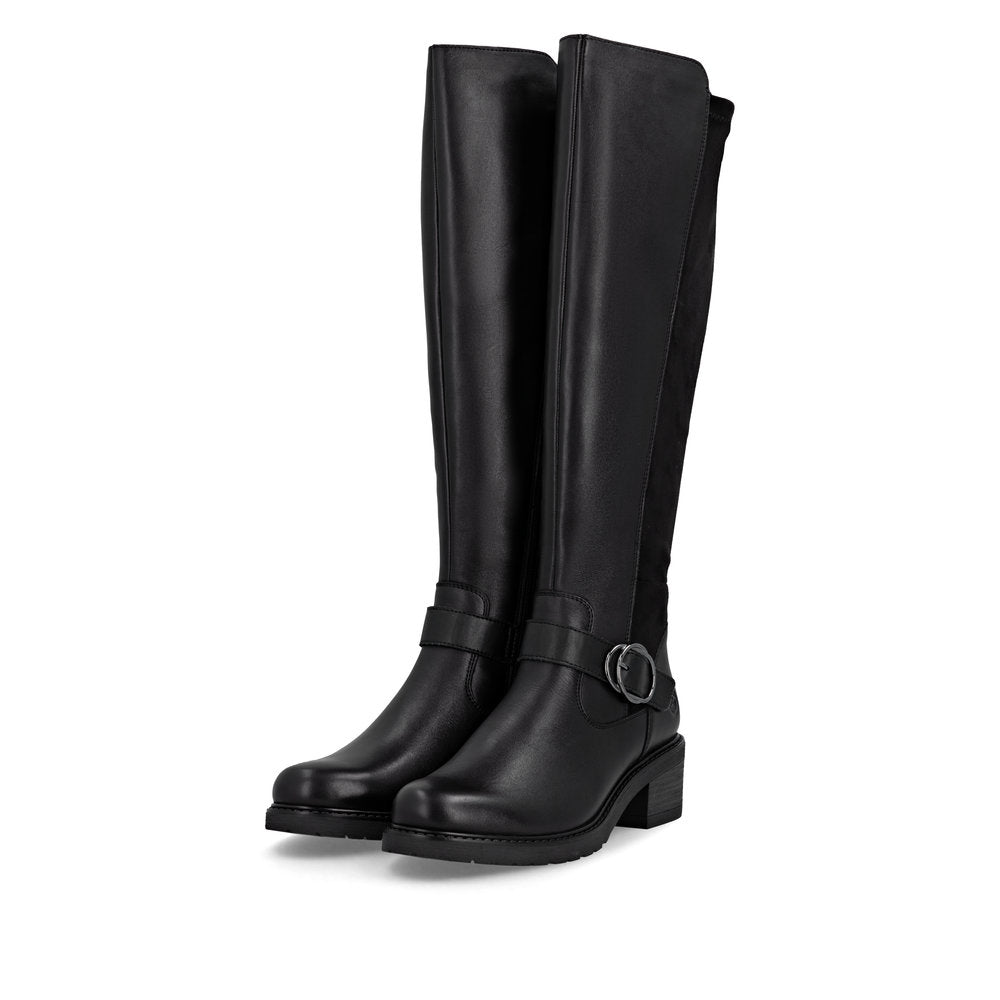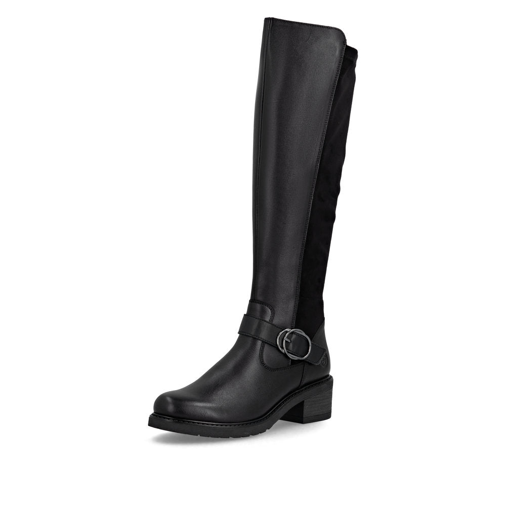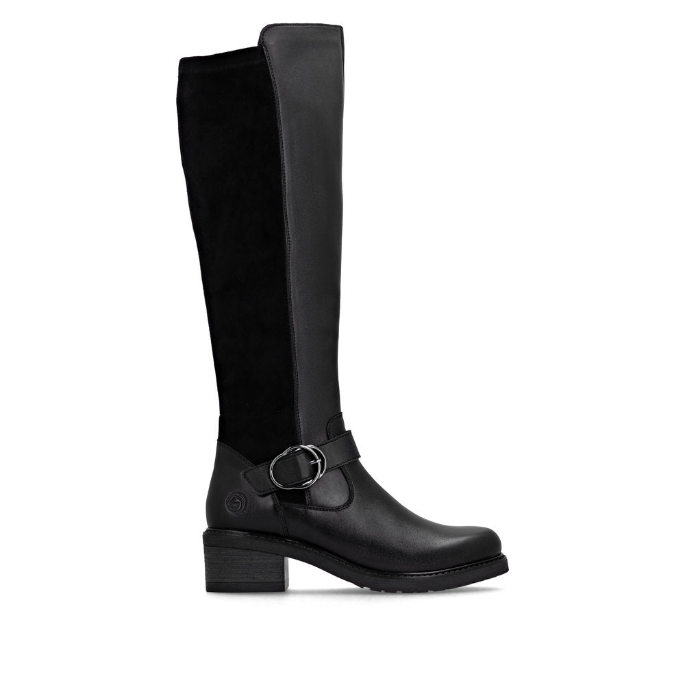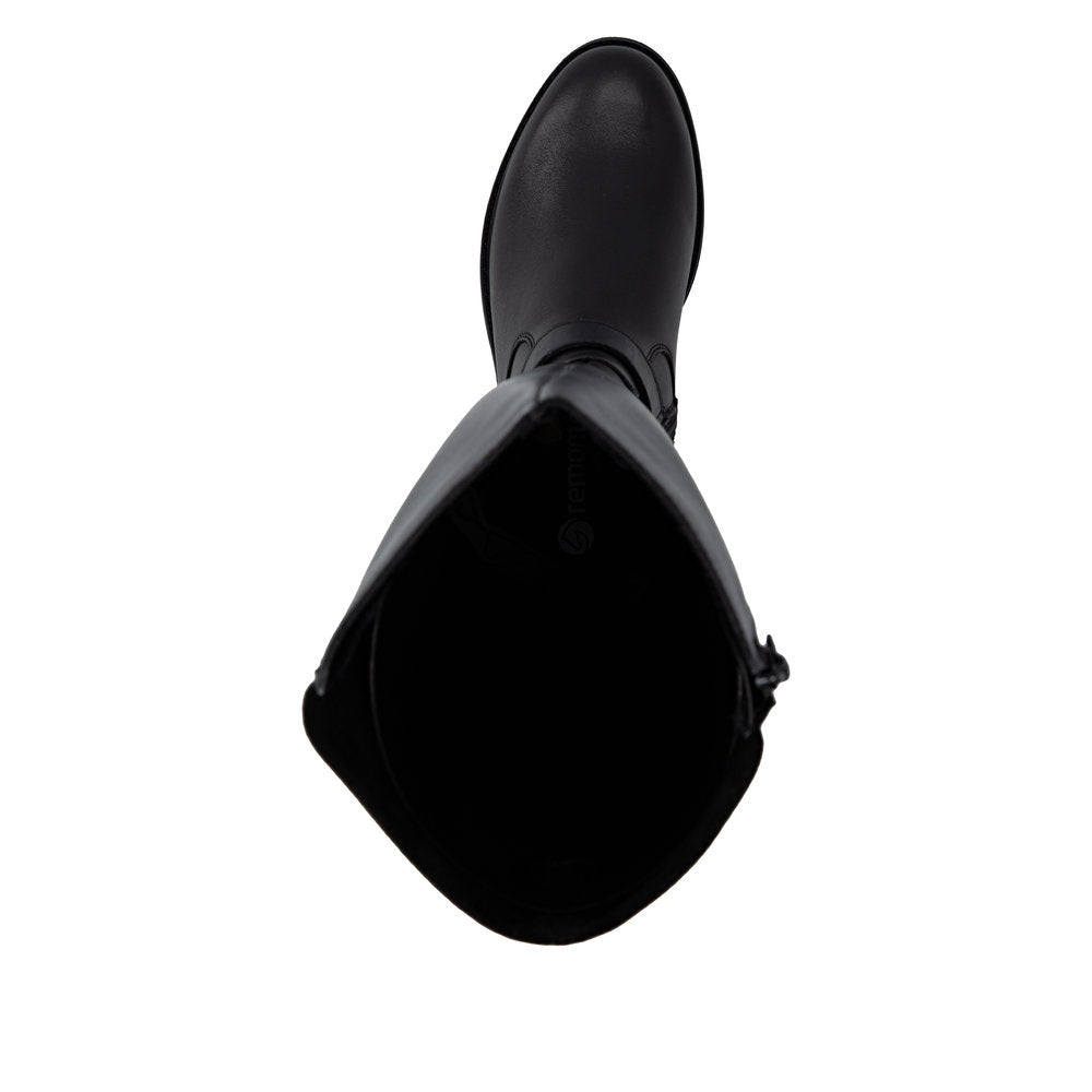 Comfy meets design - a perfect duo! These black remonte high boots made of smooth leather are a must-have in any shoe cupboard this season. The elastic band makes the shoe easy and comfortable to put on and take off. A grippy and flexible sole with block heel as well as the padded and removable insole are further arguments for these boots. The Vario Shaft guarantees the perfect individual fit on the calf. That means: endless strolling is no problem at all!