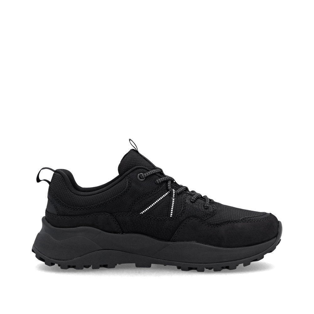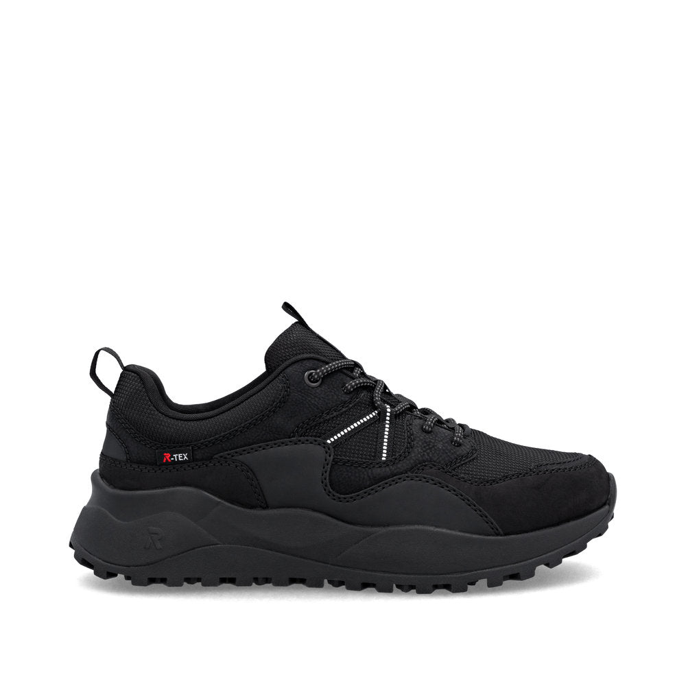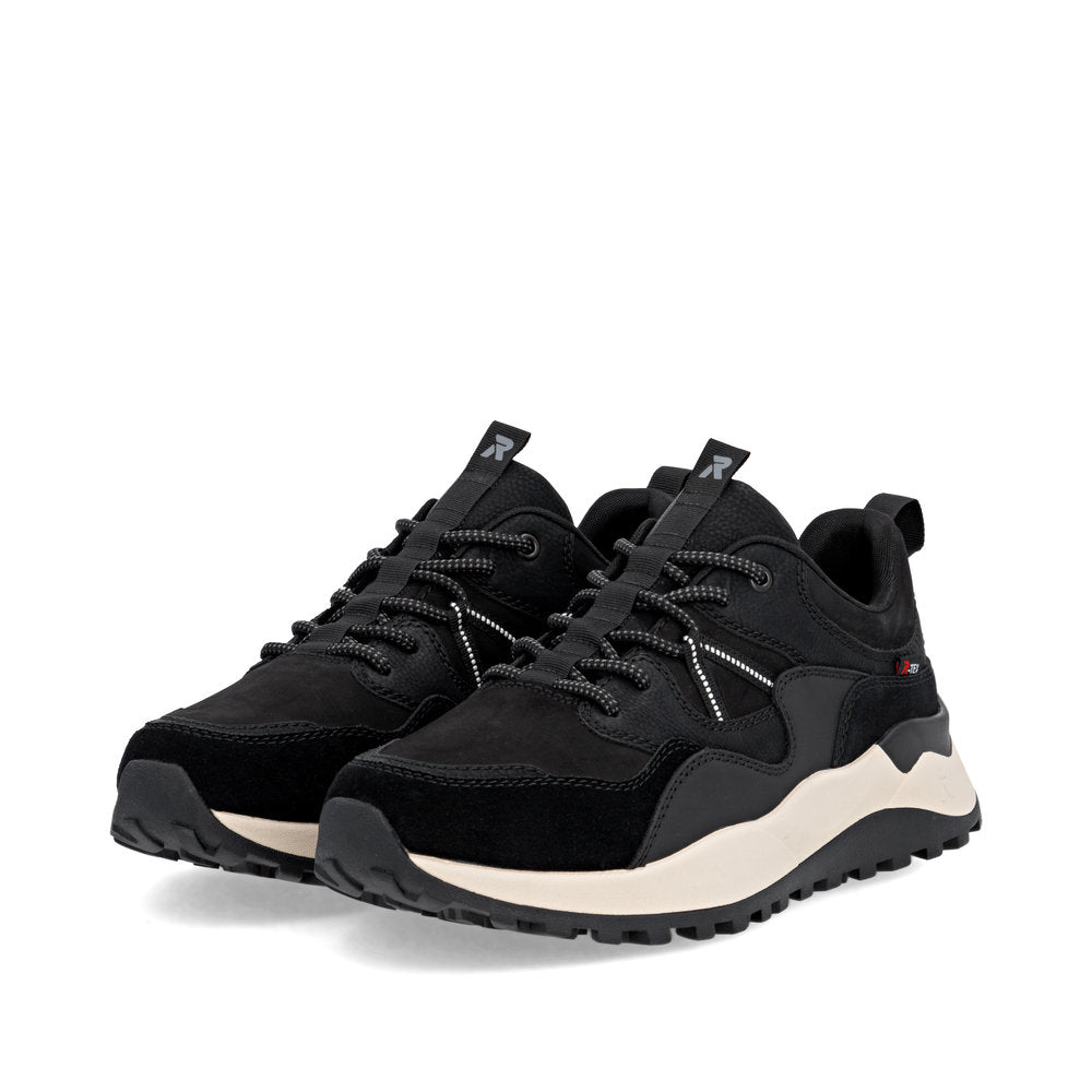 Black Rieker low-top sneakers made of quality textile. Walk Protected with the water-repellent, breathable RiekerTEX membrane. The HighTech Nano coating provides a water and dirt-repelling effect. Padded, removable insole with cushioning properties. Light Drysport lining with breathable properties. The comfort width means the shoe fits perfectly.