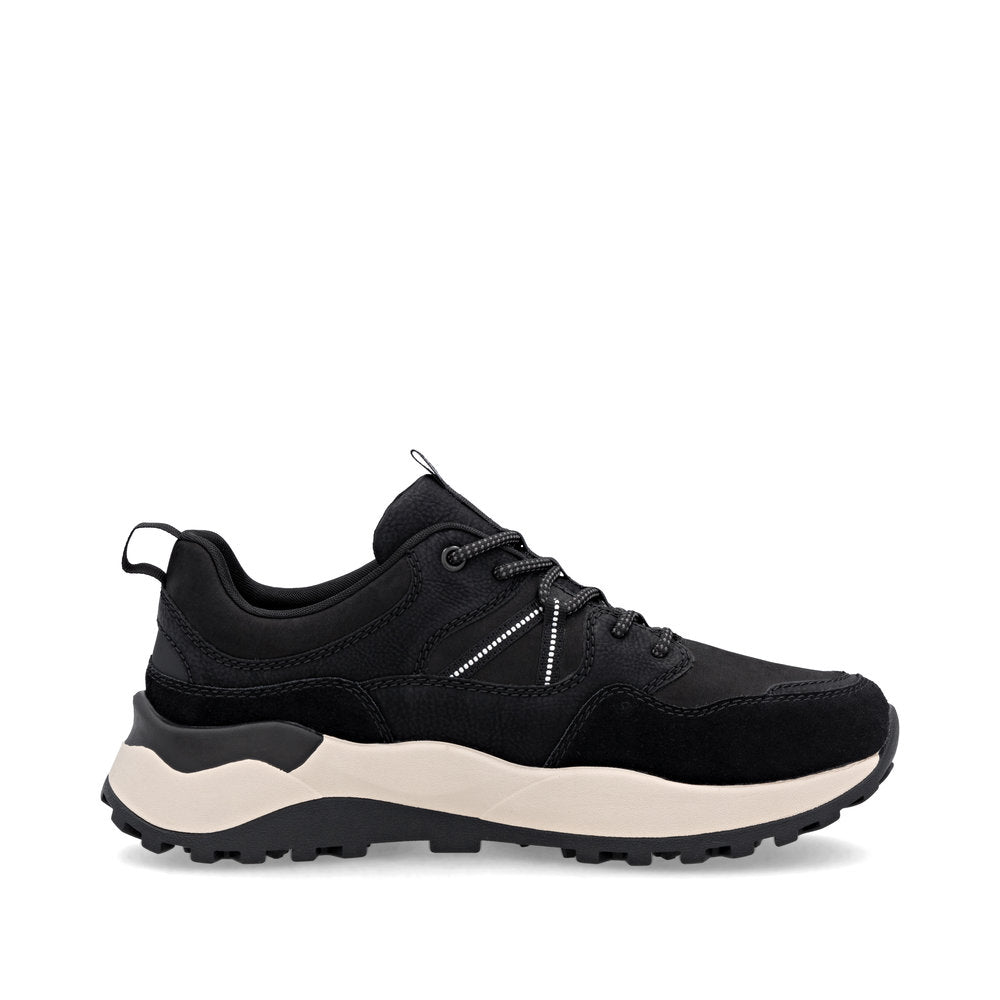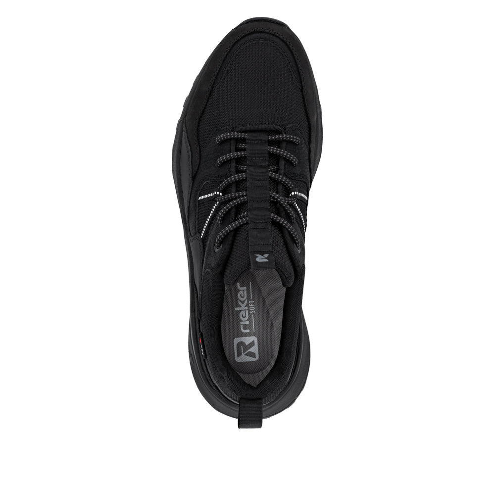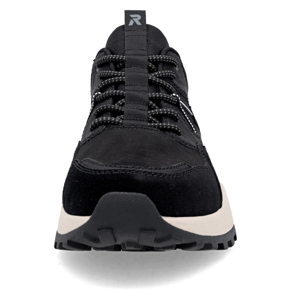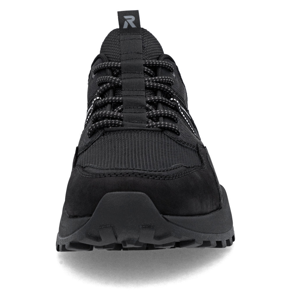 Black Rieker low-top sneakers made of quality textile. Walk Protected with the water-repellent, breathable RiekerTEX membrane. The HighTech Nano coating provides a water and dirt-repelling effect. Padded, removable insole with cushioning properties. Light Drysport lining with breathable properties. The comfort width means the shoe fits perfectly.