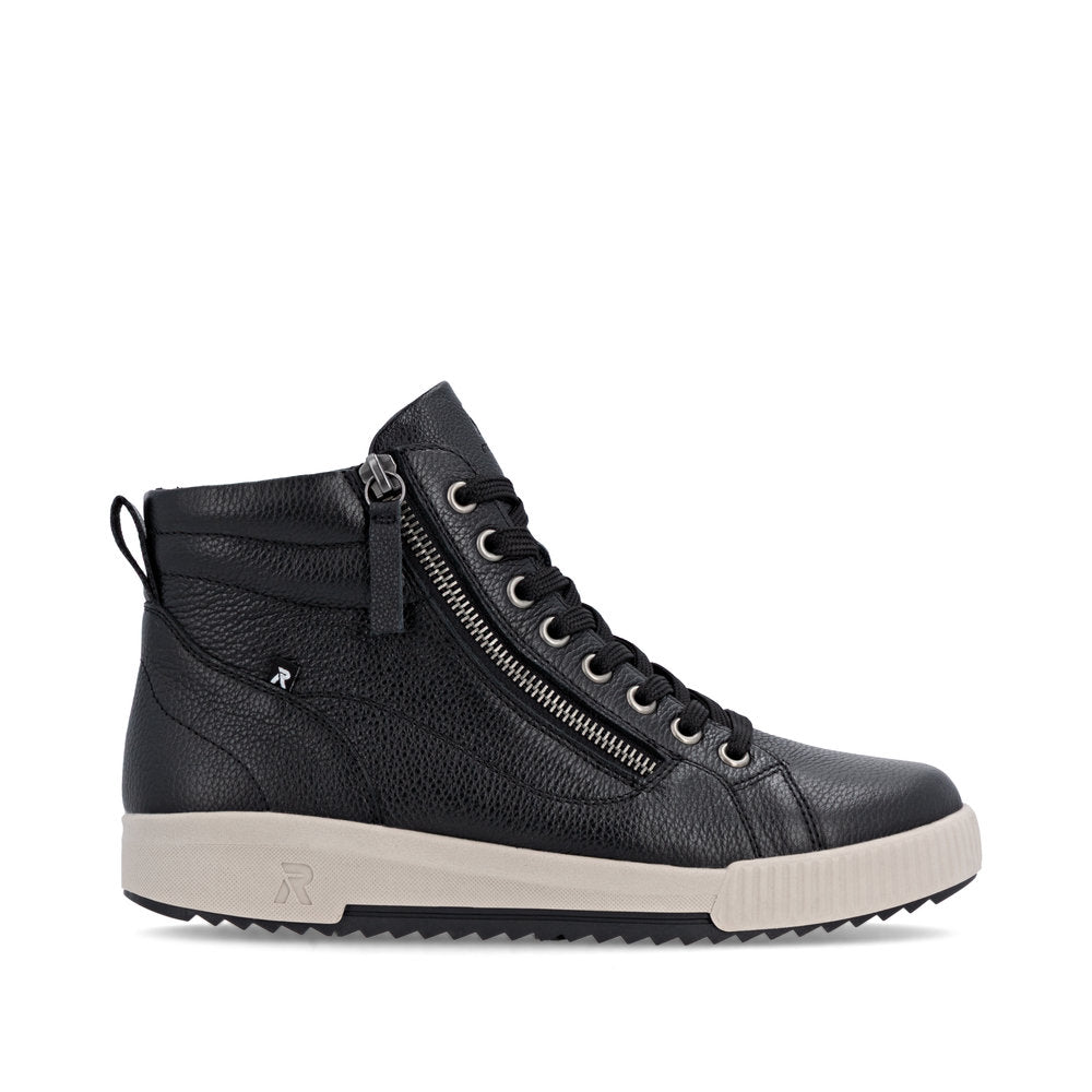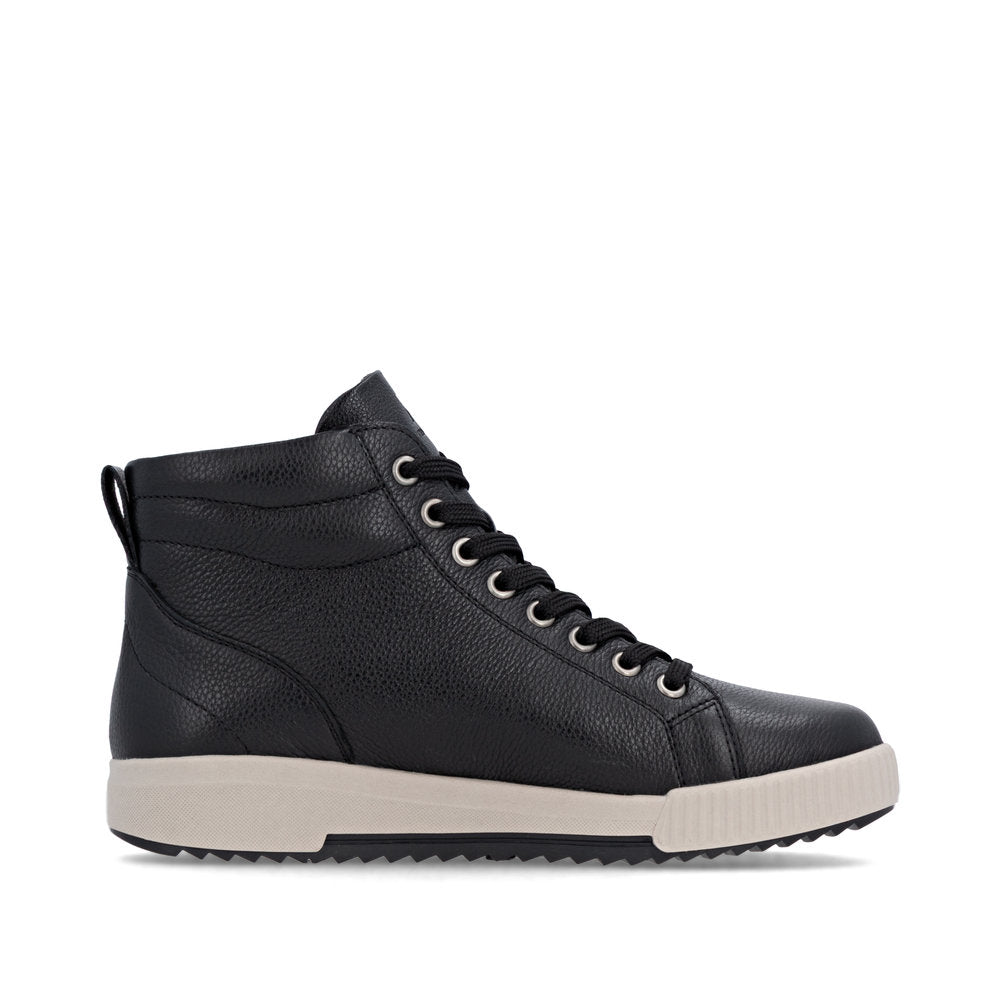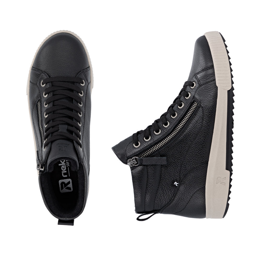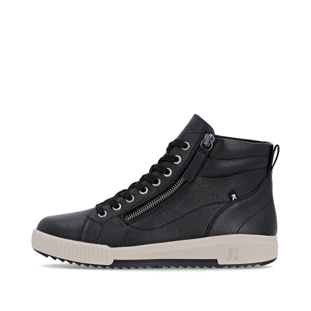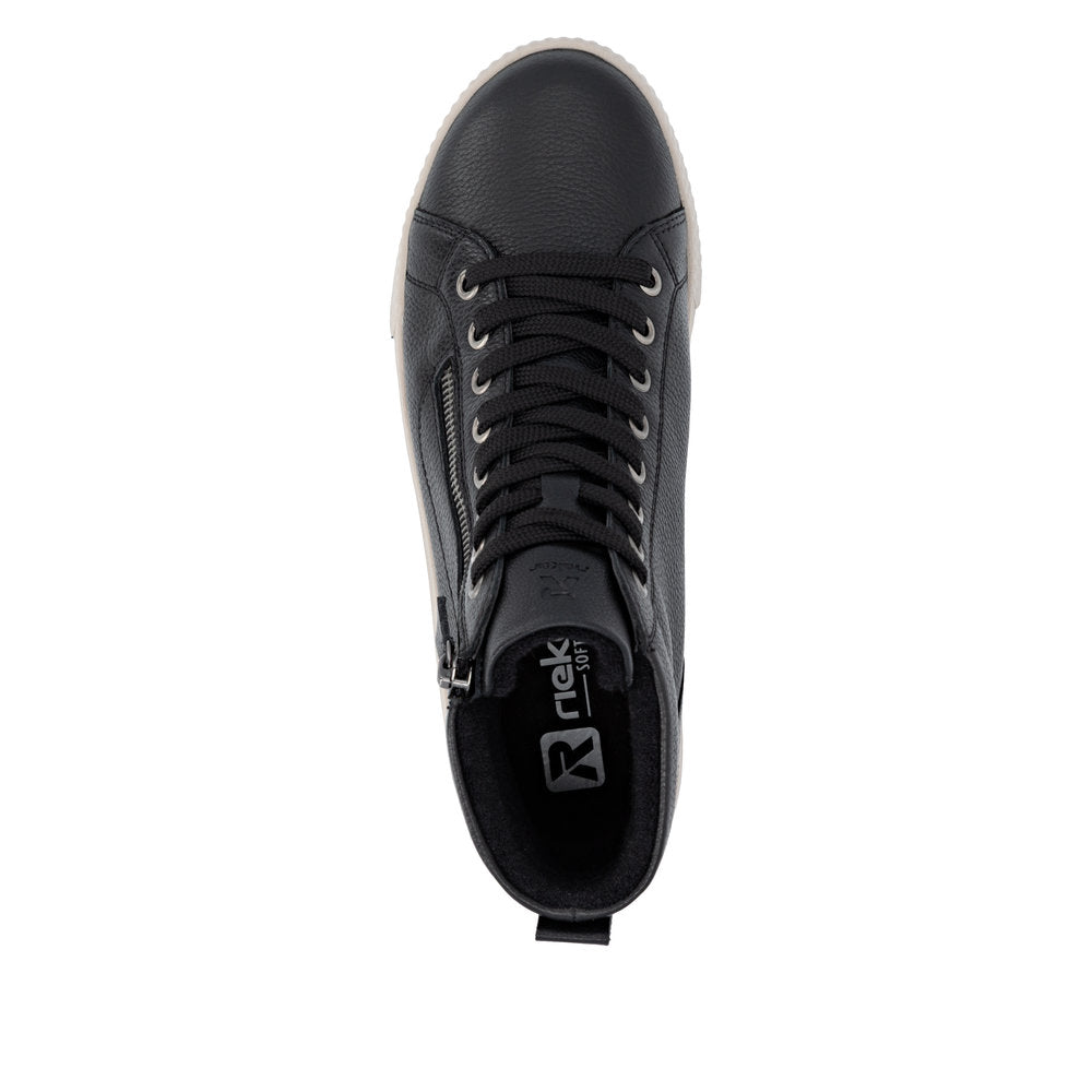 Fit at every turn? That's possible! These cool black Rieker high-top sneakers made of smooth leather are THE highlight. The clever combination of lacing and zipper makes it easy to put on and take off the shoe. The shoe has a grippy and light sole that impresses with good traction for a secure step. Even more comfort is guaranteed with the padded and removable insole. Comfort is their superpower!