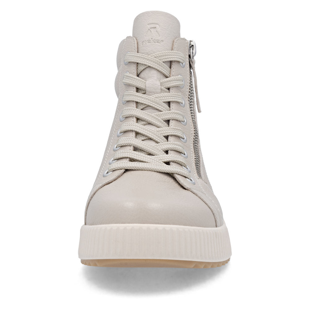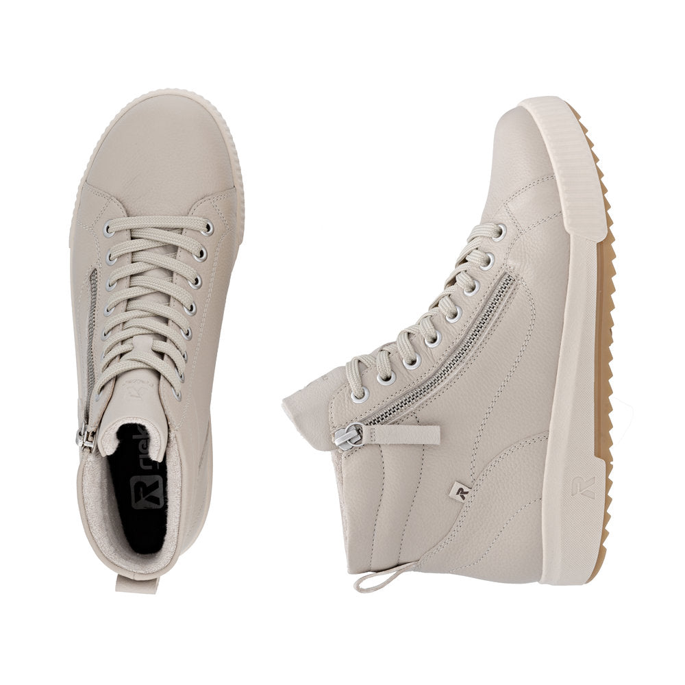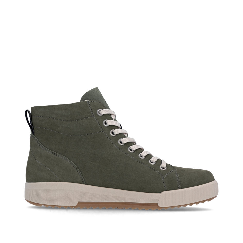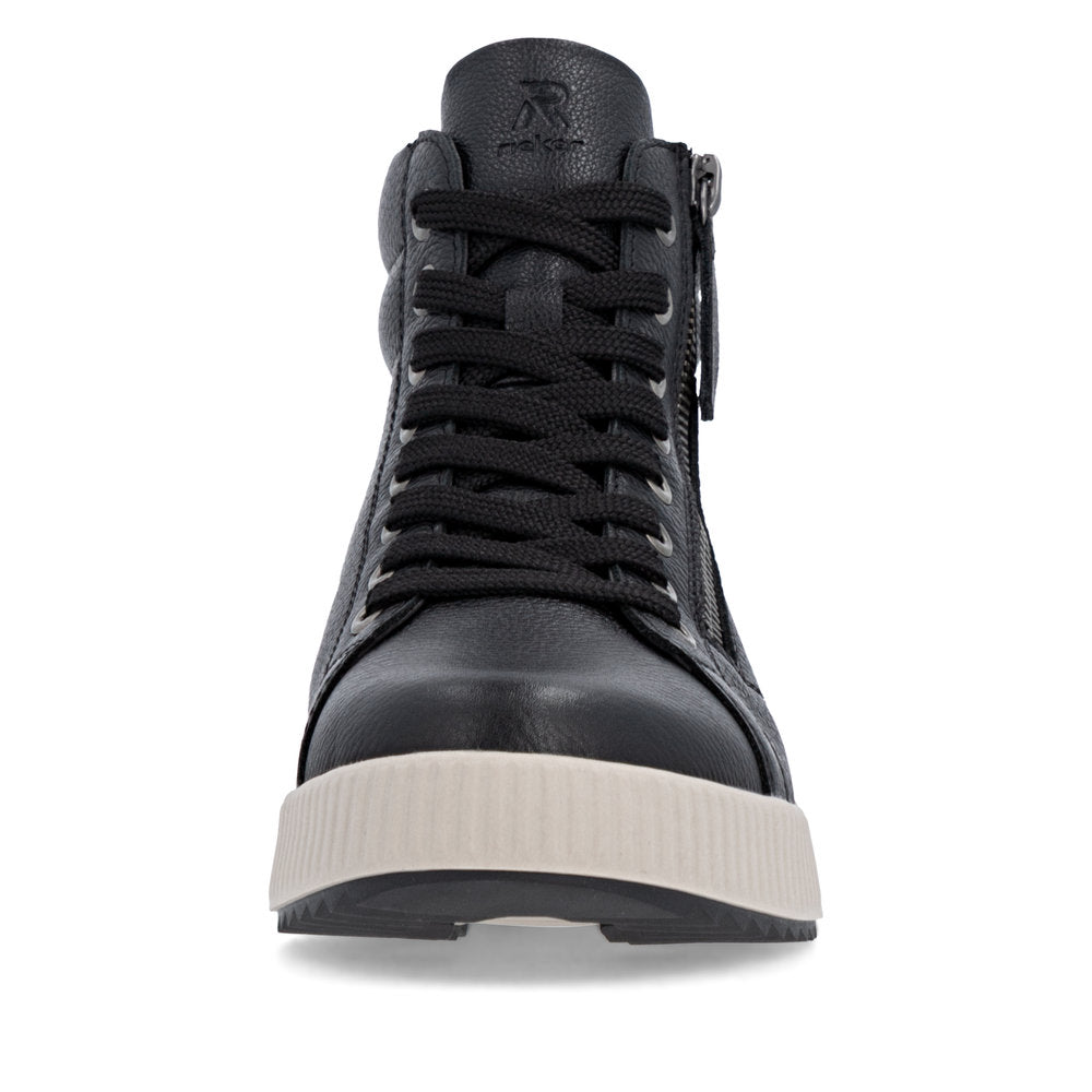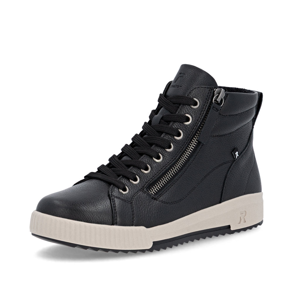 Fit at every turn? That's possible! These cool black Rieker high-top sneakers made of smooth leather are THE highlight. The clever combination of lacing and zipper makes it easy to put on and take off the shoe. The shoe has a grippy and light sole that impresses with good traction for a secure step. Even more comfort is guaranteed with the padded and removable insole. Comfort is their superpower!