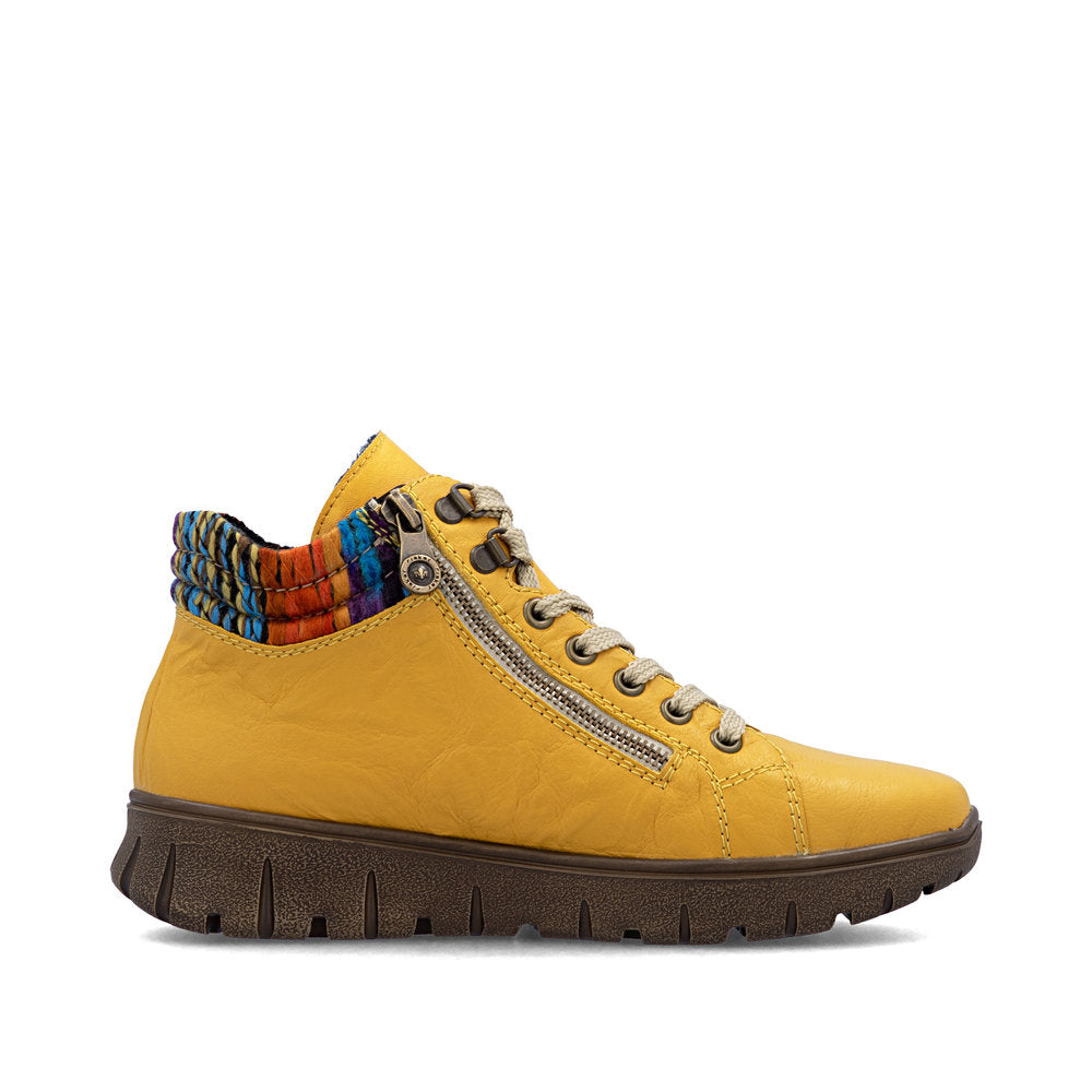 Maximum comfort at every turn! These yellow Rieker lace-up boots are made of smooth leather and offer real comfort for the feet. The clever combination of lacing and zipper provides optimal support and makes the shoe easy to put on and take off. The padded shaft edge provides the perfect finish and a striking look. The sole is both shock-absorbing and ultra light, offering a double sense of well-being at every step. With the padded and removable insole, the boots have another practical comfort feature. Moreover, the extra width offers your feet more freedom of movement in the forefoot area. The shoes are equipped with a water-repellent membrane for dry feet in wind and weather. Nothing stands in the way of long walks!