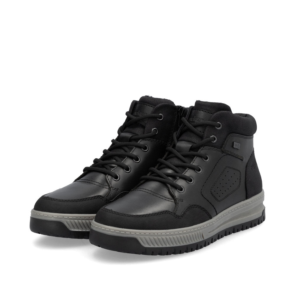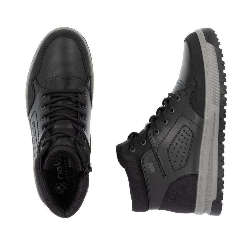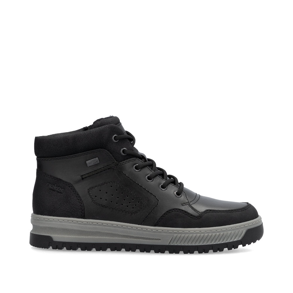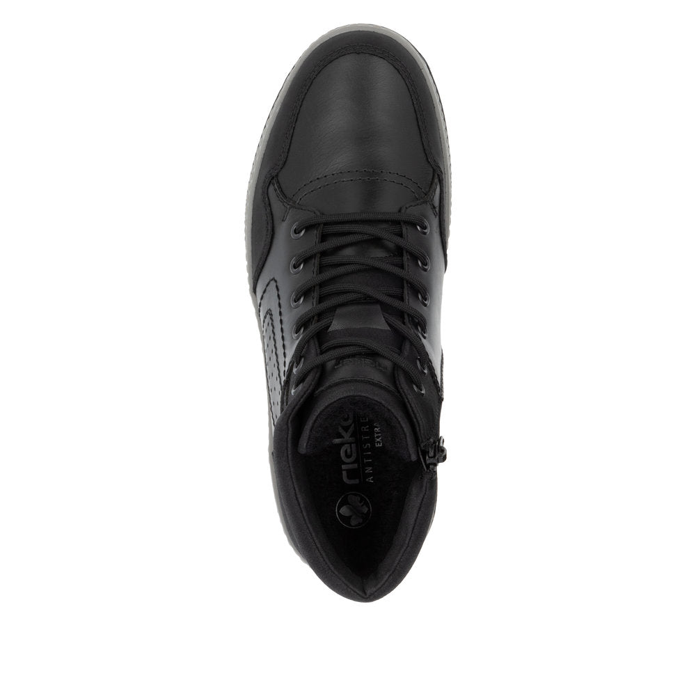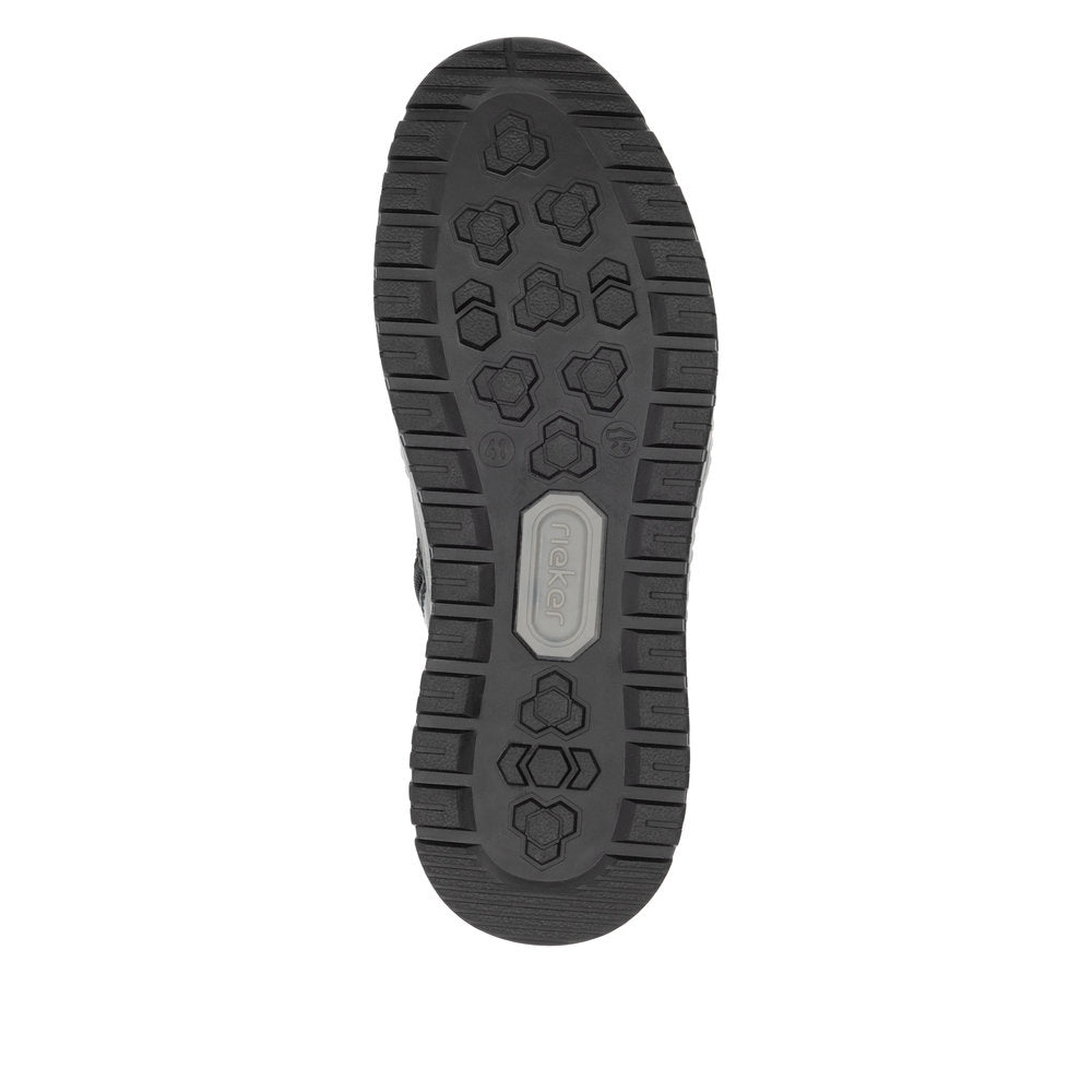Comfort meets style. Freezing is a foreign word with these urban black Rieker lace-up boots made of smooth leather. The lacing complements the zipper for functionality and comfort. The grippy sole gives sure-footedness at every step. In addition, the cover sole is extra soft. The extra width H gives the toes more freedom of movement. You are also one step ahead in terms of comfort with the water-repellent RiekerTEX membrane and the cozy and very warm virgin wool lining. All in one - top!