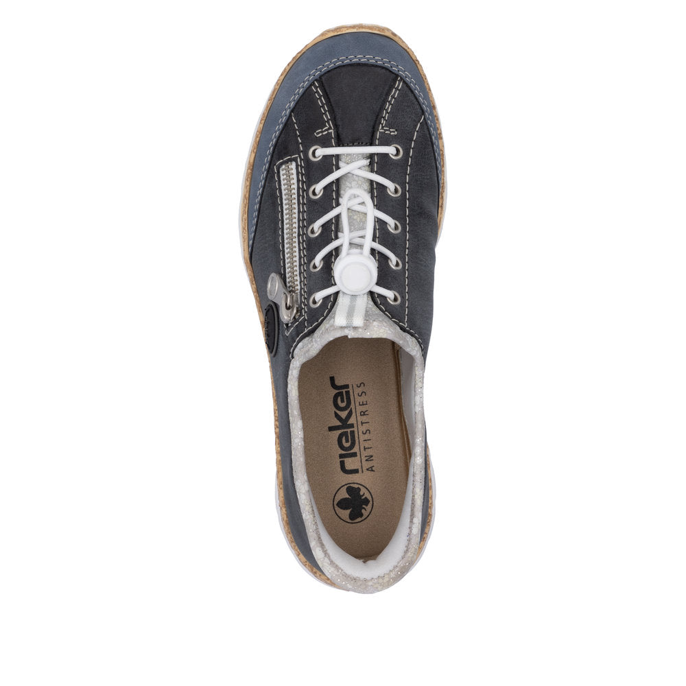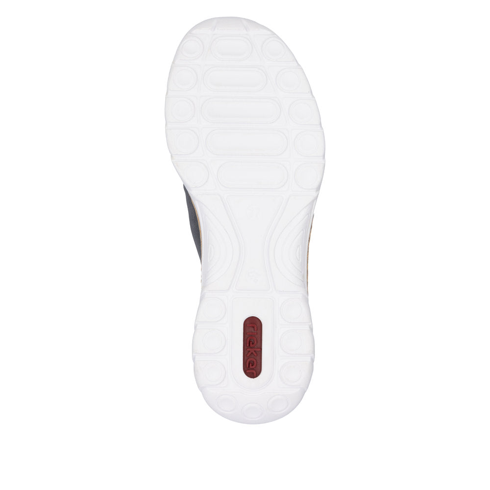 Cool, modern and sporty. This blue Rieker slipper is not just any Rieker slipper! The stitchdown construction makes this shoe robust and the sole particularly flexible. The elastic band in combination with the elastic lacing make this shoe particularly easy to put on and take off. The decorative zipper adds a stylish touch. The light and shock-absorbing sole with wedge heel promises grip and the extra-soft MemoSoft cover sole provides additional comfort. Ready2GO: just slip them on, no hands and no creases - the stiff heel part keeps the shoe in shape! Simply the best!