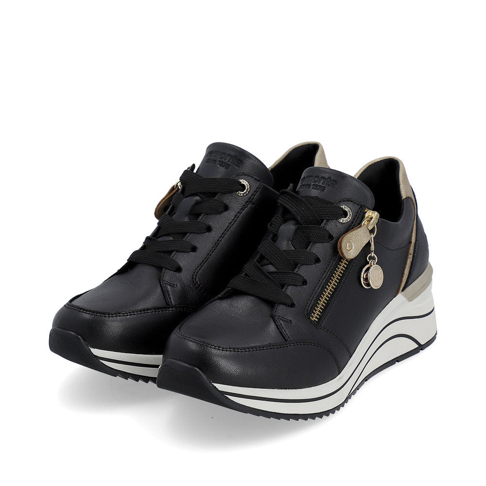 Classy chic! These black remonte low-top sneakers made of smooth leather are sure to catch a glance or two. The clever combination of lacing and zipper provides optimal support and makes the shoe easy to put on and take off. Thanks to the proven remonte Lite 'n Soft technology and the padded and removable insole, the sneakers are feather-light and comfortable to wear. Furthermore, the extra width offers your feet more freedom of movement in the forefoot area. The shoes are equipped with a water-repellent membrane for dry feet in wind and weather. We love it!