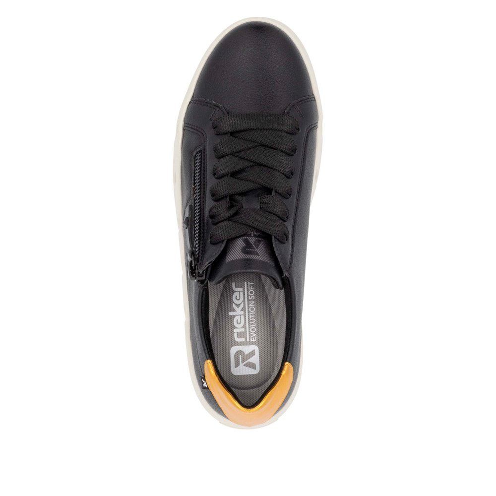 THE trifecta of the season: style, comfort and function! These black Rieker low-top sneakers made of smooth leather are always the right choice! The clever combination of lacing and zipper makes it easy to put on and take off the shoe. With the cushioning and ultra light platform sole, your feet will be pampered at every step. Moreover, the padded and removable insole is easy to change. The microvelour lining is light and breathable for a comfortable feeling all day long. Very cool!
