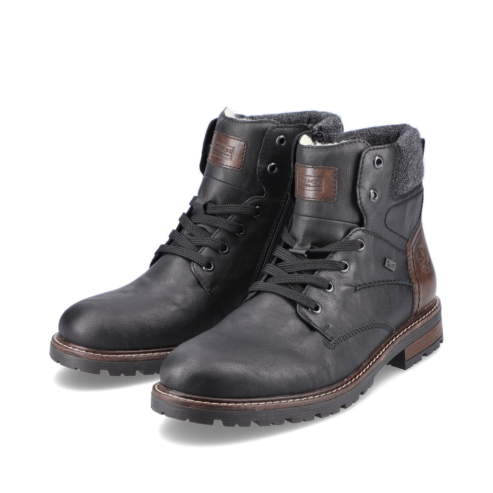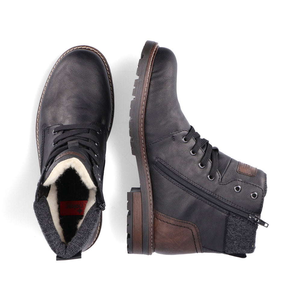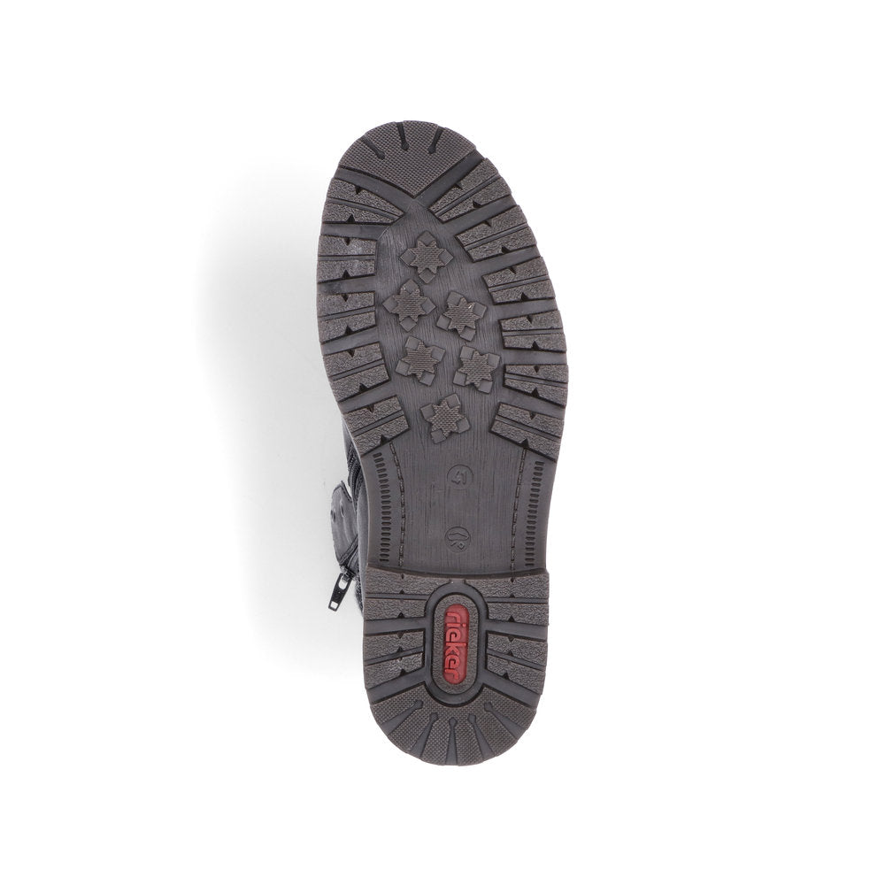 Fashion meets function. These urban black Rieker lace-up boots are perfect for every day. In addition to the lacing, this model is equipped with a zipper that provides optimal support. The grippy sole convinces all along the line and the extra soft cover sole provides additional comfort. Furthermore, the comfort width G 1/2 offers your feet more freedom of movement in the forefoot area. The combination of the water-repellent RiekerTEX membrane and very warm and cozy virgin wool lining ensures warm and dry feet in any weather. Here the cold goes away empty-handed.