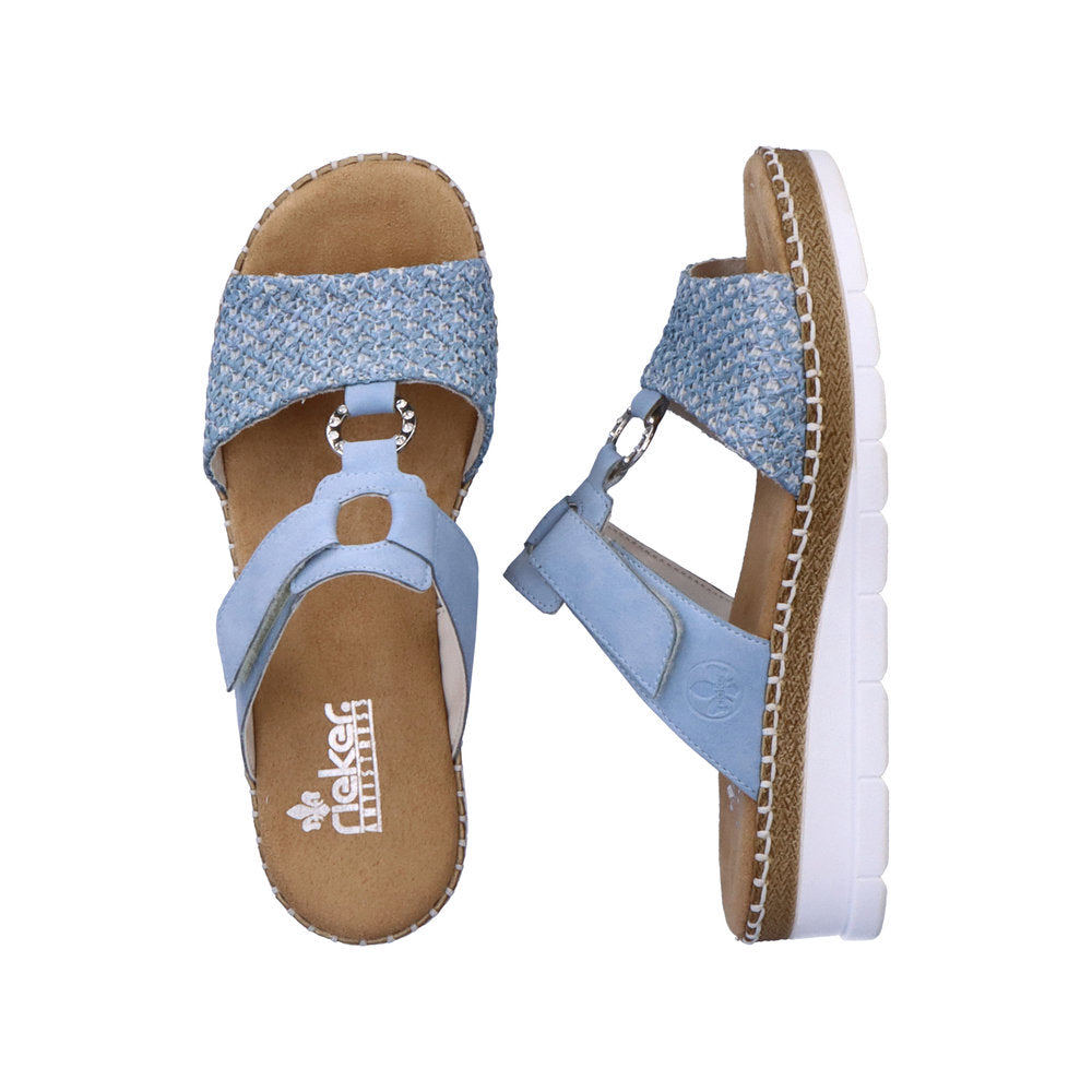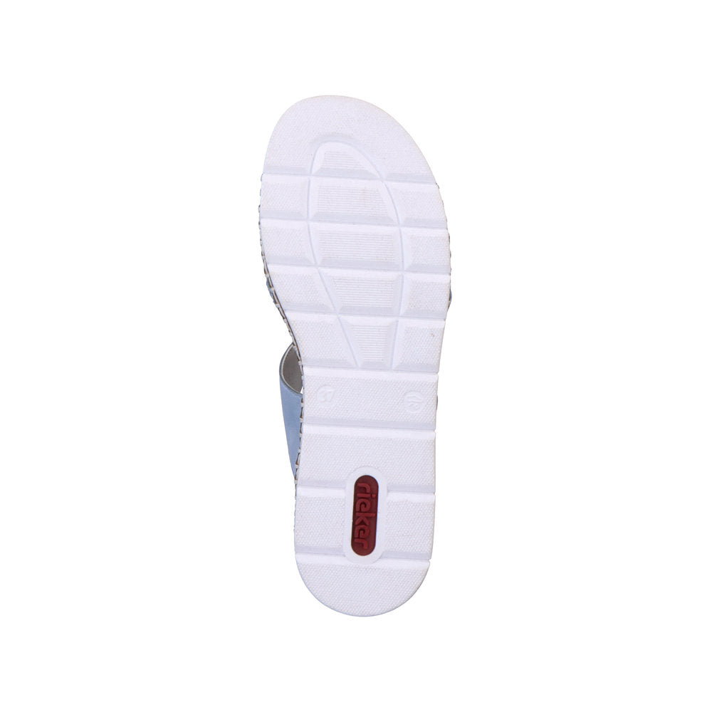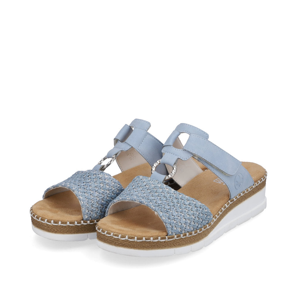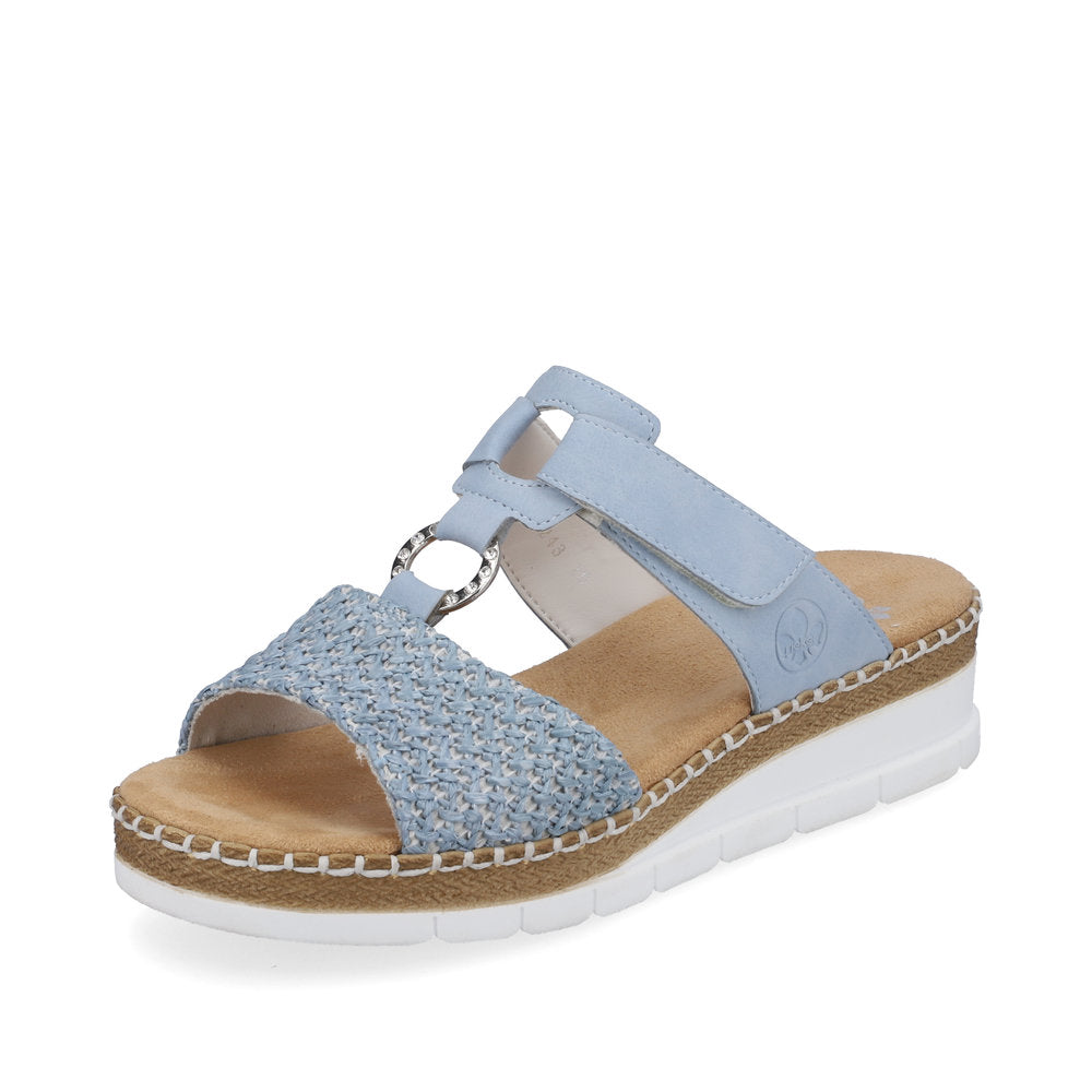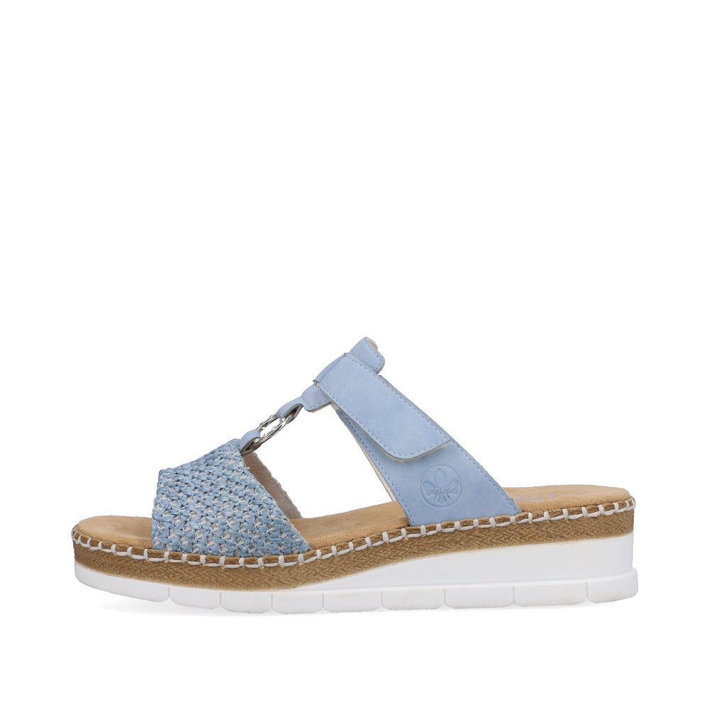 Mules for the win! Go for maximum comfort and ultimate style with these blue Rieker mules. The shoe is constructed in the stitchdown style, which makes it particularly robust and flexible. The mules are put on in no time thanks to a hook and loop fastener. The shock-absorbing and very light sole with wedge heel ensures a pleasant, cushioned feeling with every step, and the extra soft cover sole provides extra comfort. Thanks to the narrow E 1/2 fit, the shoe fits comfortably tight without pinching. Start into summer!