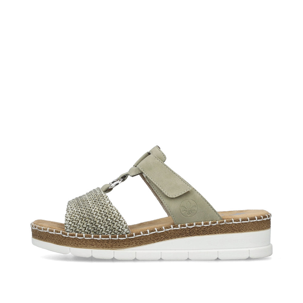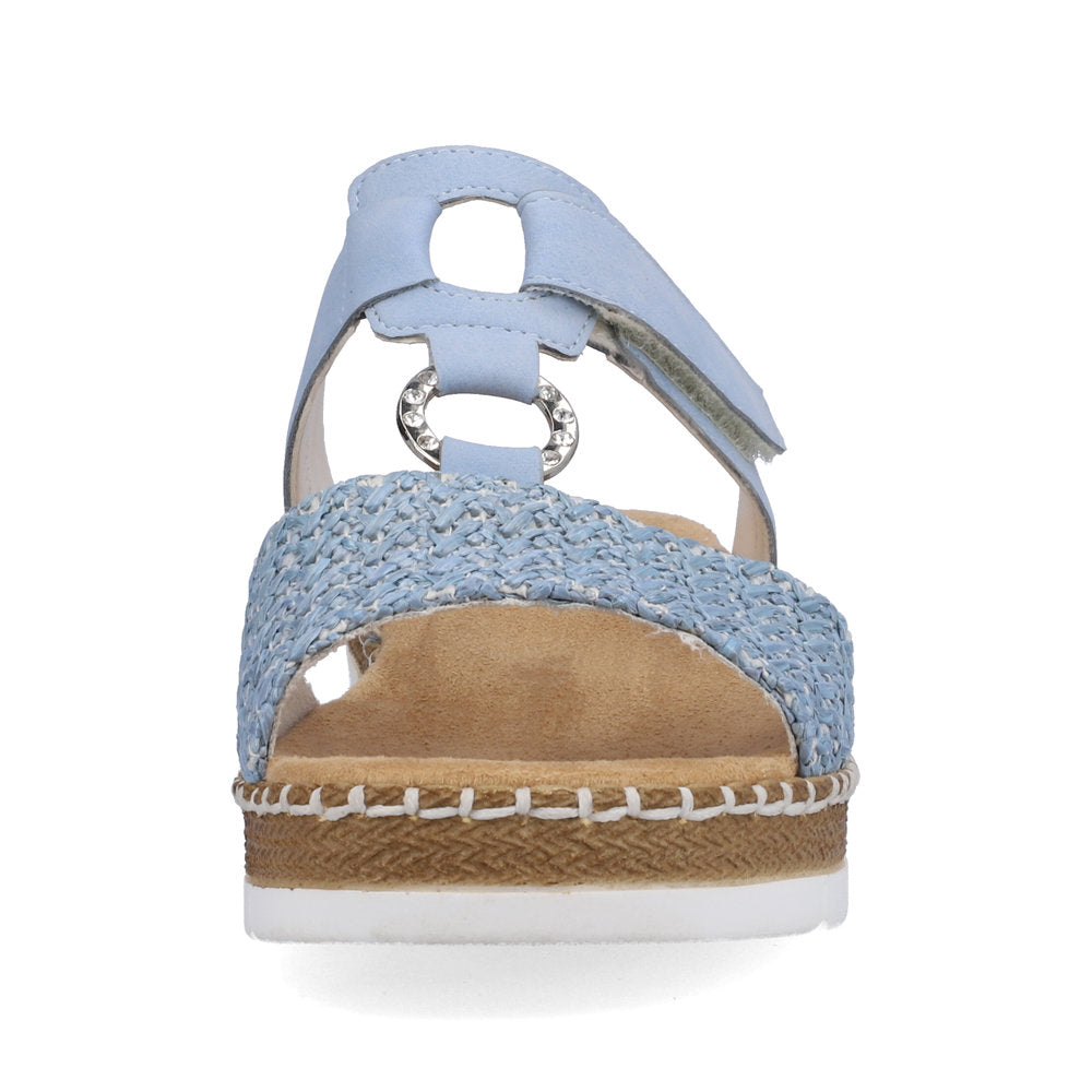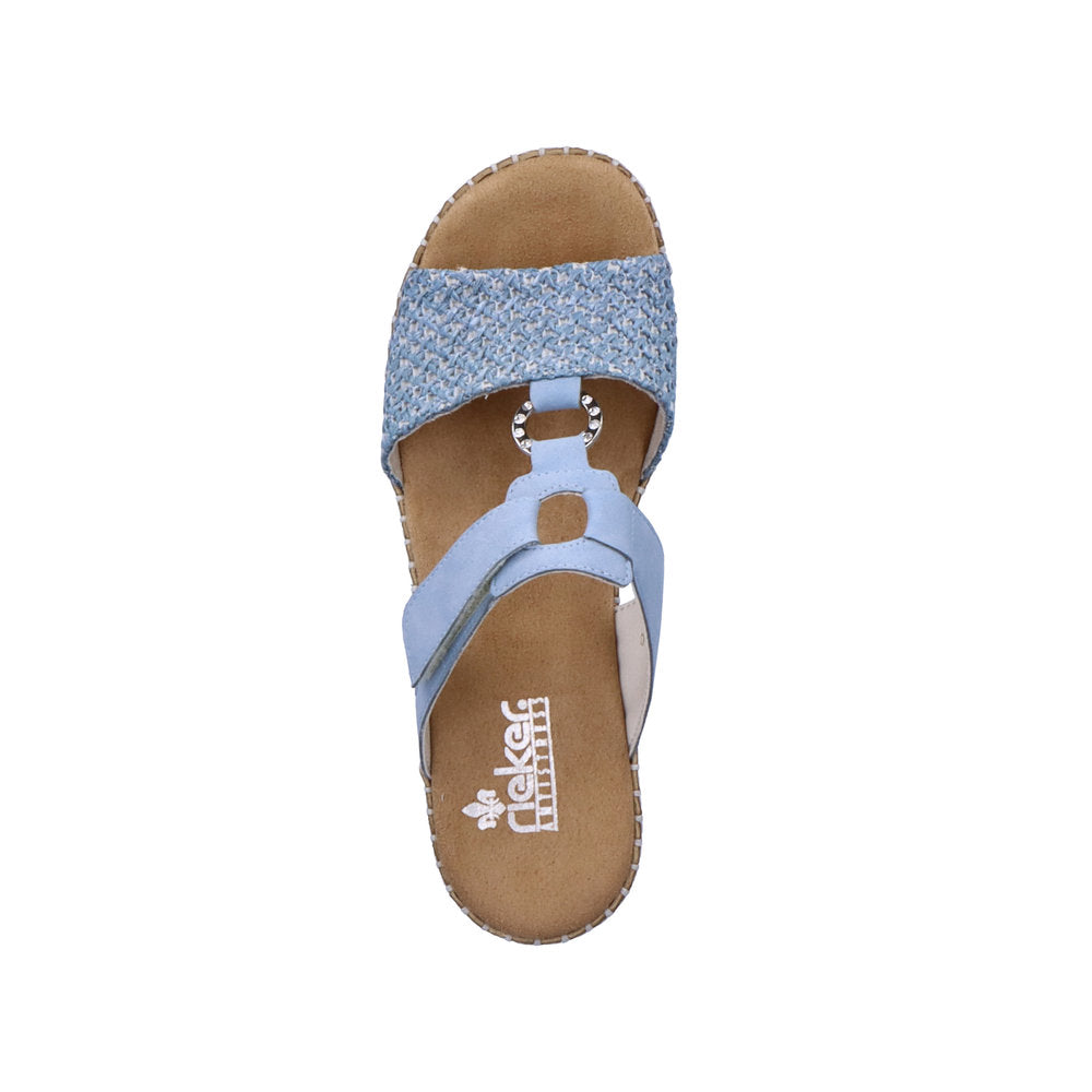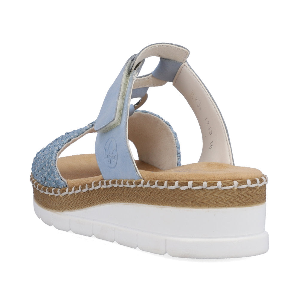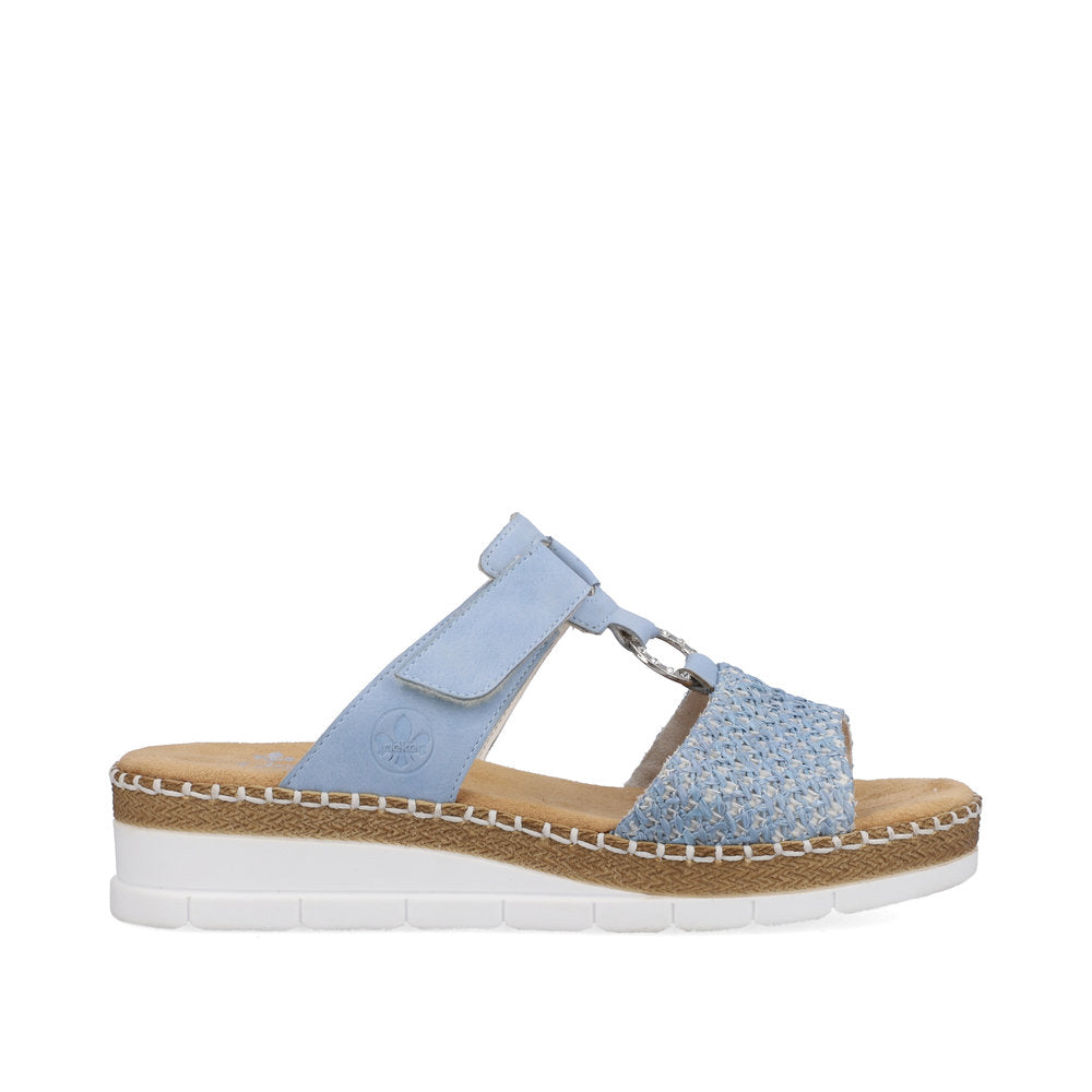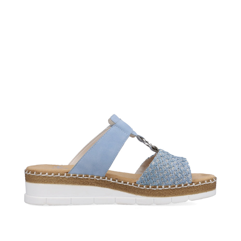 Mules for the win! Go for maximum comfort and ultimate style with these blue Rieker mules. The shoe is constructed in the stitchdown style, which makes it particularly robust and flexible. The mules are put on in no time thanks to a hook and loop fastener. The shock-absorbing and very light sole with wedge heel ensures a pleasant, cushioned feeling with every step, and the extra soft cover sole provides extra comfort. Thanks to the narrow E 1/2 fit, the shoe fits comfortably tight without pinching. Start into summer!