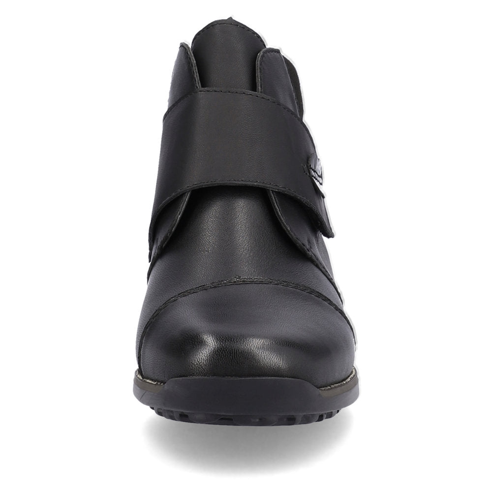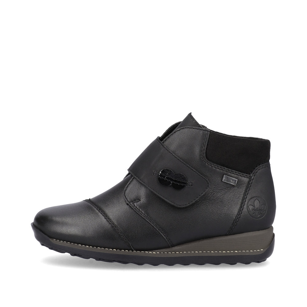 Attention, favourite shoe potential! Keep your feet warm and soft in these cool, night black Rieker ankle boots made of smooth leather. Made with the stitchdown construction, the model is robust, flexible and offers a perfect fit. The ankle boots are put on in no time thanks to a hook and loop fastener. The grippy sole with wedge heel provides good support. Thanks to the narrow E 1/2 fit, the shoe fits comfortably tight without pinching. The cozy and very warm virgin wool lining is guaranteed to keep the feet warm all day long and thanks to the RiekerTEX membrane, they stay dry too! Nothing stands in the way of long walks!