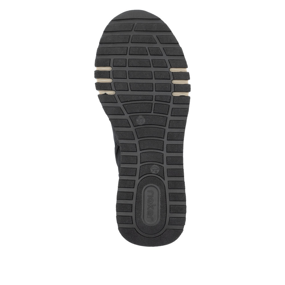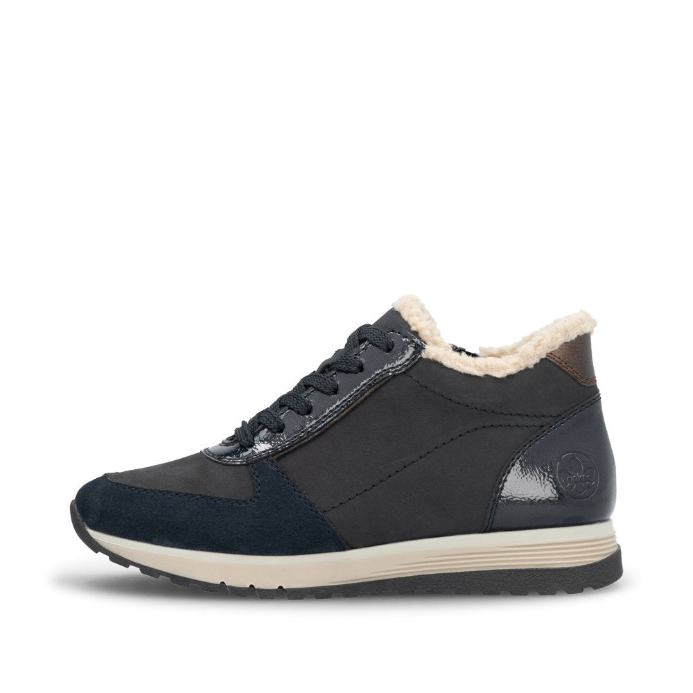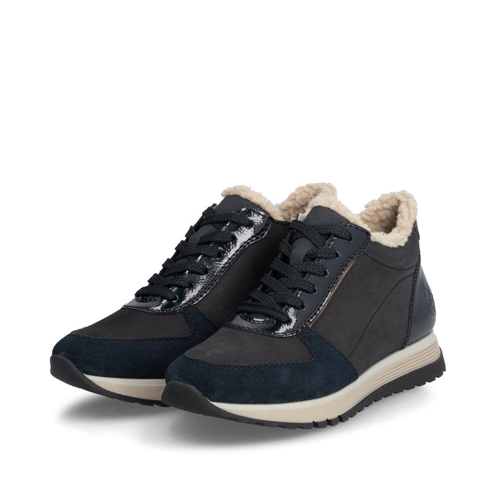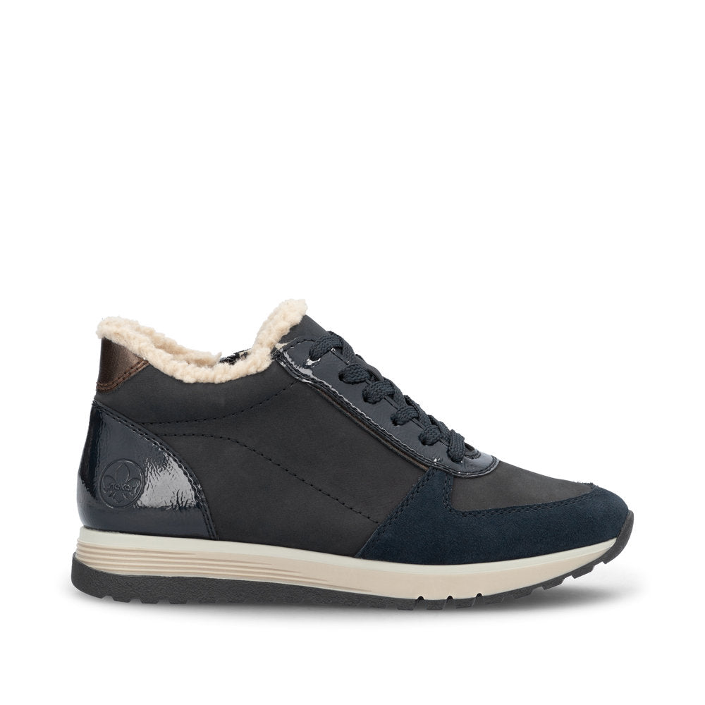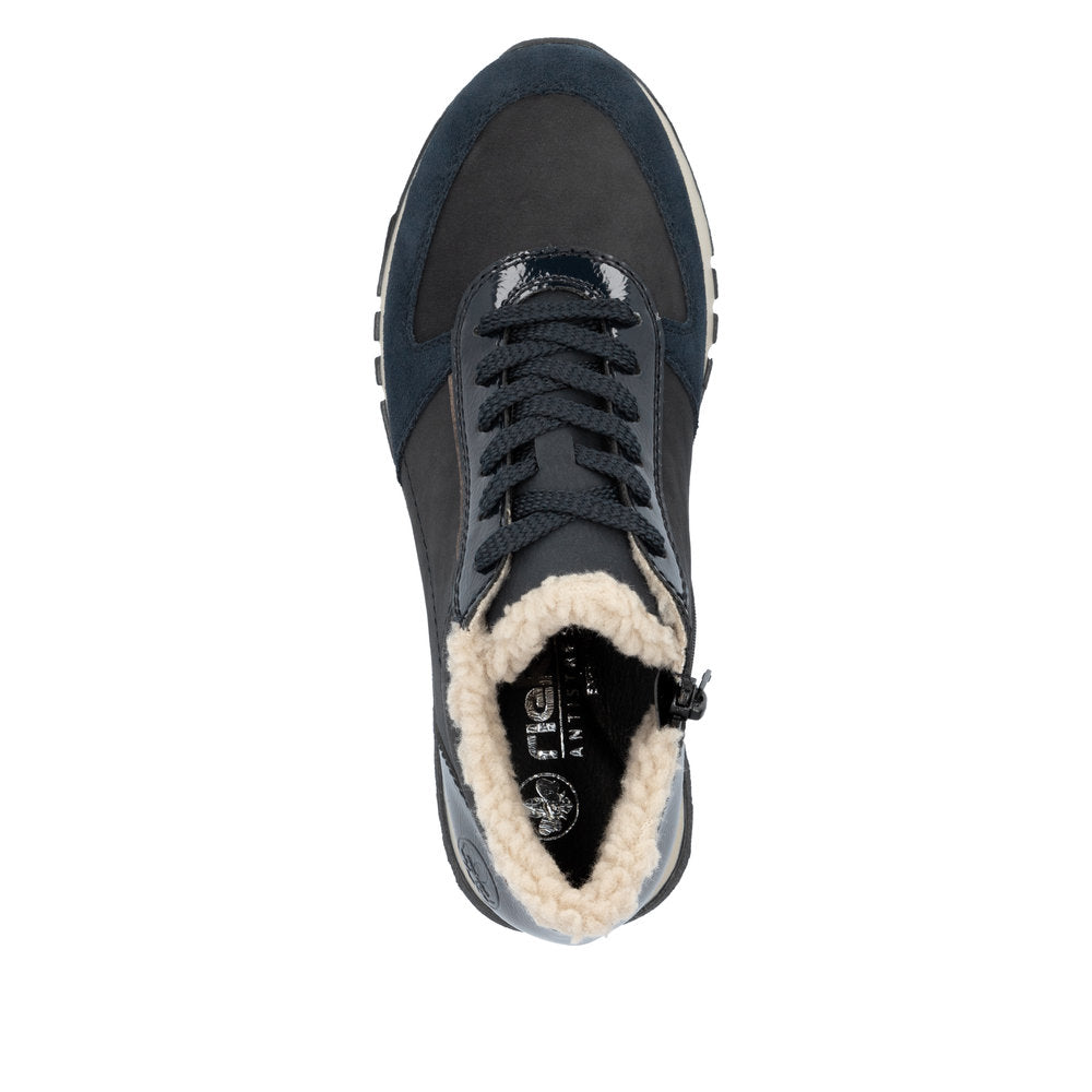 Attention, favourite shoe potential! These navy blue Rieker high-top sneakers are super casual and totally comfortable. The clever combination of lacing and zipper makes it easy to put on and take off the shoe. The furry shaft edge is a real eye-catcher. The grippy sole makes every step a safe affair. The high-top sneakers also score with a padded and removable insole. A feel-good factor on top is the extra width H, which offers more space in the shoe. Sought, found!