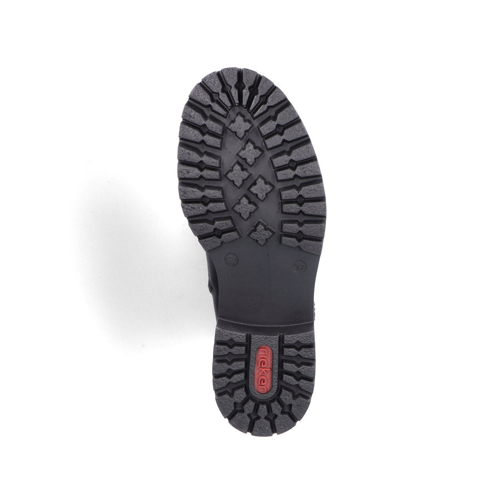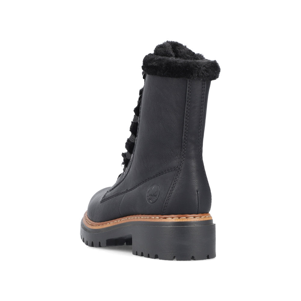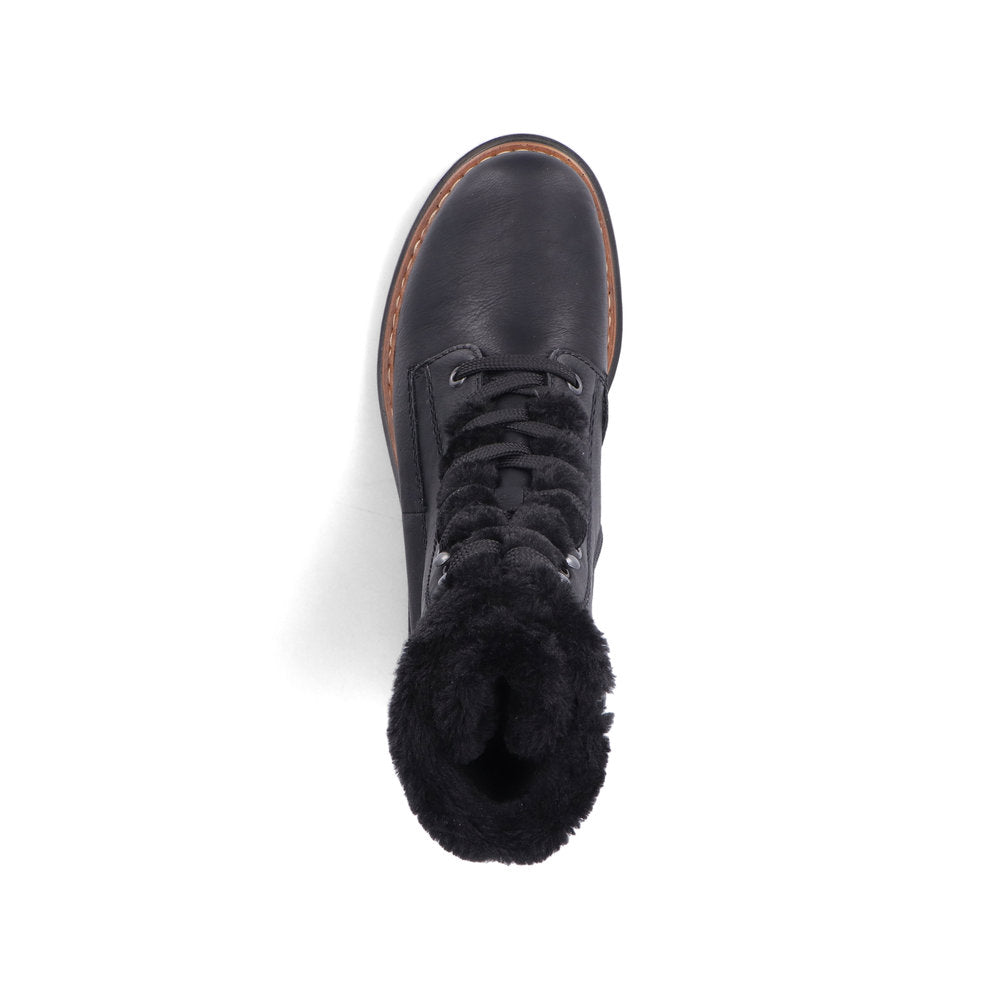 All-time favourite! These casual steel black Rieker lace-up boots are simple and practical. The traditional stitchdown construction makes the shoe particularly flexible and robust and ensures a great fit. Despite the lacing, the shoe can be easily closed by the zipper. The furry shaft edge is a real eye-catcher. The shock-absorbing and light sole with block heel also pampers the feet at every step. On top of that, the extra soft cover sole provides an extra portion of comfort. Your feet are guaranteed to stay warm all day long thanks to the soft warm lining. Let's rock the cold days!
