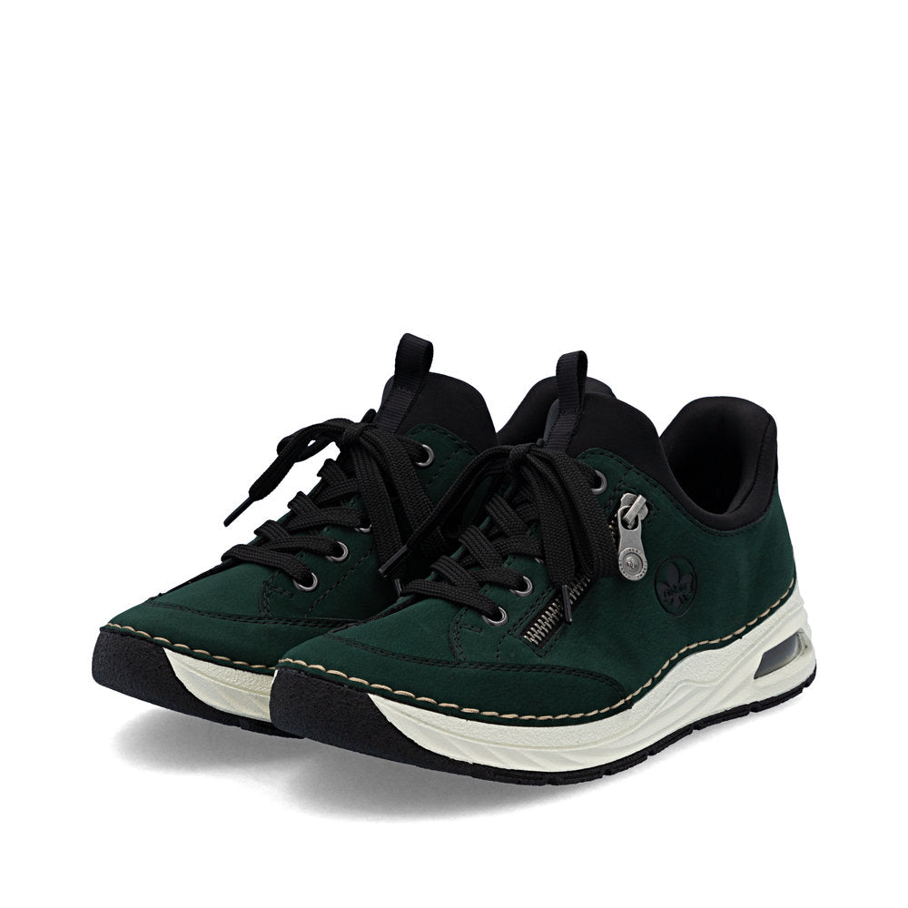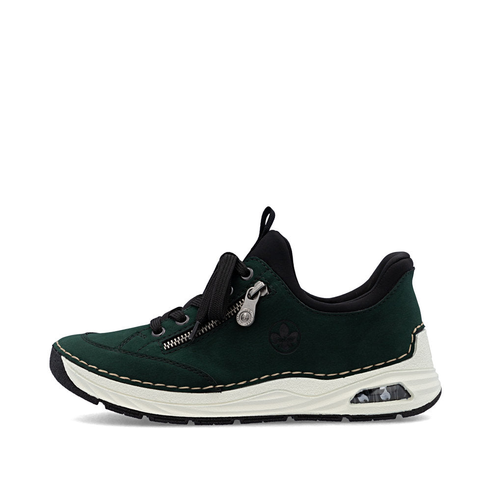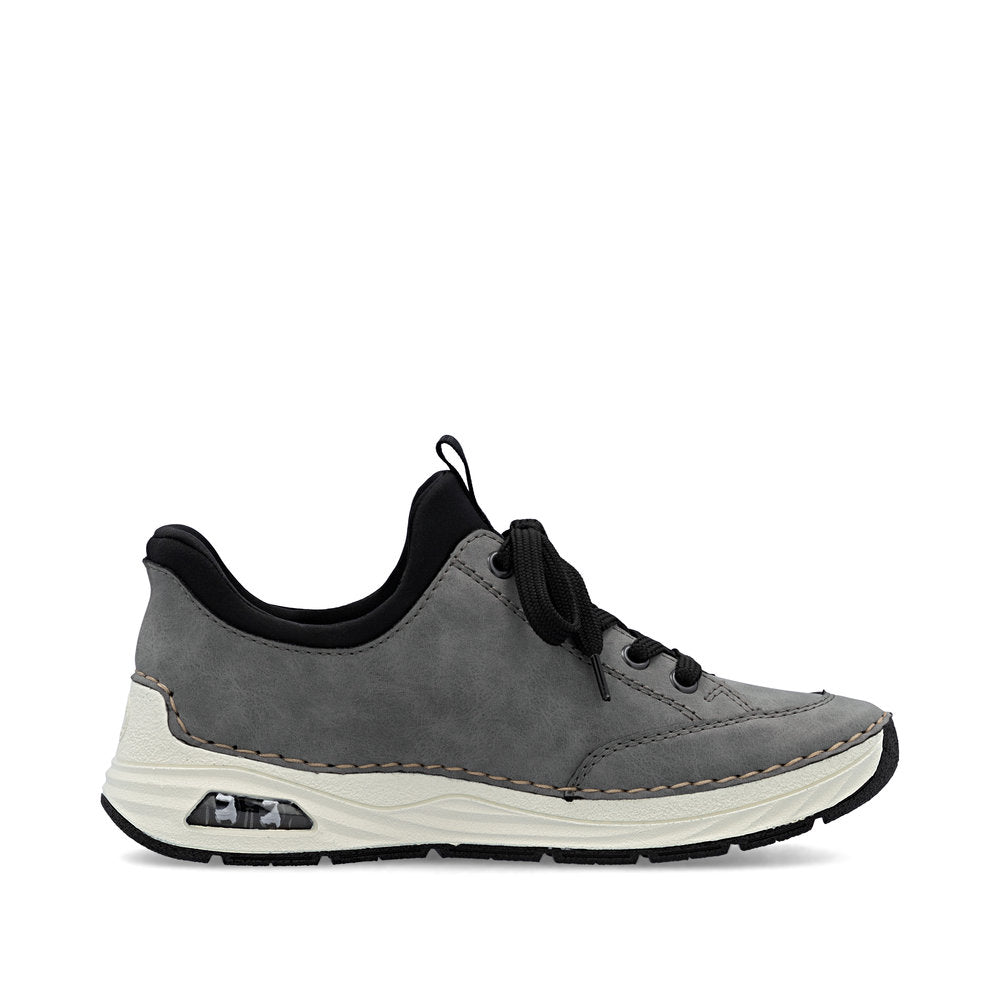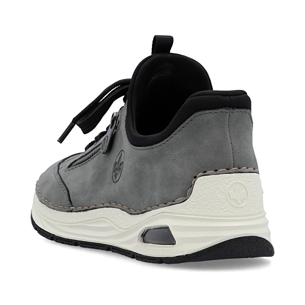 Ready2GO! These grey black Rieker shoes impress with real comfort for your feet. The stitchdown construction makes this shoe a particularly durable and flexible companion. The elastic band makes the shoe especially easy to put on and take off. The shock-absorbing and light sole ensures a pleasant wearing sensation. Another plus is the extra soft cover sole. The Rieker Air window in the rear part of the sole cushions steps, while the Ready2GO function guarantees that you can slip into them in seconds. Well-being included!