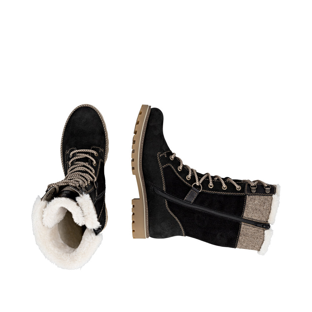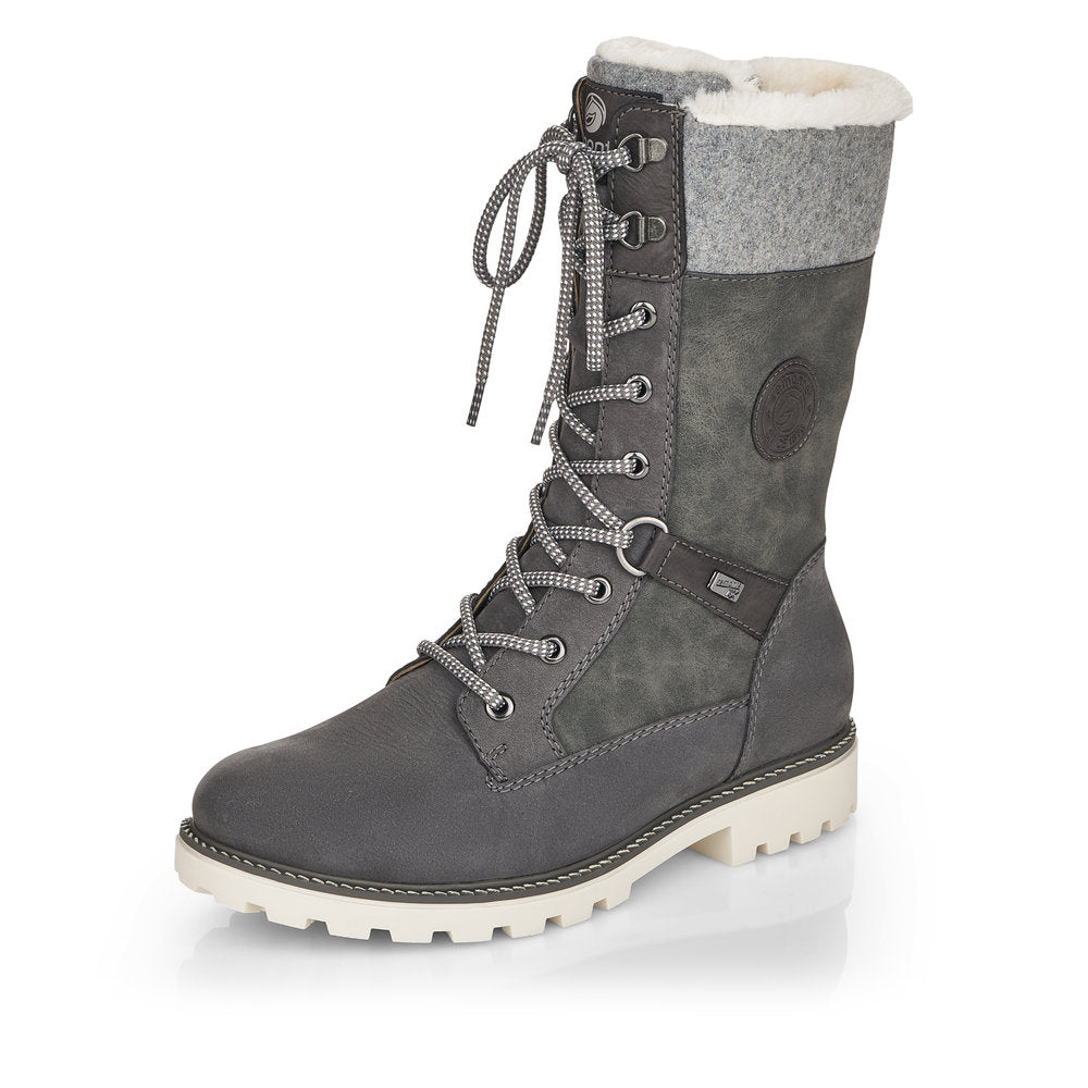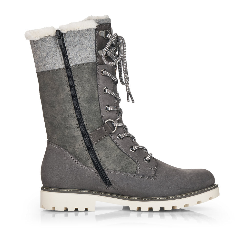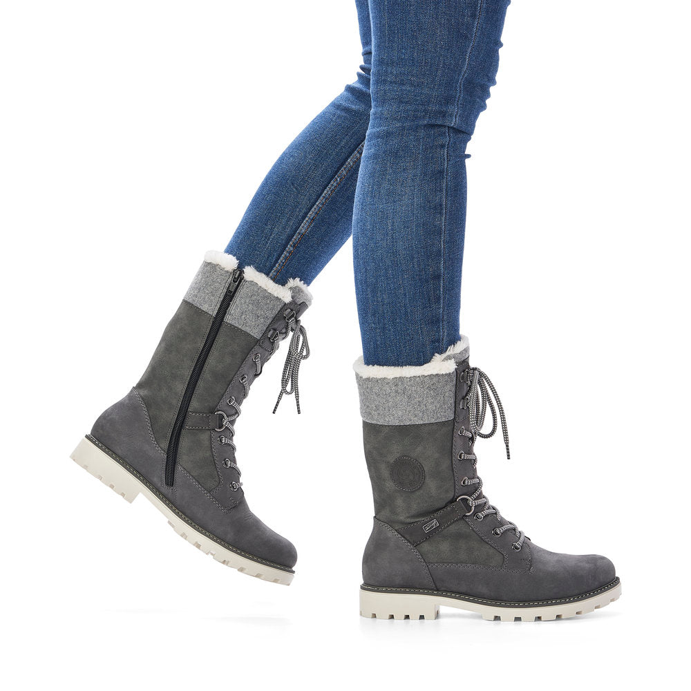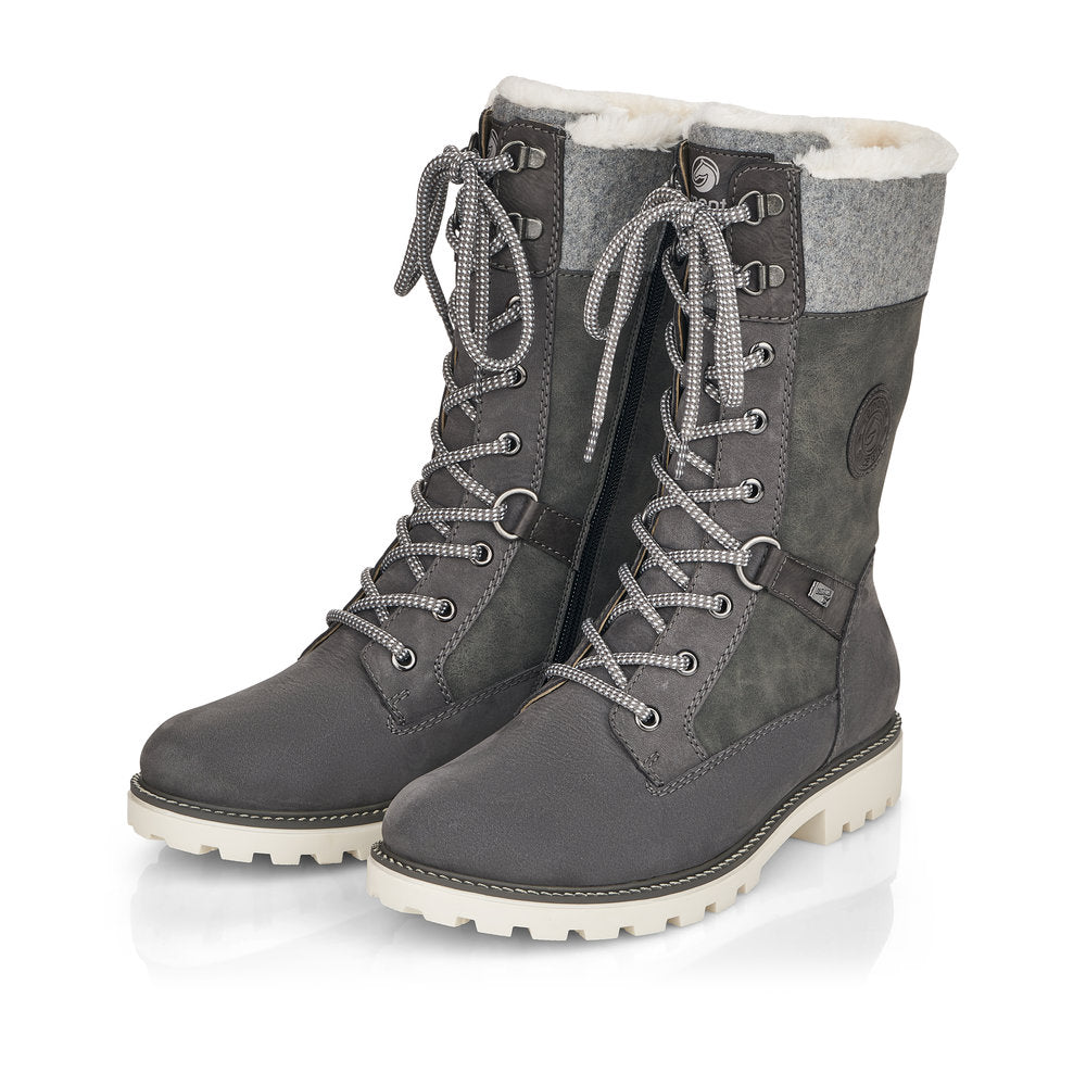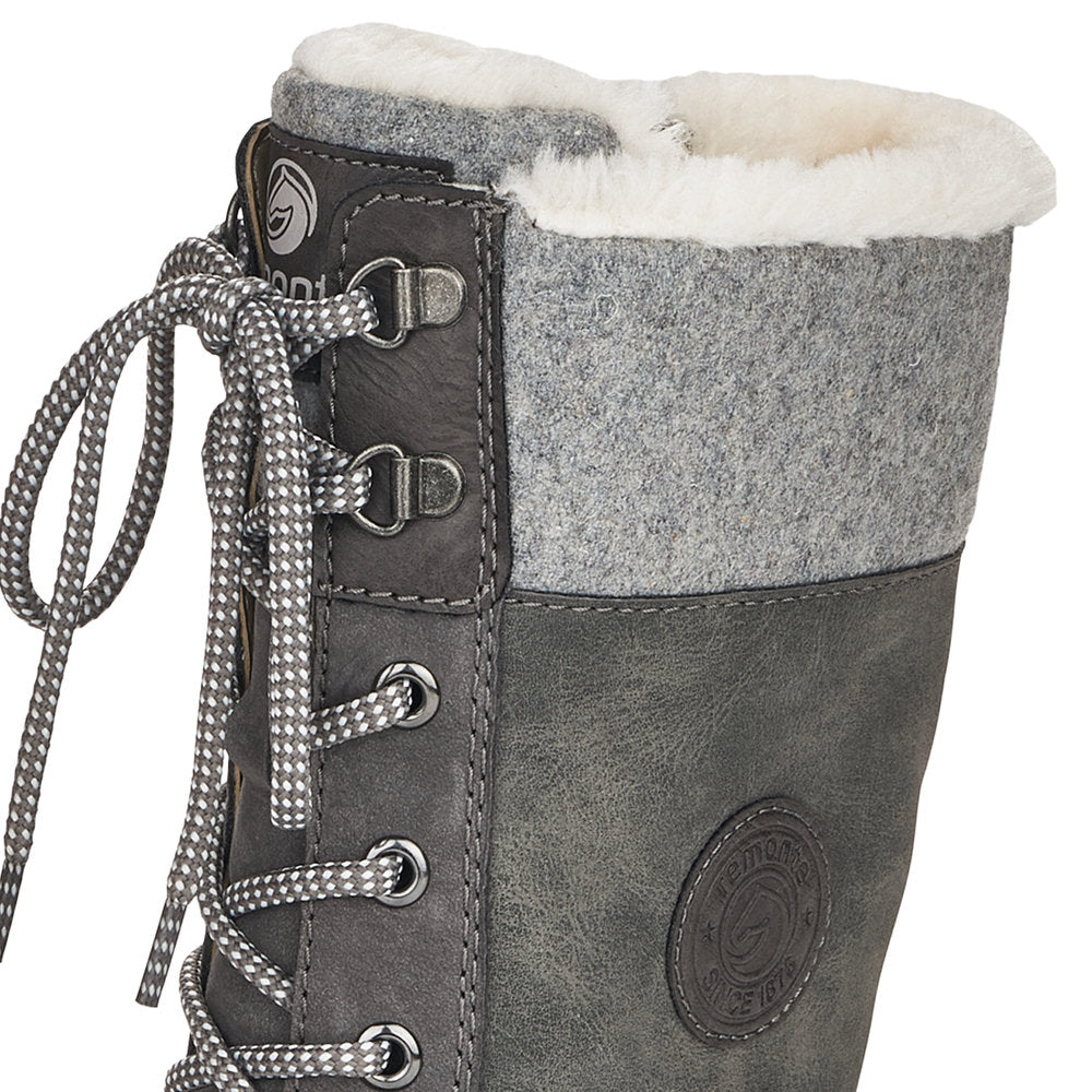 Cold feet are a thing of the past! With these grey remonte lace-up boots made of suede leather you can show up anywhere! Despite the lacing, the shoe can be easily closed by the zipper. The shaft collar in felt look effectively freshens up the design. The flexible and cushioning sole provides good support. Moreover, the comfort width offers your feet more freedom of movement in the forefoot area. The water-repellent surface of the shoes offers optimal weather protection and the thermal insole features protection against the cold. Cozy and very warm virgin wool makes these boots the perfect companions no matter when, no matter where! True to the motto comfort meets style!