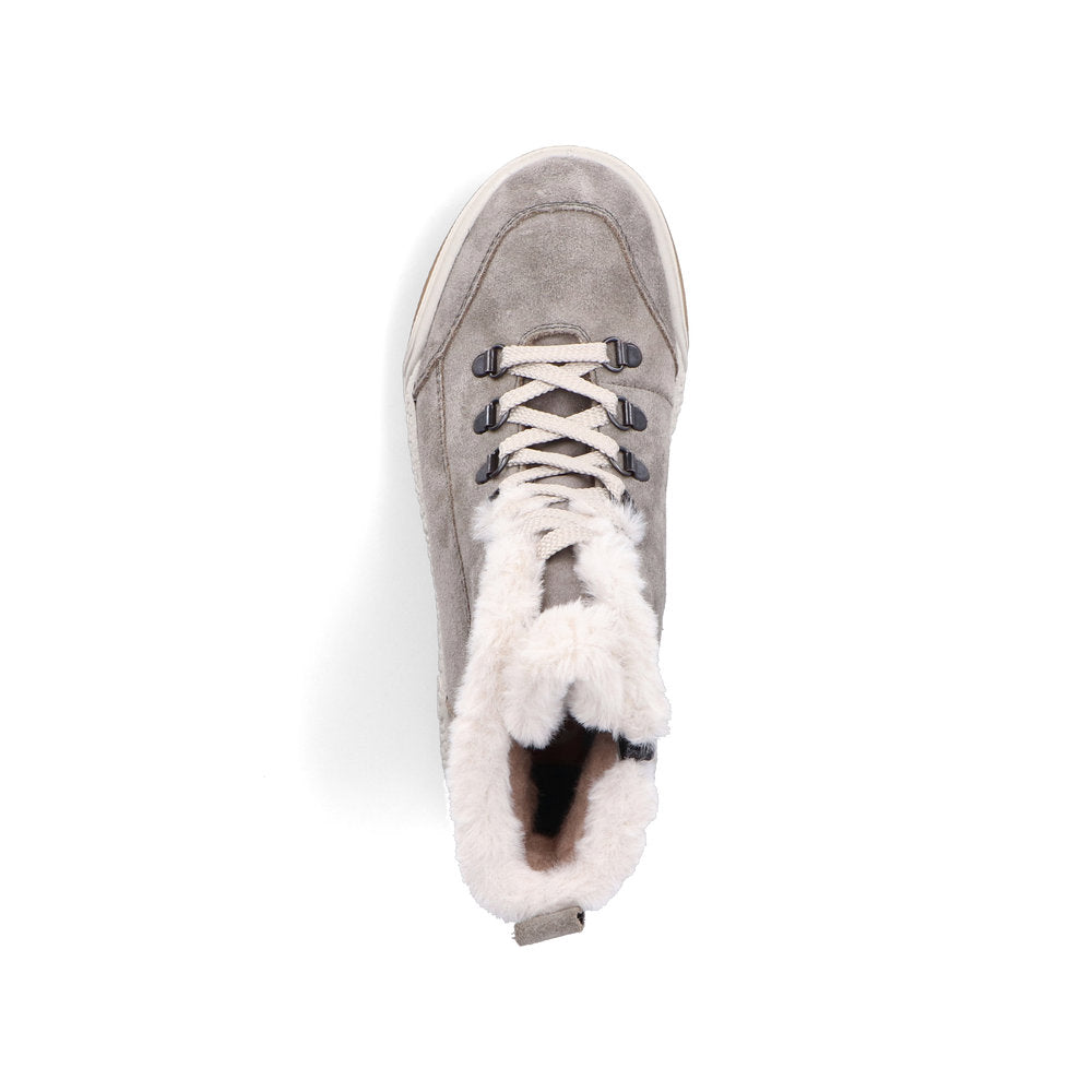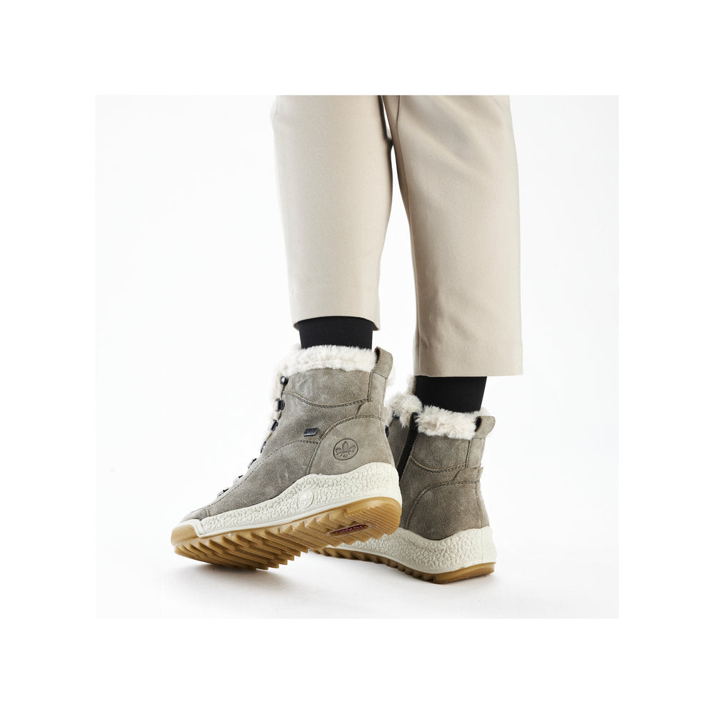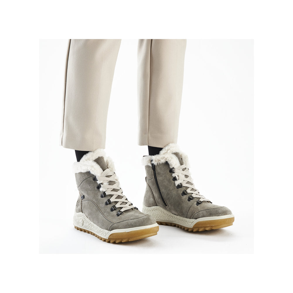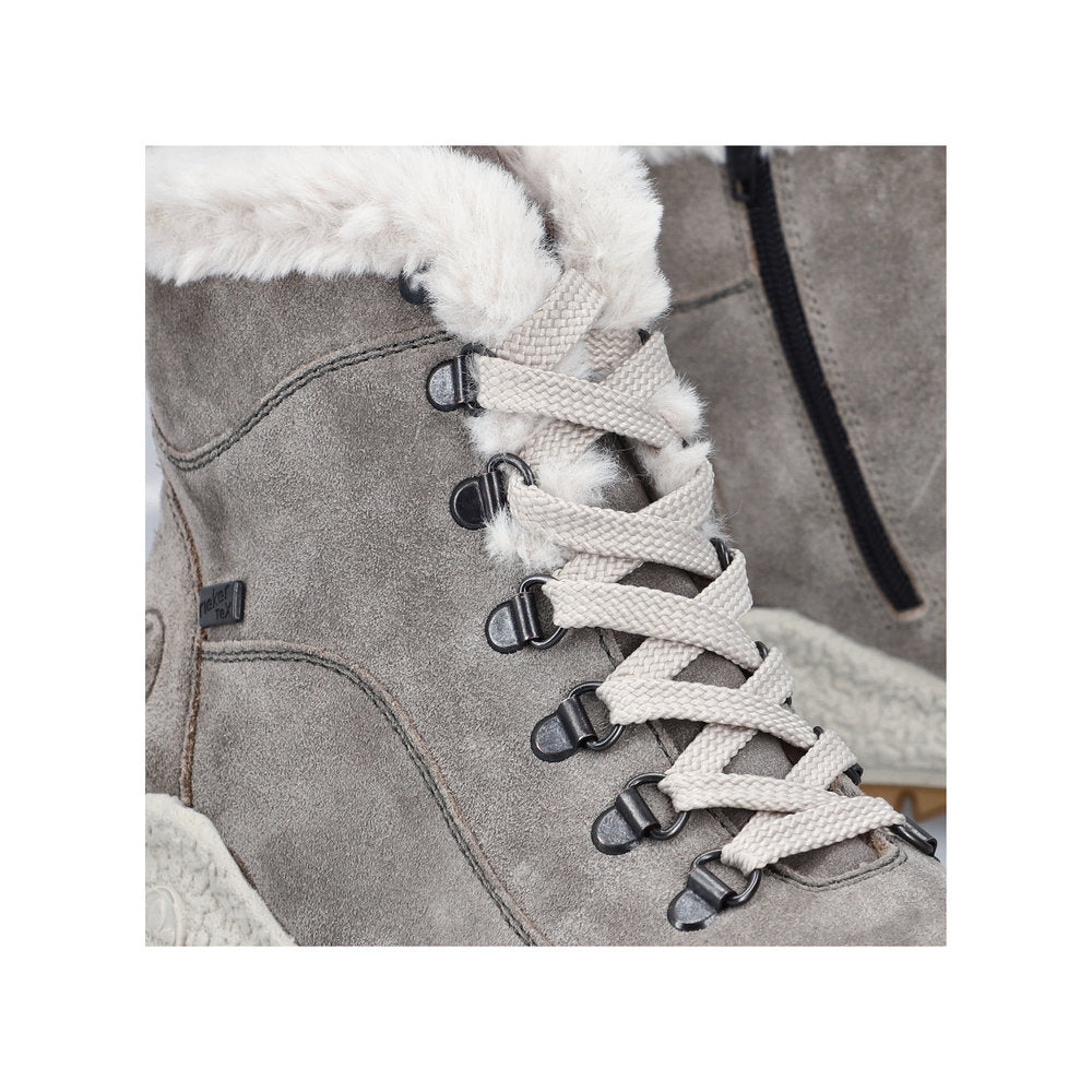 Introducing your new favourite shoe! These stone grey Rieker lace-up boots made of suede leather are stylish, comfortable and functional for cold days. Despite the lacing, the shoe can be easily closed by the zipper. The furry shaft edge is a real eye-catcher. The shock-absorbing and light sole ensures a pleasant wearing sensation. The cover sole is also extra soft. The comfort width G offers enough space for the feet to feel comfortable even when worn for longer periods. You are also one step ahead in terms of comfort with the water-repellent RiekerTEX membrane and the cozy and moisture-regulating genuine merino wool lining. Well-being included!