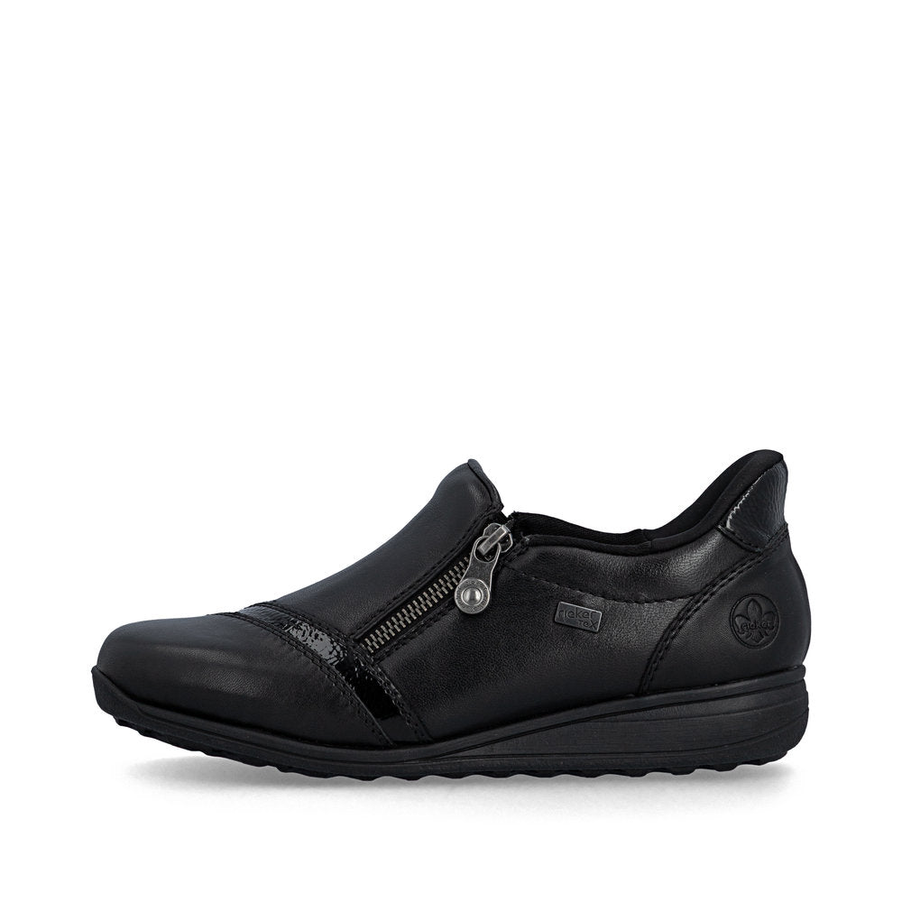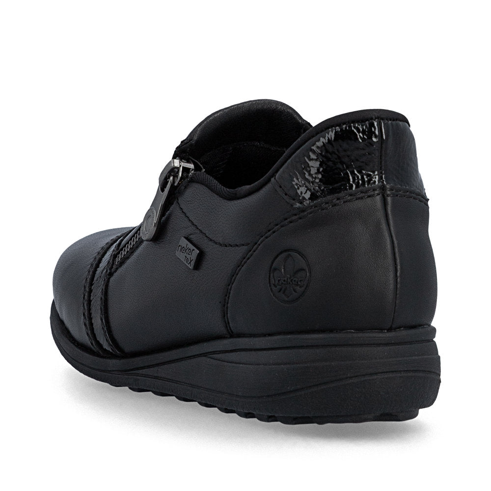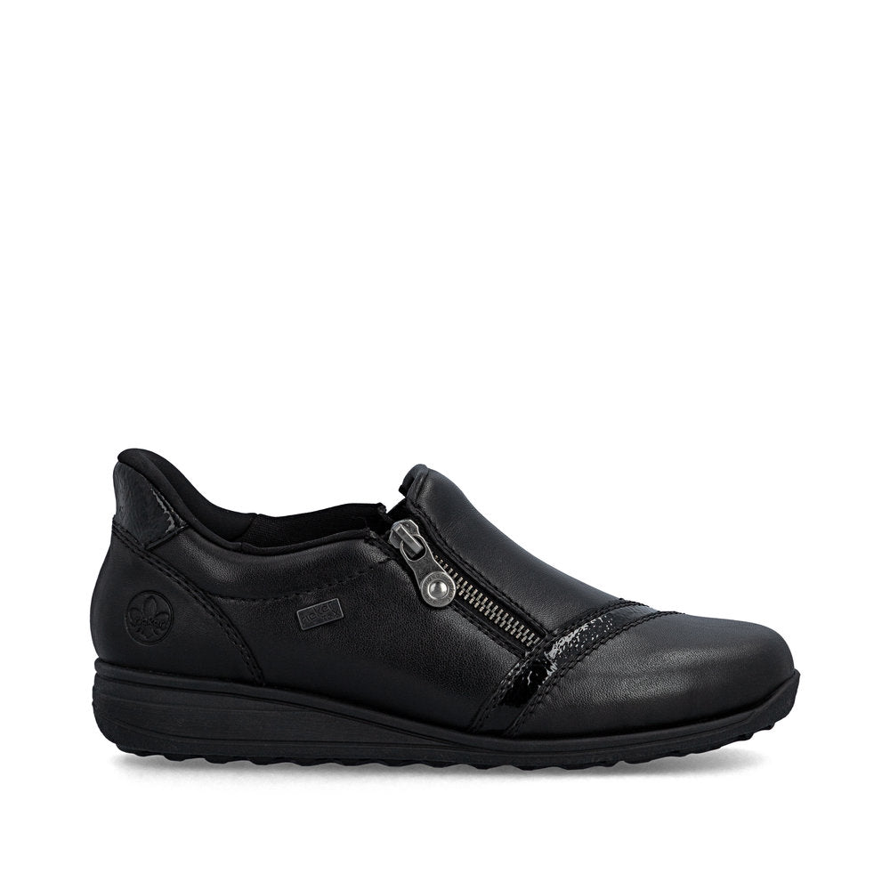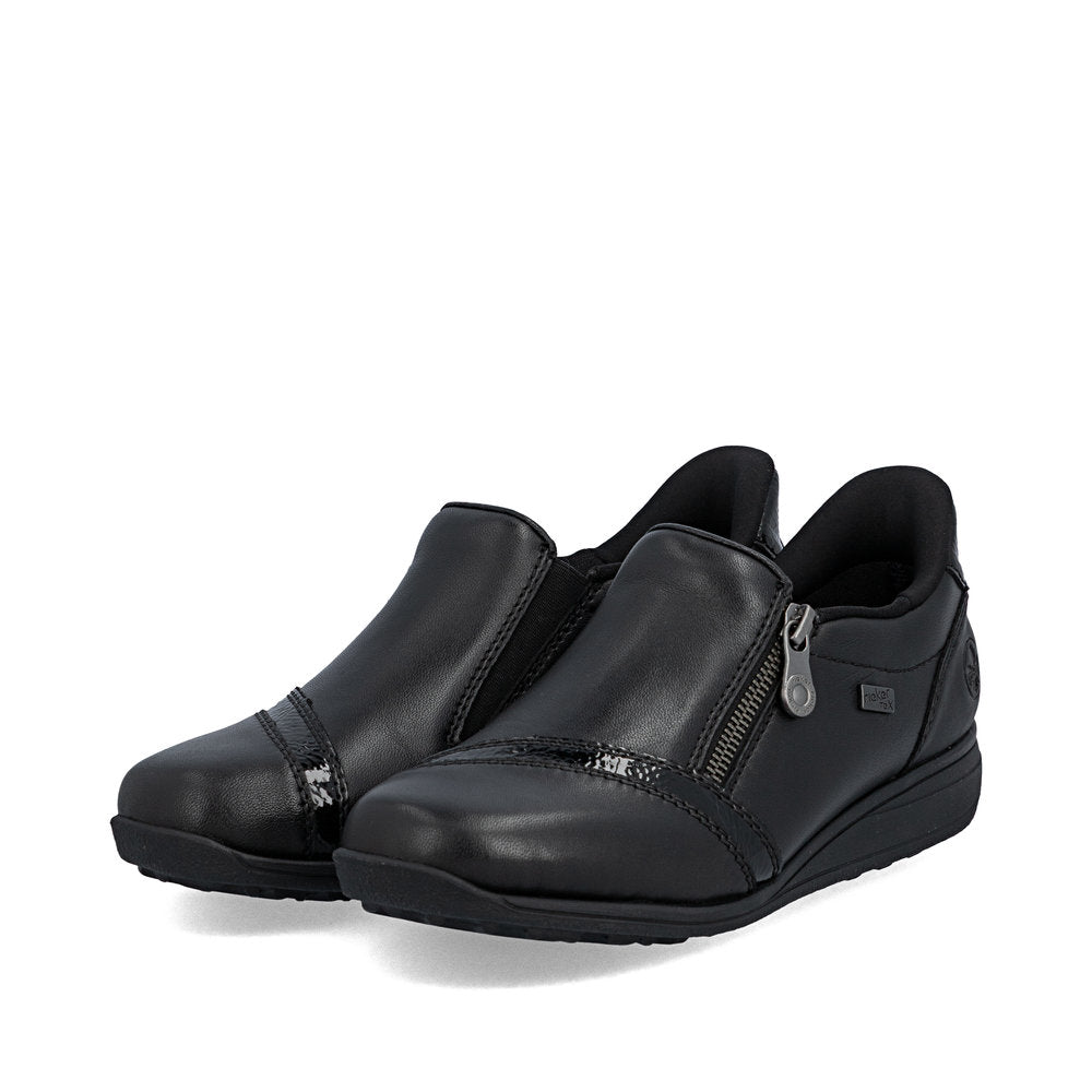 Wow factor! This black Rieker slipper made of smooth leather is not just any Rieker slipper! The zipper allows for the shoe to be put on very quickly. The grippy sole with wedge heel provides good traction. The slippers also score with a padded and removable insole. The extra width offers the perfect amount of freedom of movement for the toes. The combination of the water-repellent RiekerTEX membrane and the dimensionally stable Ready2GO feature makes this shoe particularly practical. Slip them on and enjoy your new Riekers.