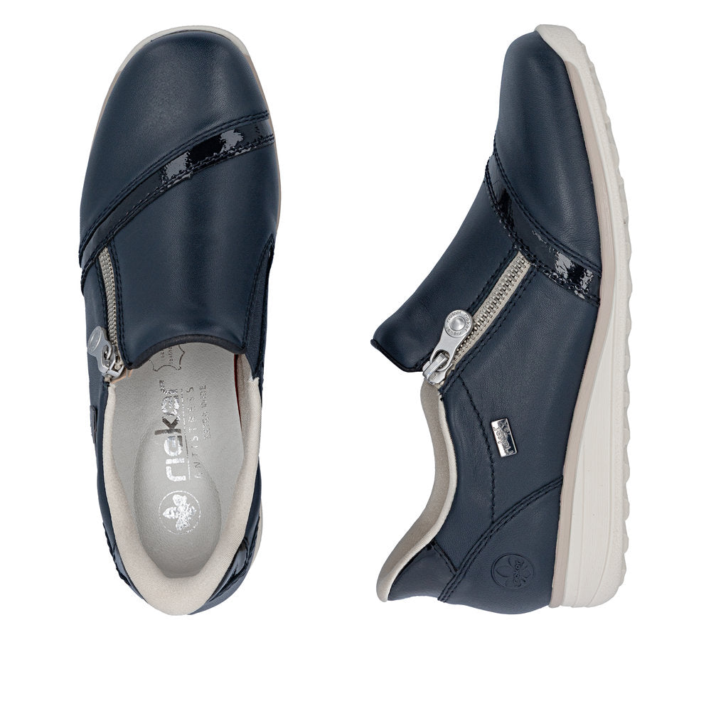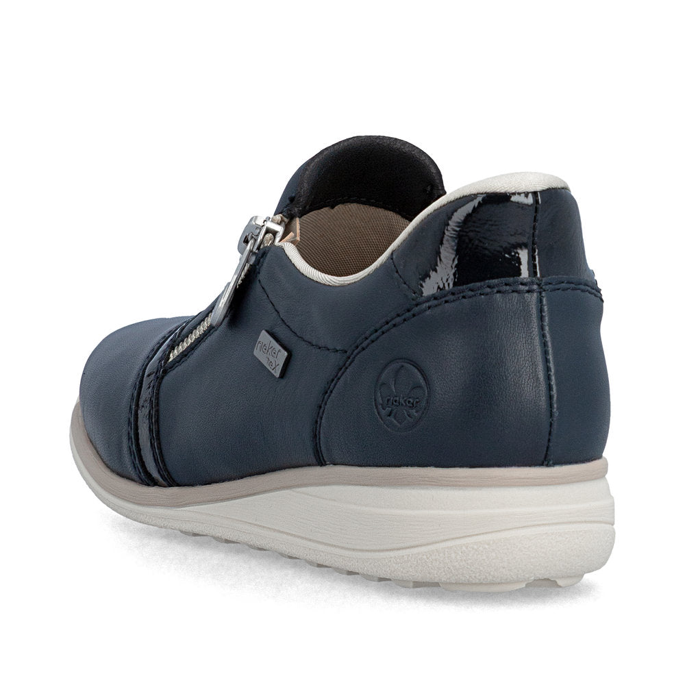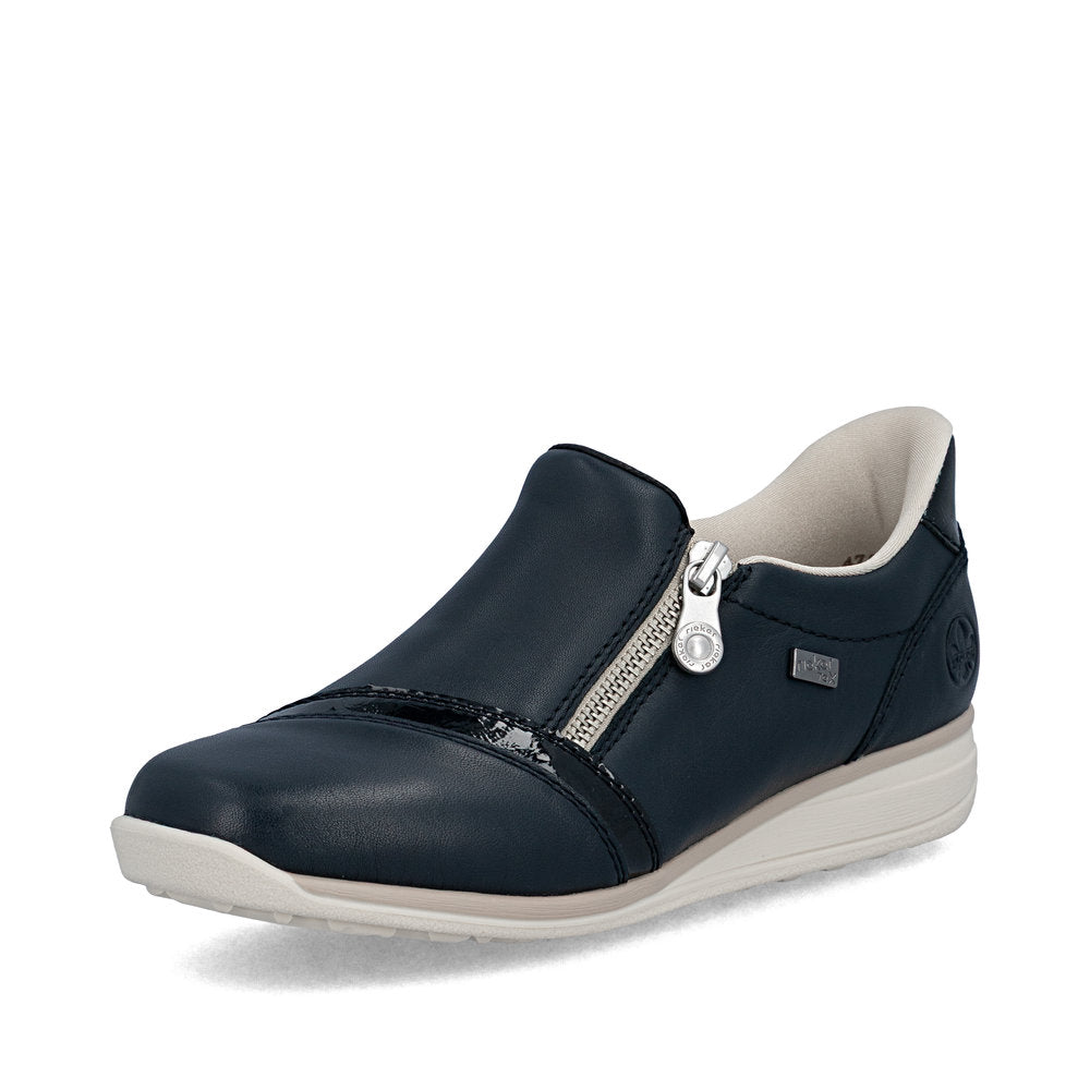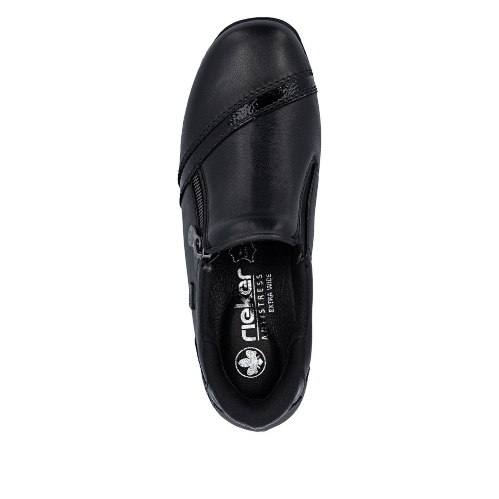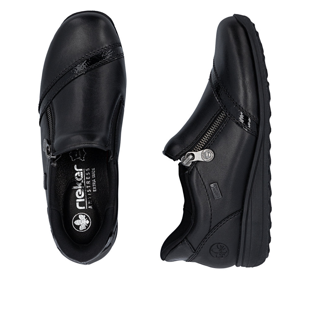 Wow factor! This black Rieker slipper made of smooth leather is not just any Rieker slipper! The zipper allows for the shoe to be put on very quickly. The grippy sole with wedge heel provides good traction. The slippers also score with a padded and removable insole. The extra width offers the perfect amount of freedom of movement for the toes. The combination of the water-repellent RiekerTEX membrane and the dimensionally stable Ready2GO feature makes this shoe particularly practical. Slip them on and enjoy your new Riekers.