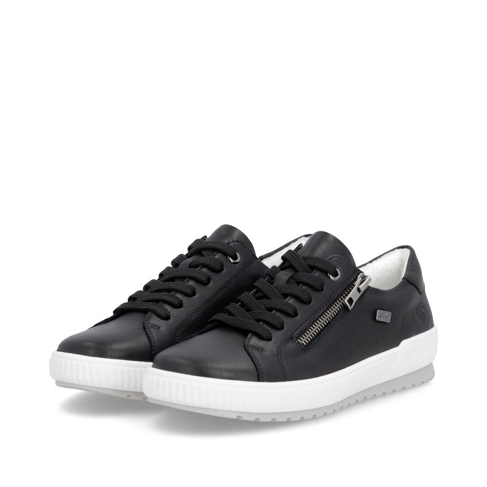 Zip it! Simple, elegant and perfect for you: these remonte lace-up shoes made of smooth leather in trendy black. Despite the lacing, the shoe can be easily closed by the zipper. The cushioning and flexible sole, together with the padded and removable insole, ensures every step to be pleasantly cushioned. Thanks to the comfort width, the shoe not only offers enough space in the forefoot area, it is also available in extended sizes. The water-repellent remonteTEX membrane protects the feet from wetness and wind. Give your look that special touch!