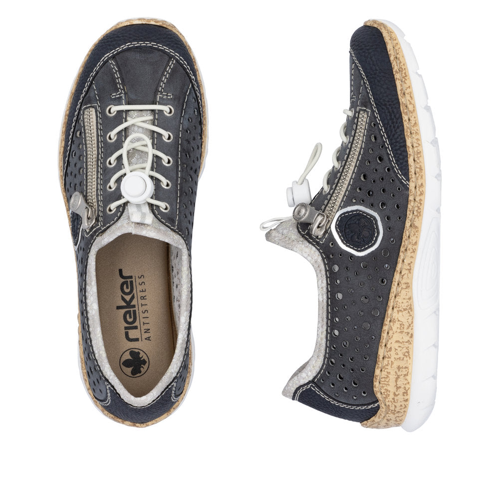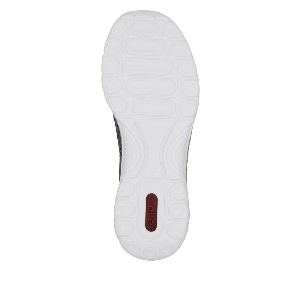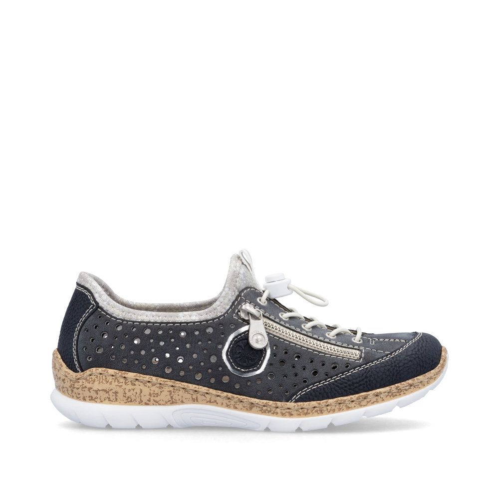 Favourite shoe potential! These blue Rieker slippers combine classic style with all-day comfort. The stitchdown construction makes this shoe robust and the sole particularly flexible. In addition to the elastic band, this shoe has an elastic lacing, which makes it twice as easy to put on. The decorative zipper provides the perfect finish and a striking look. The light and shock-absorbing sole with wedge heel ensures a pleasant walking experience even when worn for long periods of time, and the MemoSoft cover sole is extra soft. Your perfect match for the new season!