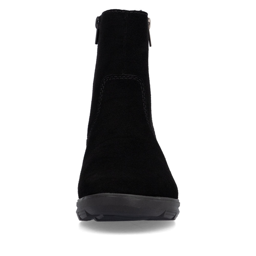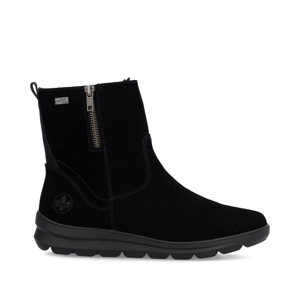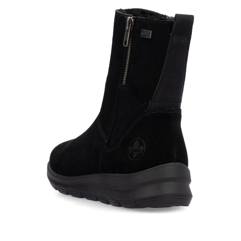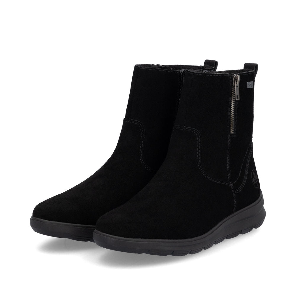 Chaudes, douces et imperméables ! Ces bottines Rieker décontractées en daim noir de jais sont simples et pratiques. La fermeture éclair facilite l'enfilage et le retrait. La semelle adhérente assure une bonne stabilité sur tous les chemins. La semelle intérieure rembourrée et amovible offre un confort optimal et une fonctionnalité raffinée. La doublure chaude et moelleuse offre une protection durable contre le froid, tandis que la tige imperméable protège efficacement de l'humidité et du vent. Plus rien ne vous empêche de longues promenades !