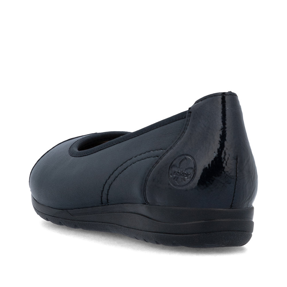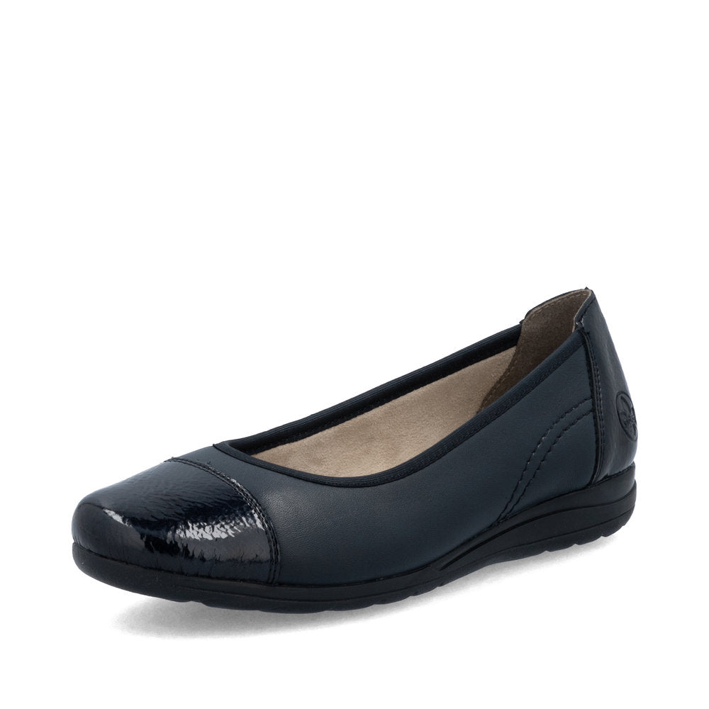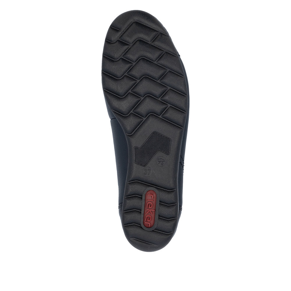 Elles vous suivent partout ! Ces ballerines Rieker bleu foncé en cuir lisse offrent un confort optimal. Sans fermeture, elles s'enfilent rapidement. Grâce à leur semelle adhérente, une marche sûre est un jeu d'enfant, tandis que leur semelle extra-souple assure un confort optimal. Un pur luxe !