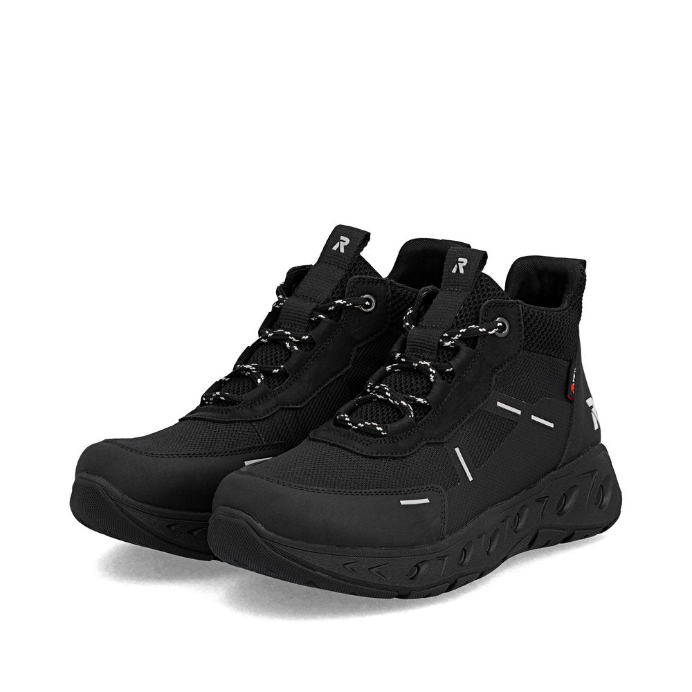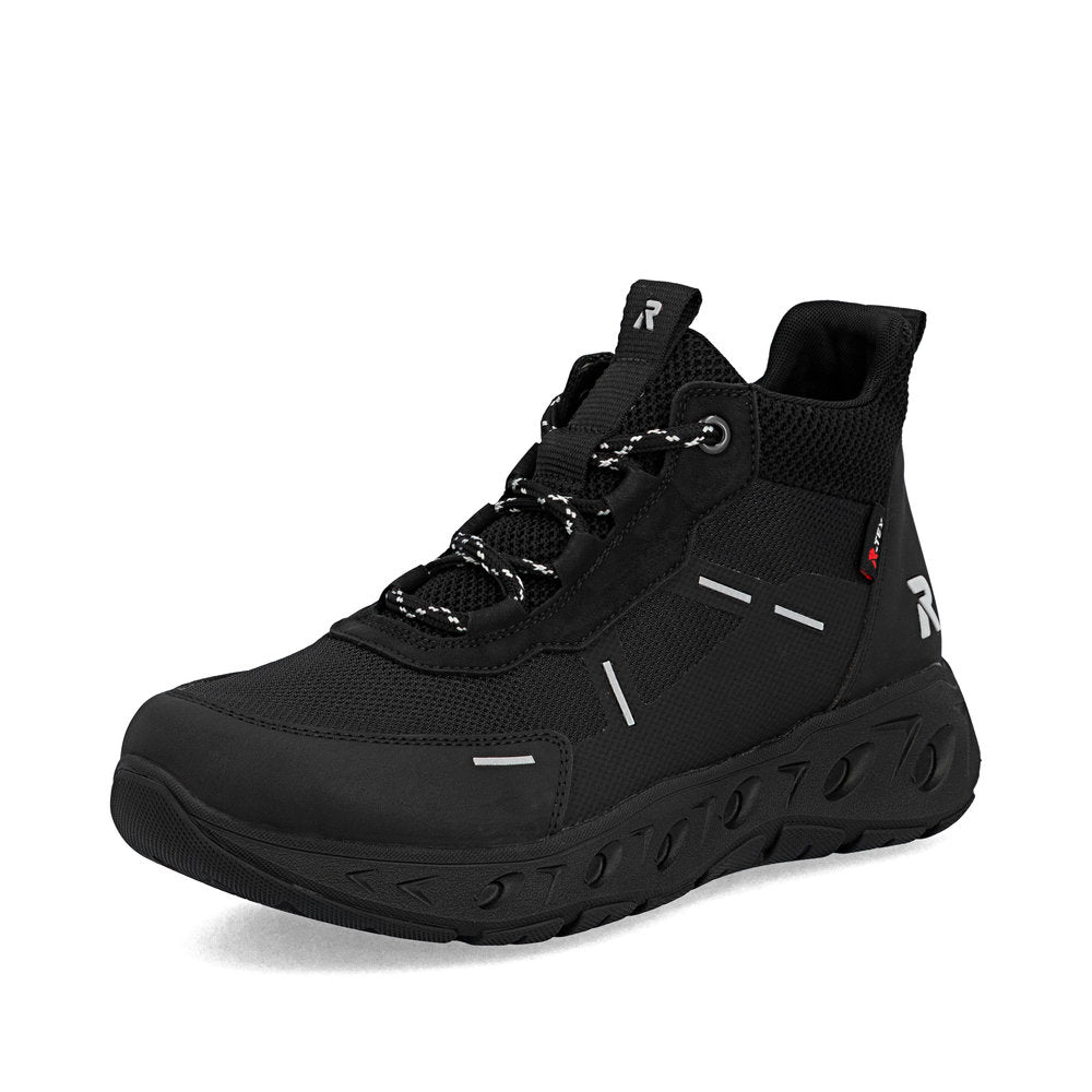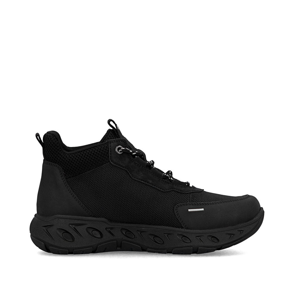 Baskets montantes Rieker noires en textile de qualité. Marchez protégé grâce à la membrane RiekerTEX imperméable et respirante. La semelle de propreté extra-souple MemoSoft épouse parfaitement la forme du pied grâce à sa mousse. Ajustement parfait grâce à sa largeur confortable.