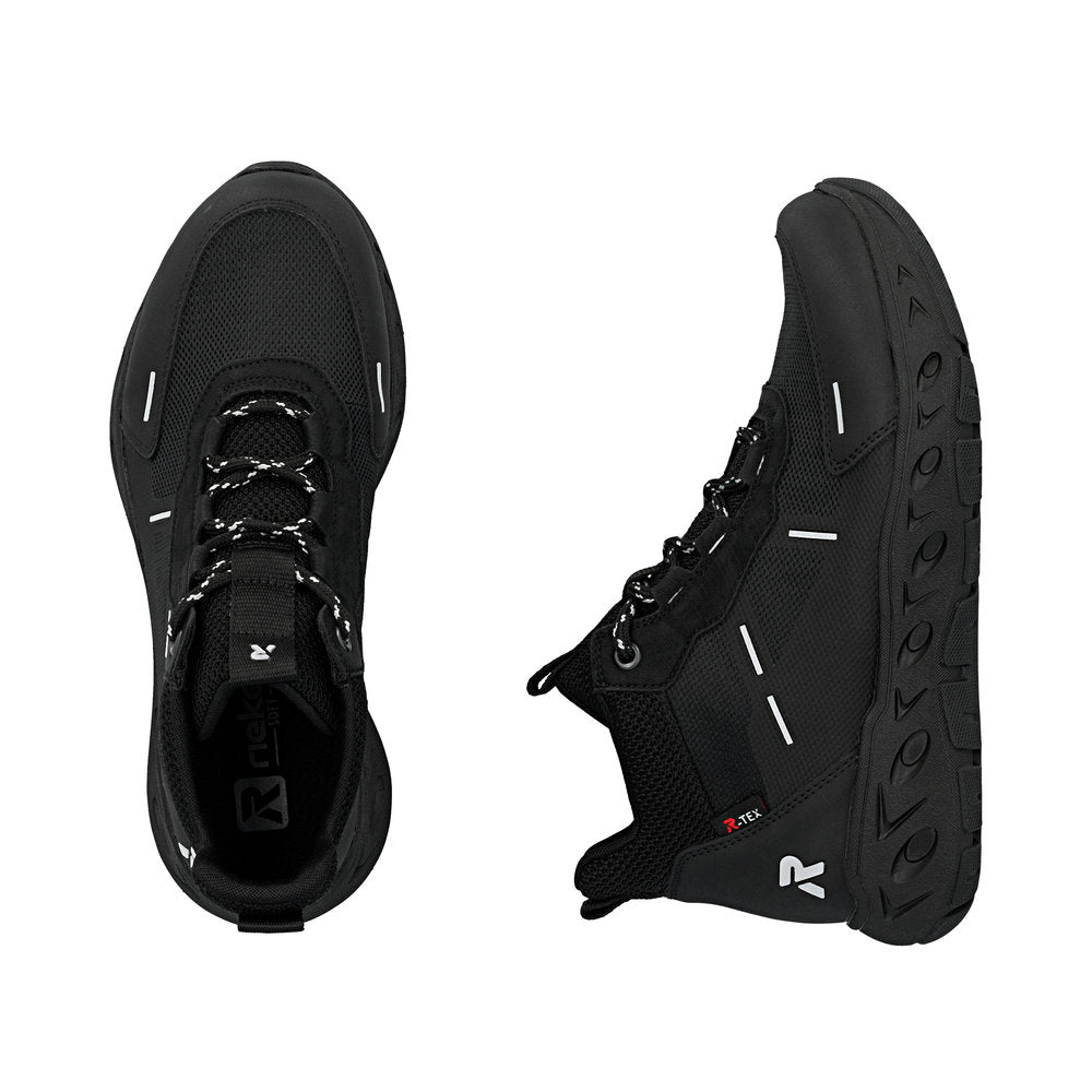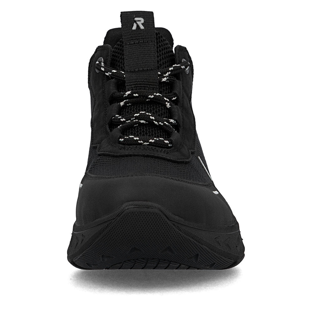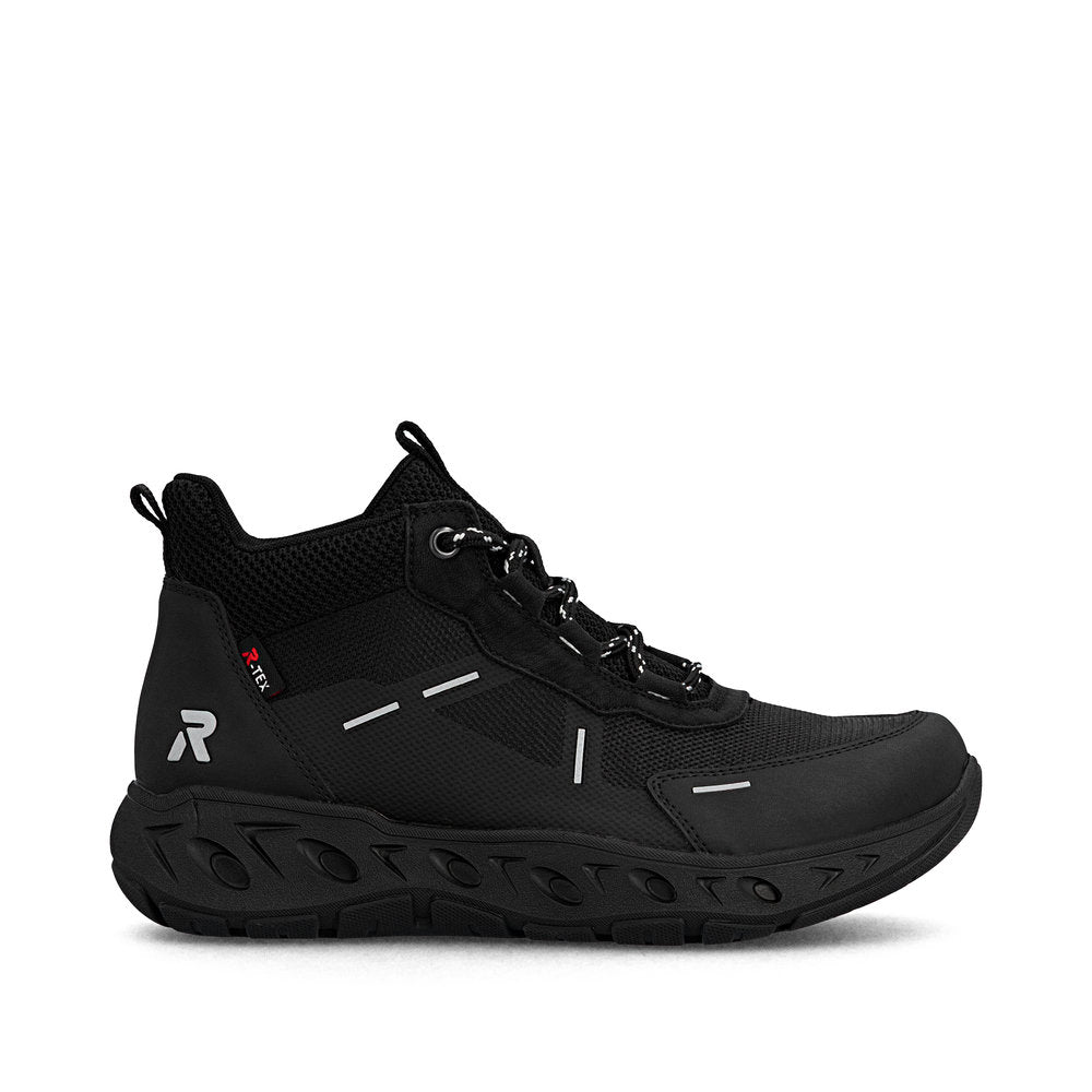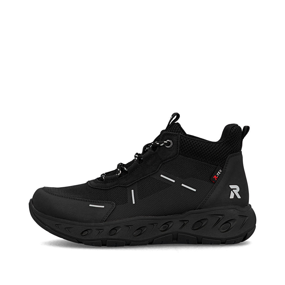 Baskets montantes Rieker noires en textile de qualité. Marchez protégé grâce à la membrane RiekerTEX imperméable et respirante. La semelle de propreté extra-souple MemoSoft épouse parfaitement la forme du pied grâce à sa mousse. Ajustement parfait grâce à sa largeur confortable.