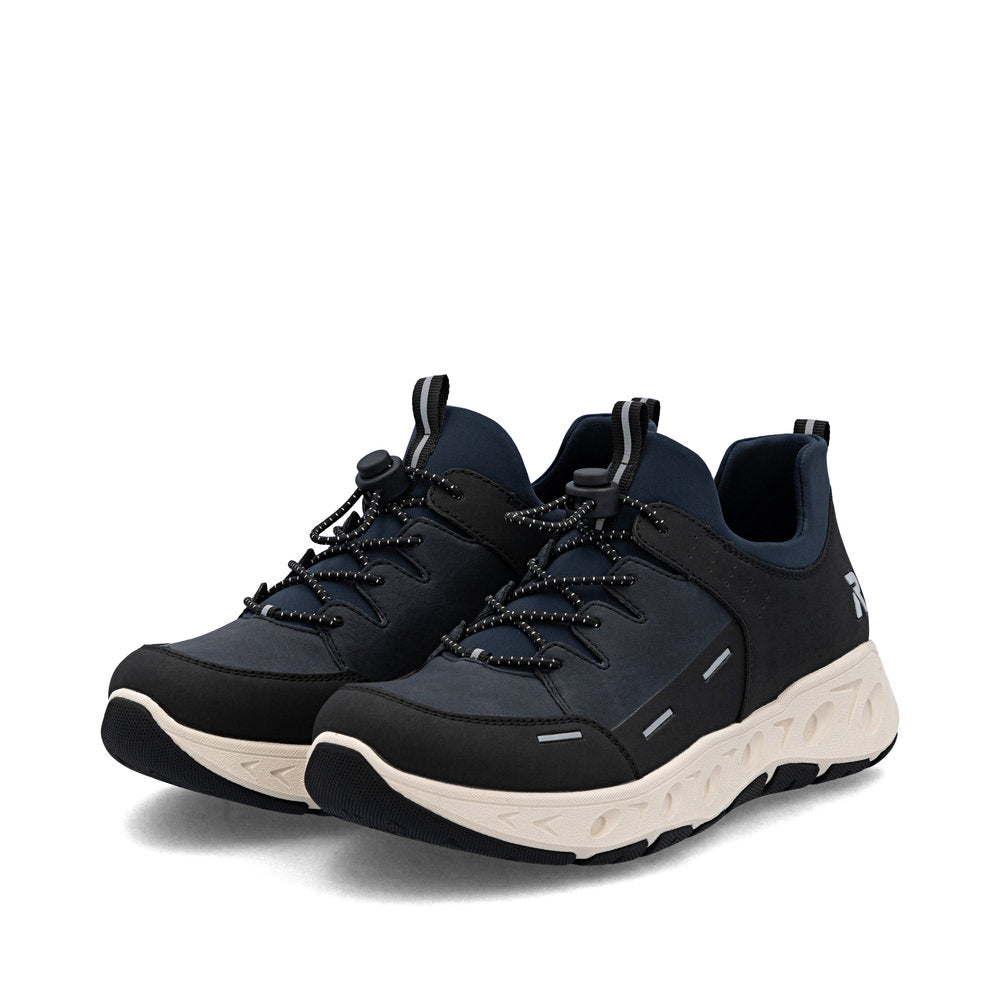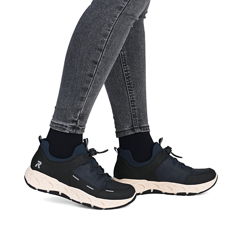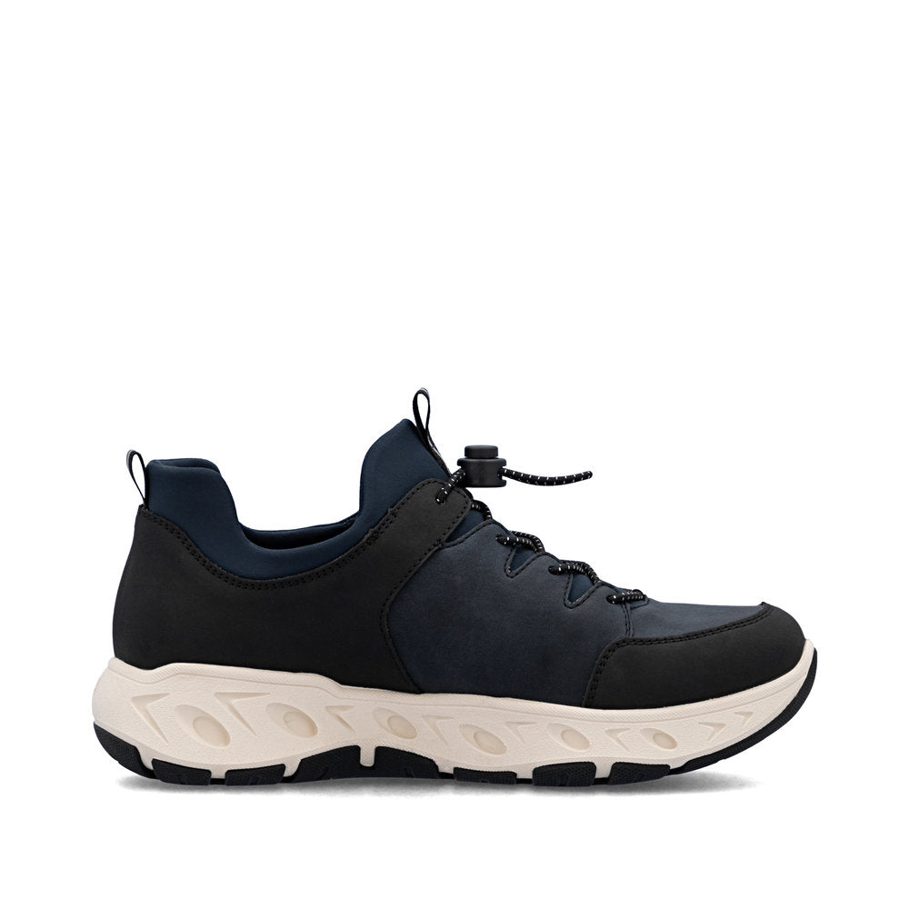 Baskets basses Rieker bleu et noir en cuir synthétique de qualité. Leur bande élastique permet un chaussage facile et rapide. La semelle de recouvrement MemoSoft épouse la forme du pied grâce à sa mousse souple. De plus, leur largeur confortable garantit un chaussant parfait.