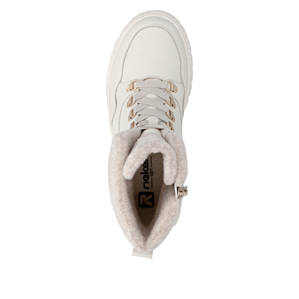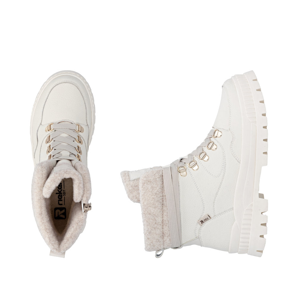 Bottes à lacets Rieker blanches en cuir lisse de haute qualité. Elles allient une membrane TEX déperlante, une semelle en fibre antidérapante pour une adhérence optimale et une semelle intérieure thermique chauffante. Enfilage ultra-rapide et facile grâce à la combinaison supérieure de fermeture éclair et de lacets. Bonne adhérence sur toutes les surfaces grâce à la semelle extérieure en TR résistante à l'usure et durable. Doublure en laine vierge très chaude pour une protection durable contre le froid. La largeur confortable assure un ajustement parfait.