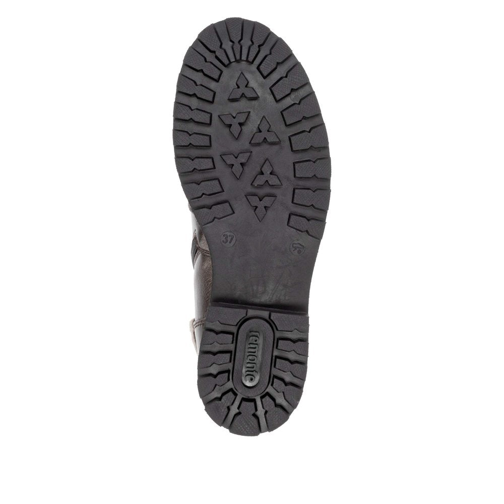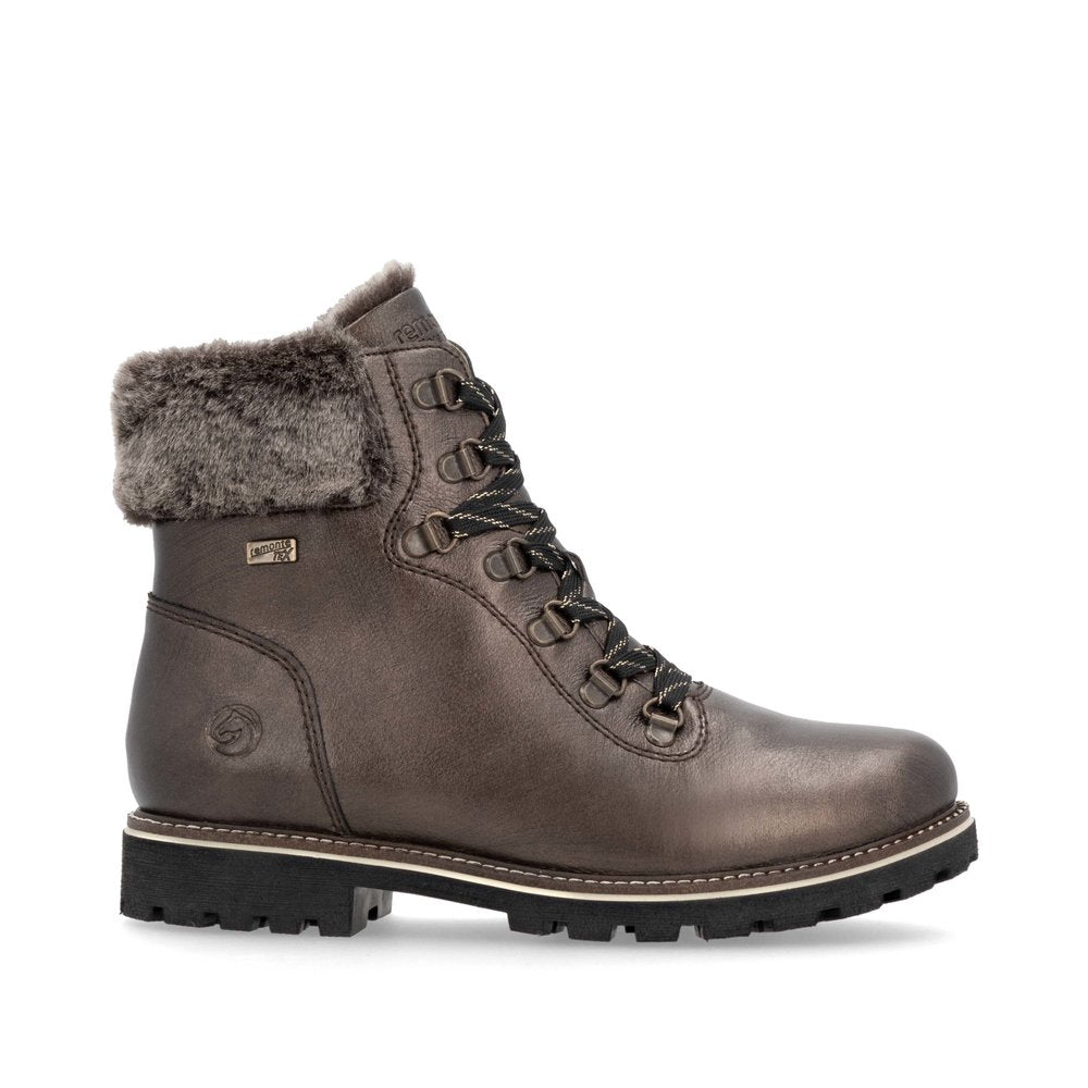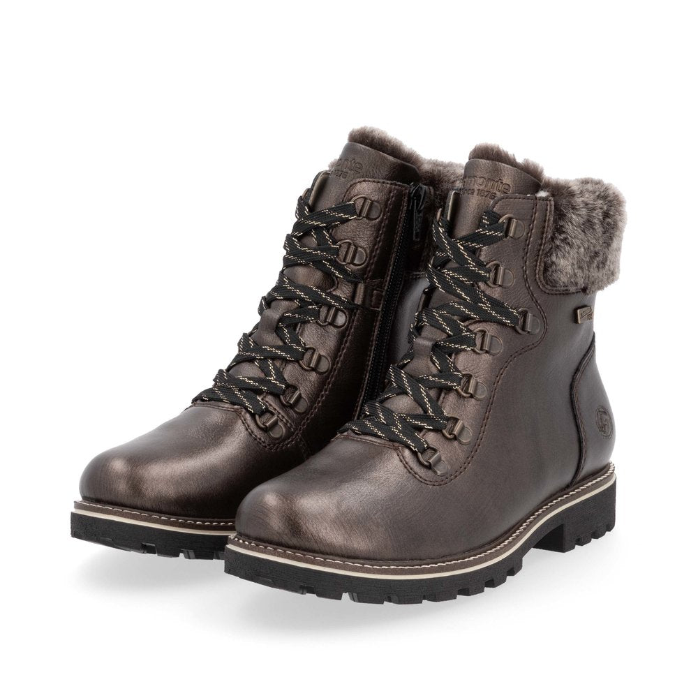 Élégantes et extrêmement confortables ! Ces bottines à lacets Remonte marron métallisé en cuir lisse sont polyvalentes ! Malgré le laçage, la chaussure se ferme facilement grâce à la fermeture éclair. Le col en fourrure sur la tige rafraîchit le design. La semelle adhérente et flexible à talon bloc offre un bon maintien. Grâce à sa largeur confortable, la chaussure offre non seulement suffisamment d'espace à l'avant-pied, mais est également disponible en grandes pointures. La surface déperlante offre une protection optimale contre les intempéries et la semelle intérieure thermique protège du froid. La laine vierge douillette et très chaude garde les pieds au chaud.