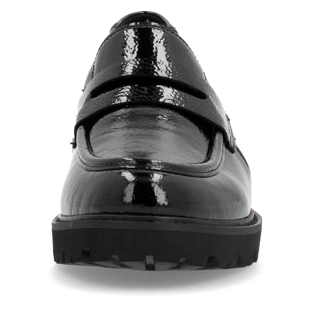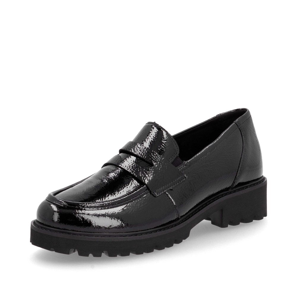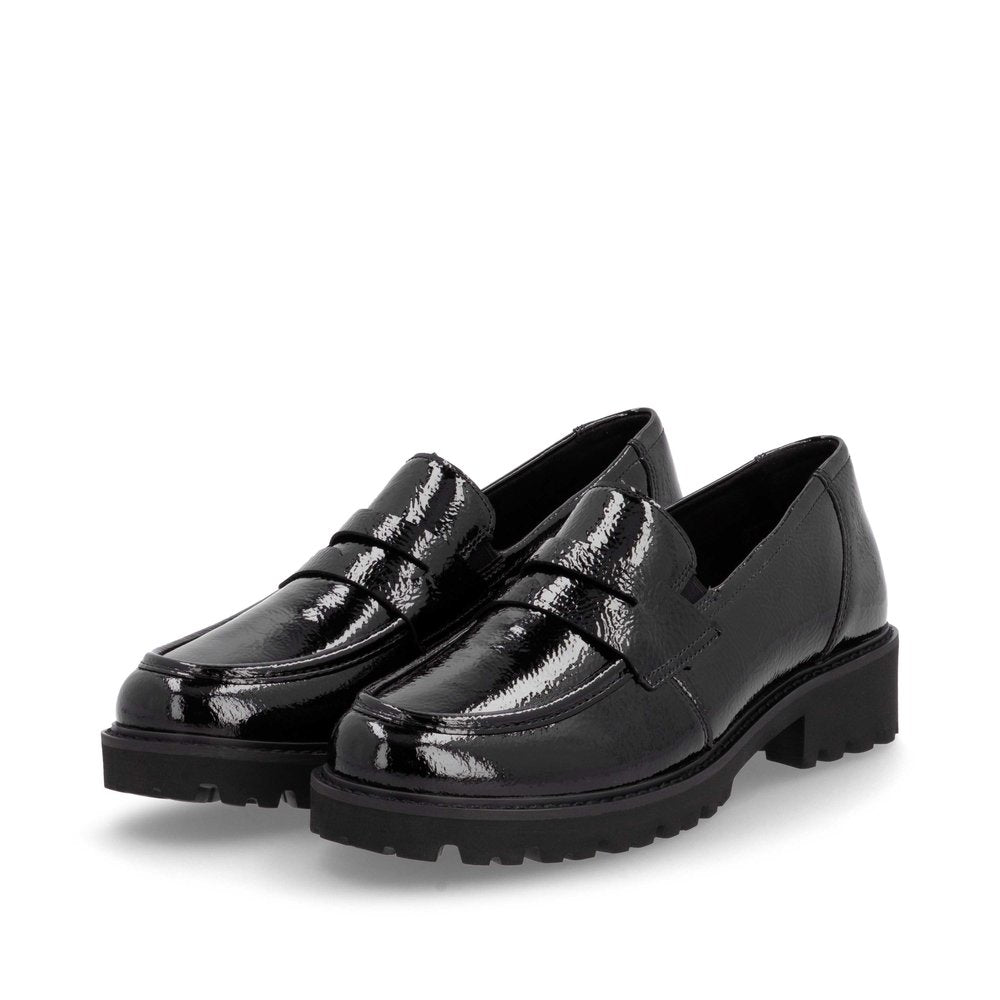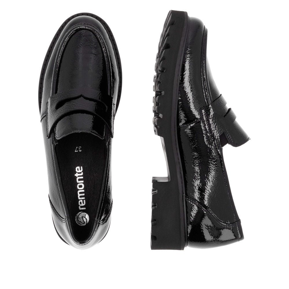 Plus d'espace pour vos pieds ! Ces mocassins Remonte noirs brillants en cuir verni feront battre le cœur des femmes soucieuses de la mode. Leur bande élastique permet un chaussage et un déchaussage rapides et faciles. Leurs atouts fonctionnels sont parfaitement complétés par une semelle intérieure rembourrée et amovible, ainsi que par une semelle particulièrement légère et amortissante à talon bloc. Grâce à leur largeur confortable, ces chaussures offrent non seulement suffisamment d'espace à l'avant-pied, mais sont également disponibles en grandes pointures. Doublées de cuir souple et de microvelours respirant, elles offrent un confort incomparable !