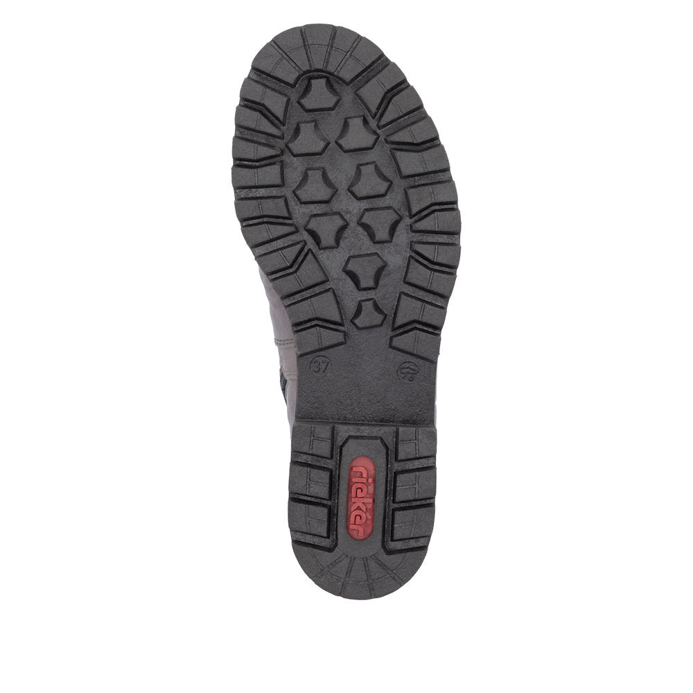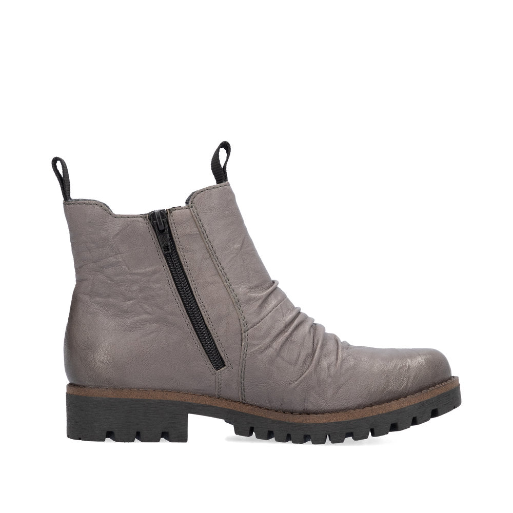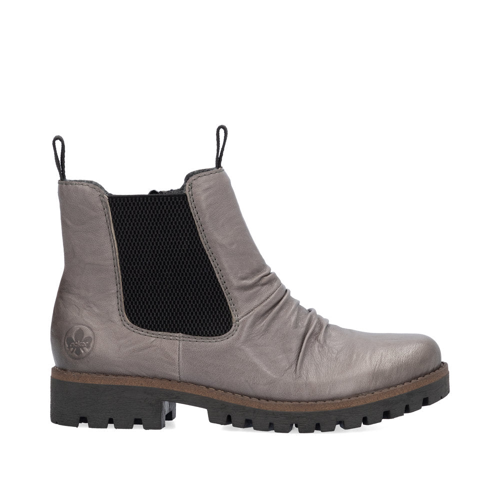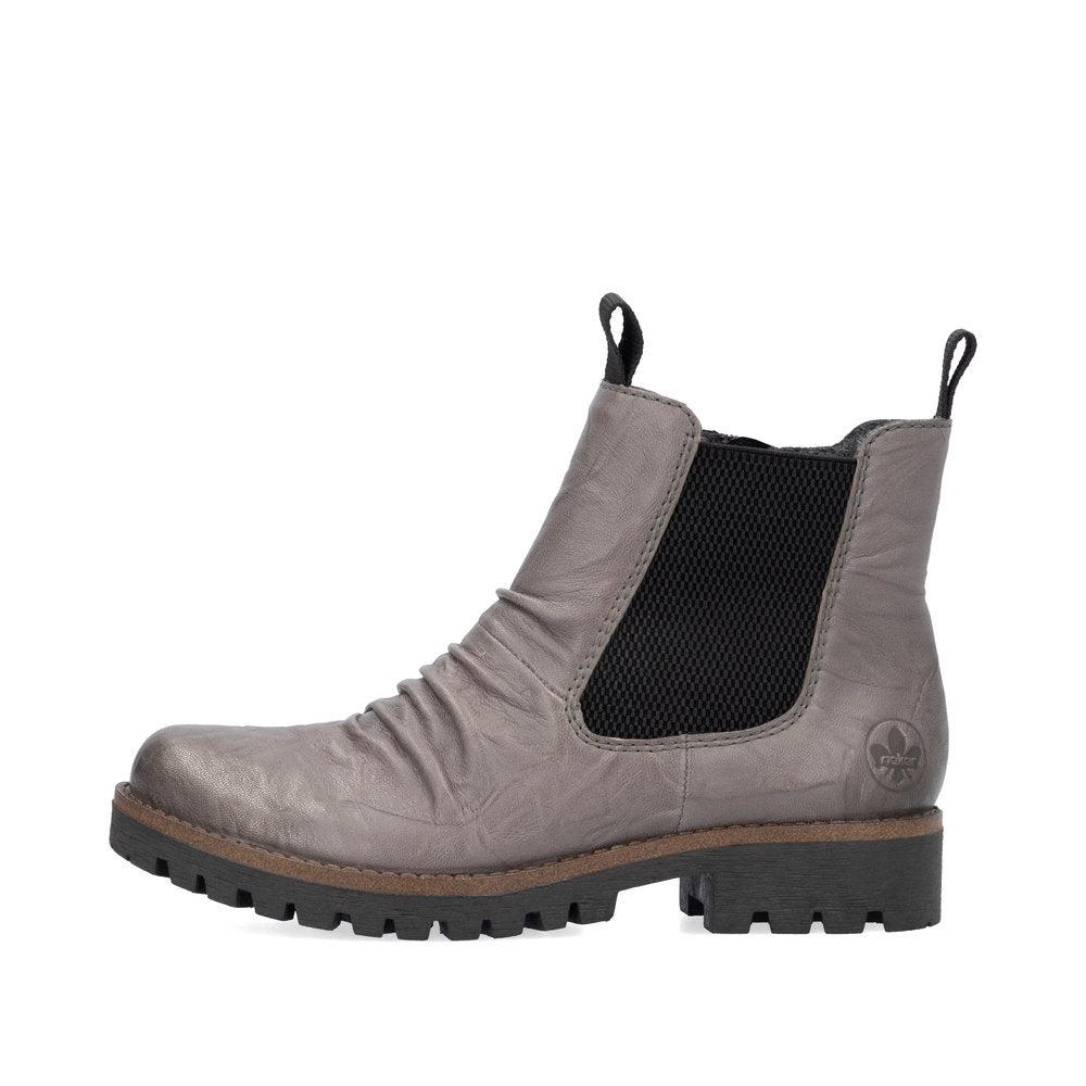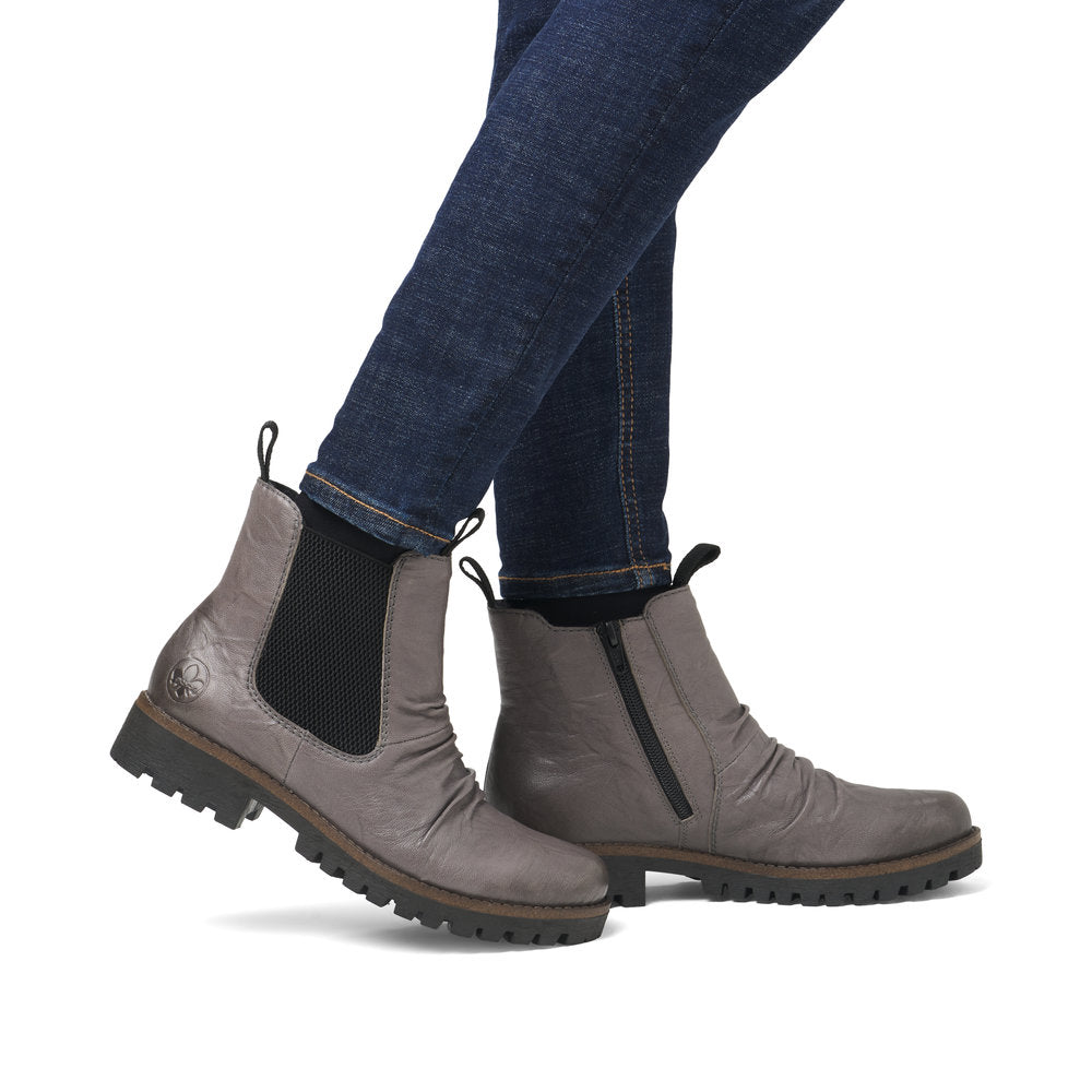Quand la mode rencontre la fonctionnalité. Ces bottines Chelsea Rieker décontractées en cuir lisse gris arctique vous accompagneront confortablement sur tous vos chemins. Leur construction traditionnelle à coutures apparentes rend la chaussure particulièrement souple et robuste, et assure un ajustement parfait. Outre la fermeture éclair, ce modèle est doté d'un bord de tige élastique, facilitant ainsi l'enfilage. La semelle antidérapante offre une excellente adhérence. Ces chaussures allient style et confort à la perfection !