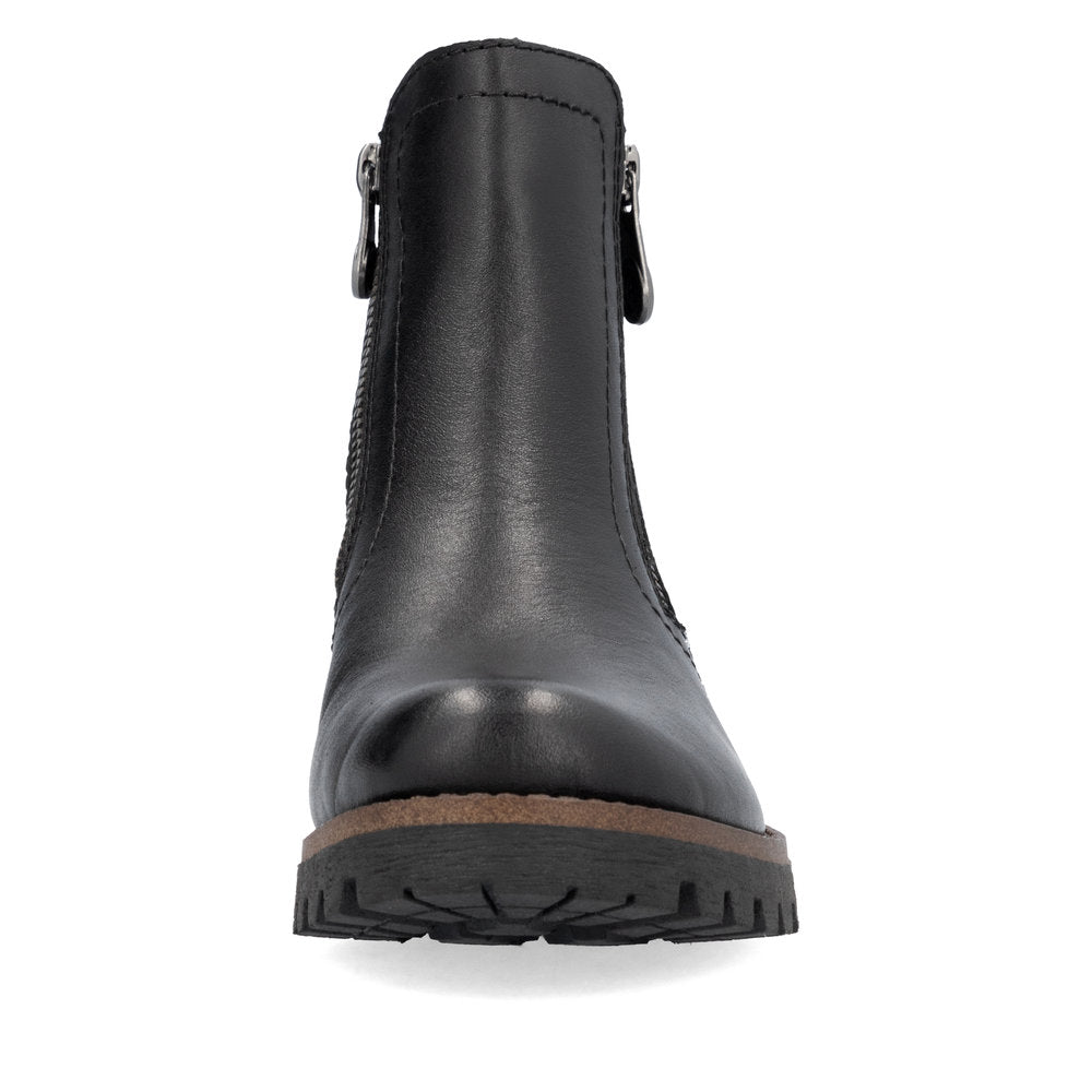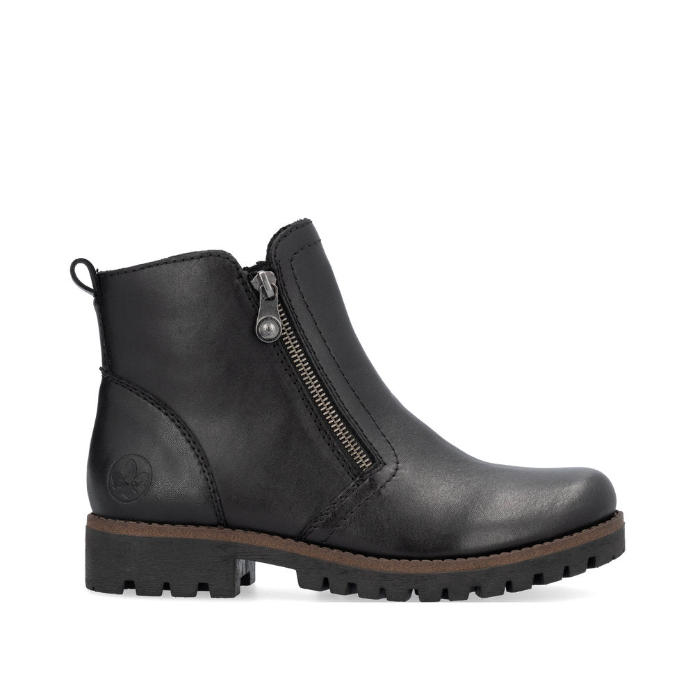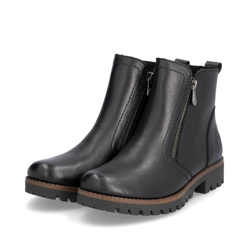 Attention, chaussures favorites ! Ces bottines Rieker noir nuit en cuir lisse vous promettent une sensation de bien-être. Leur conception cousue les rend particulièrement robustes et flexibles. La fermeture éclair permet un enfilage rapide. La semelle antidérapante assure une bonne adhérence. Un pur luxe !