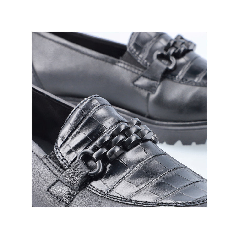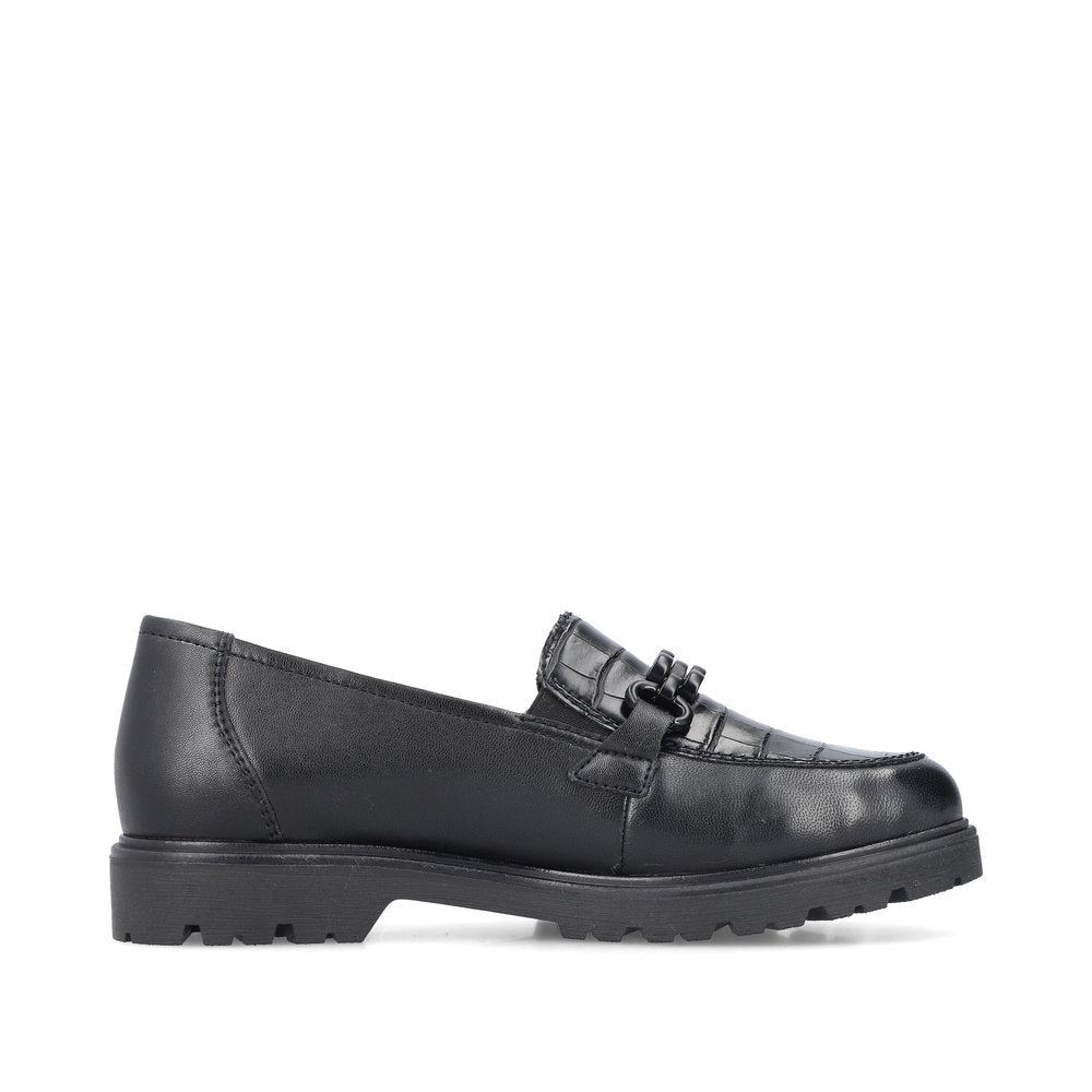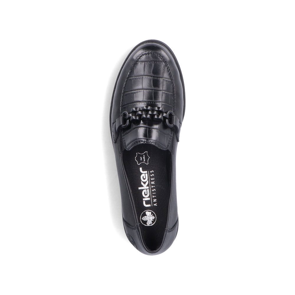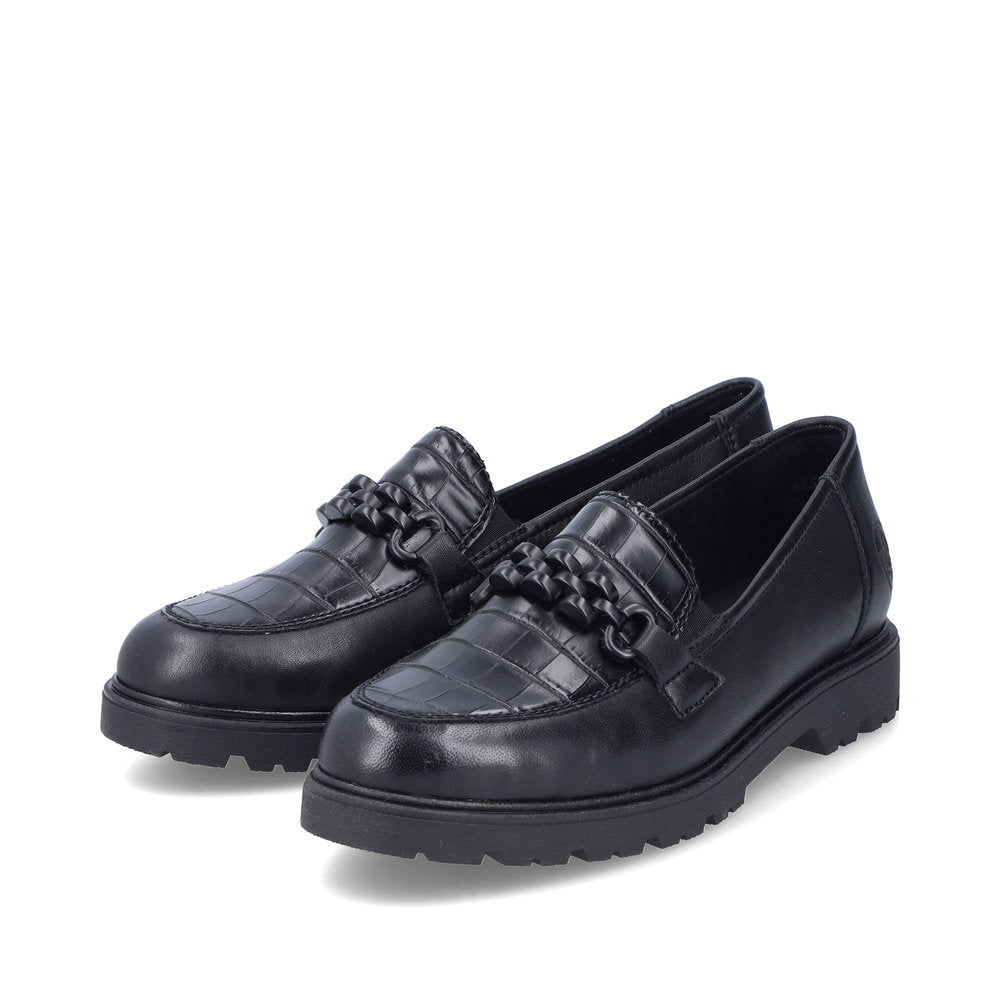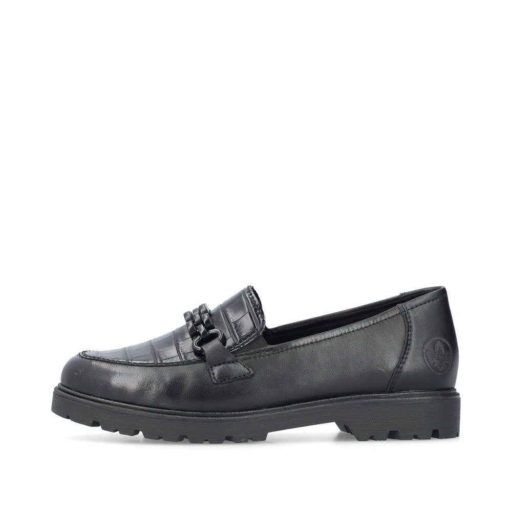 Un incontournable tendance ! Ces mocassins Rieker noirs en cuir lisse allient design tendance, confort optimal et fonctionnalité. Leur bande élastique permet de les enfiler et de les retirer facilement et confortablement. La chaîne décorative attire tous les regards. La semelle légère et adhérente assure une bonne adhérence sur tous les types de terrains. De plus, la semelle de recouvrement est extra souple. Le bien-être tendance signé Rieker !