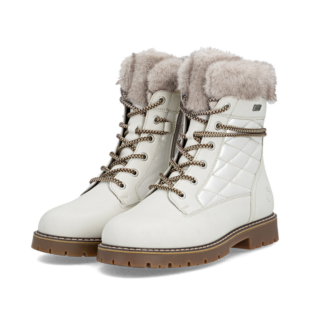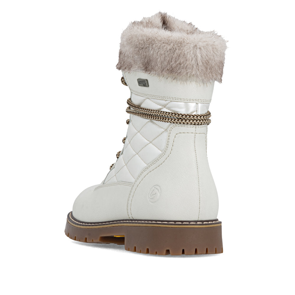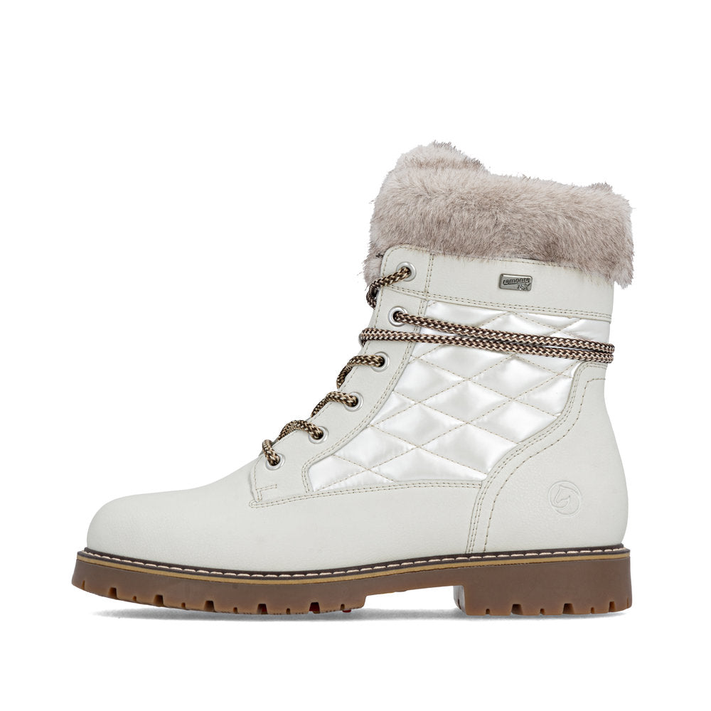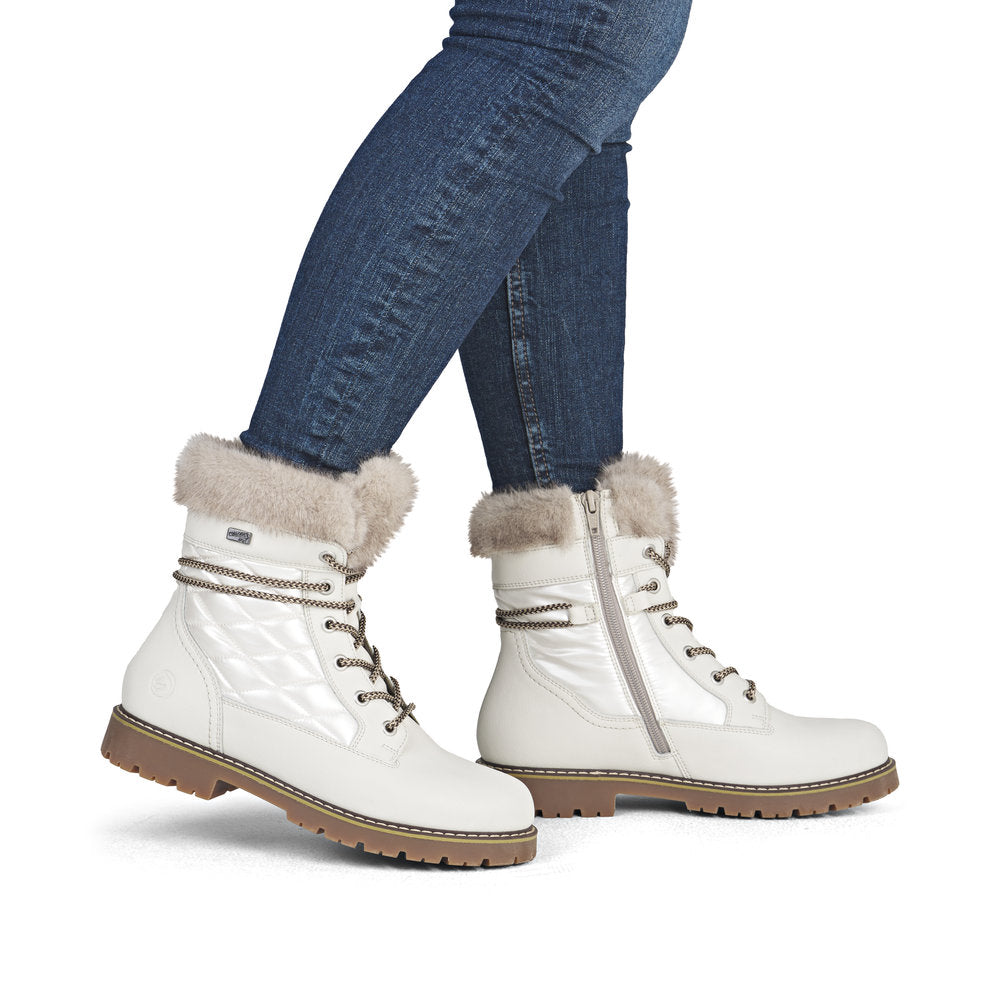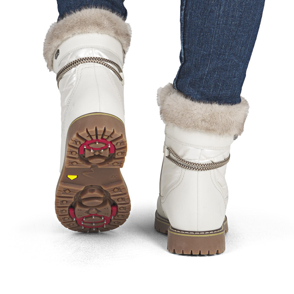Profitez des journées froides ! Ces bottines à lacets Remonte blanches et marron en cuir lisse ont tout pour plaire. Outre le laçage, ce modèle est équipé d'une fermeture éclair pour un maintien optimal. Le col en fourrure sur la tige lui confère un petit plus. La semelle adhérente et amortissante assure une bonne adhérence à chaque pas. La largeur confort vous offre plus d'espace. Côté fonctionnalité, cette chaussure est un véritable atout : la membrane RemonteTEX est déperlante, les crampons repliables offrent une adhérence supplémentaire sur sol verglacé et la semelle intérieure chauffante protège du froid. Elle est également très confortable grâce à sa laine vierge douillette et très chaude. À vous de jouer !