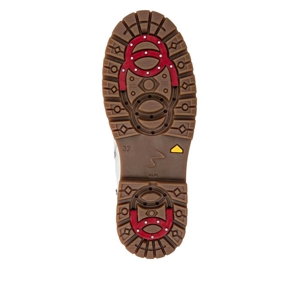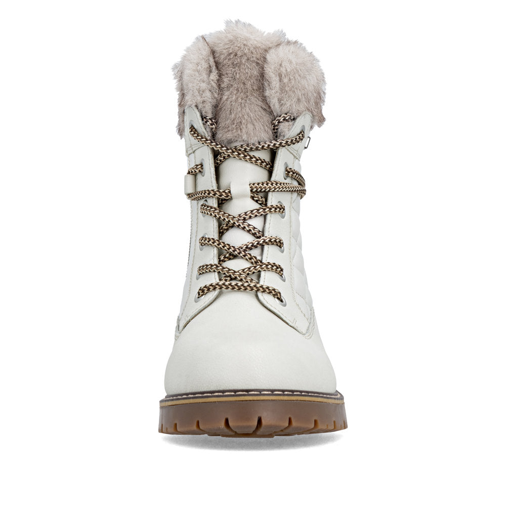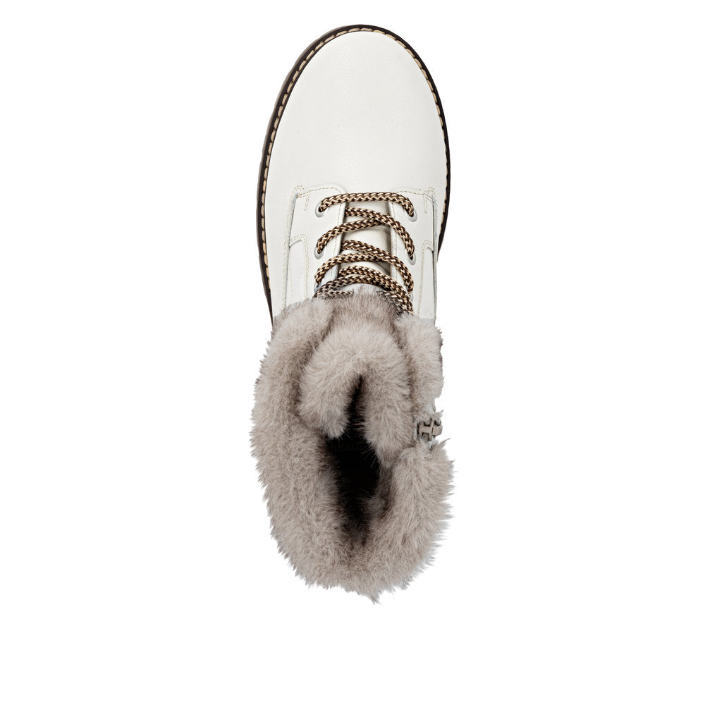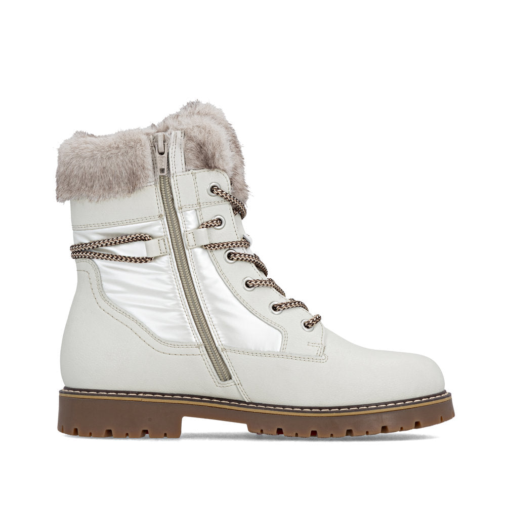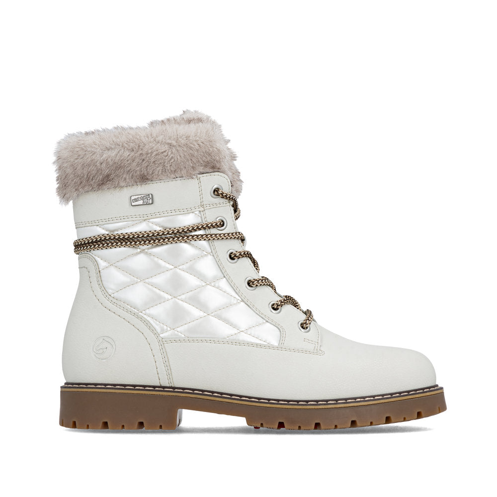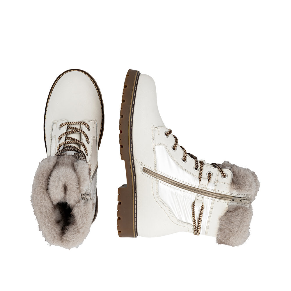 Profitez des journées froides ! Ces bottines à lacets Remonte blanches et marron en cuir lisse ont tout pour plaire. Outre le laçage, ce modèle est équipé d'une fermeture éclair pour un maintien optimal. Le col en fourrure sur la tige lui confère un petit plus. La semelle adhérente et amortissante assure une bonne adhérence à chaque pas. La largeur confort vous offre plus d'espace. Côté fonctionnalité, cette chaussure est un véritable atout : la membrane RemonteTEX est déperlante, les crampons repliables offrent une adhérence supplémentaire sur sol verglacé et la semelle intérieure chauffante protège du froid. Elle est également très confortable grâce à sa laine vierge douillette et très chaude. À vous de jouer !