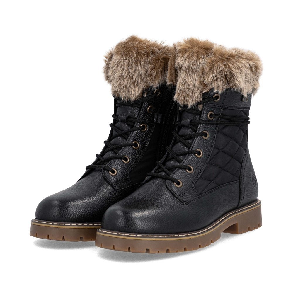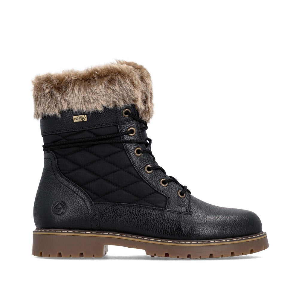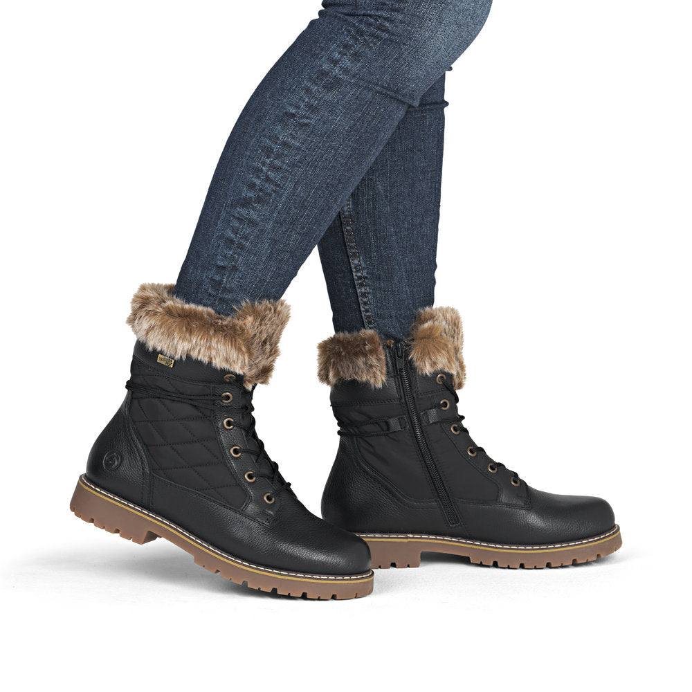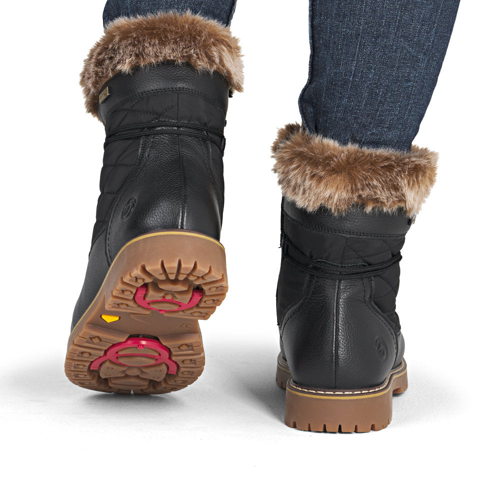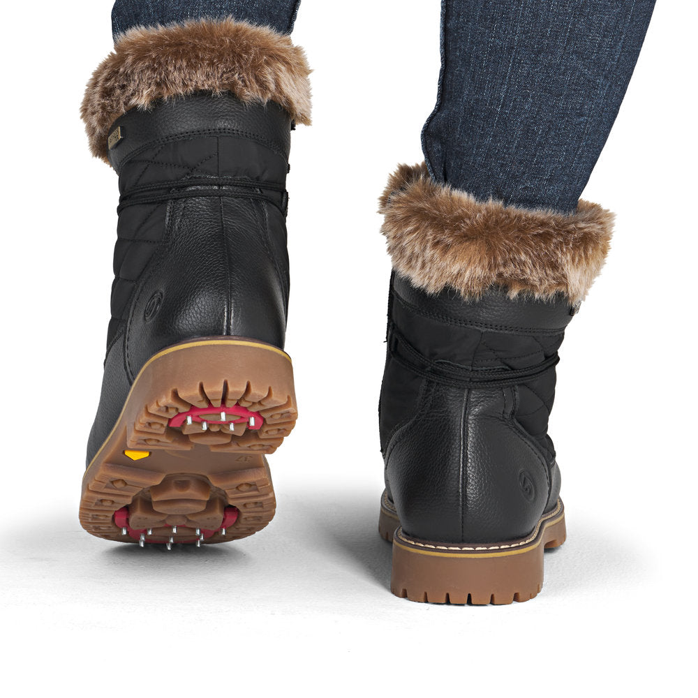 Profitez des journées froides ! Ces bottines à lacets Remonte blanches et marron en cuir lisse ont tout pour plaire. Outre le laçage, ce modèle est équipé d'une fermeture éclair pour un maintien optimal. Le col en fourrure sur la tige lui confère un petit plus. La semelle adhérente et amortissante assure une bonne adhérence à chaque pas. La largeur confort vous offre plus d'espace. Côté fonctionnalité, cette chaussure est un véritable atout : la membrane RemonteTEX est déperlante, les crampons repliables offrent une adhérence supplémentaire sur sol verglacé et la semelle intérieure chauffante protège du froid. Elle est également très confortable grâce à sa laine vierge douillette et très chaude. À vous de jouer !