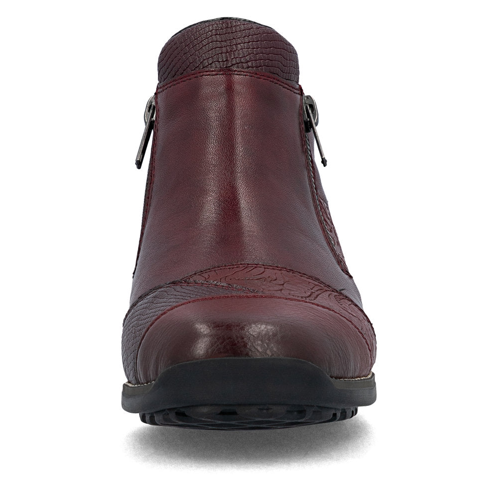Élégantes toute la saison ! Ces bottines Rieker rouge foncé en cuir lisse sont non seulement élégantes, mais aussi fonctionnelles. Leur construction cousue les rend particulièrement robustes et flexibles. Une fermeture éclair permet un enfilage rapide et facile. La semelle antidérapante assure une foulée sûre à chaque pas. La coupe étroite offre un maintien supplémentaire au pied. Vous avez également une longueur d'avance en termes de confort grâce à la membrane RiekerTEX déperlante et à la doublure en laine vierge douillette et très chaude. Un véritable coup de cœur !