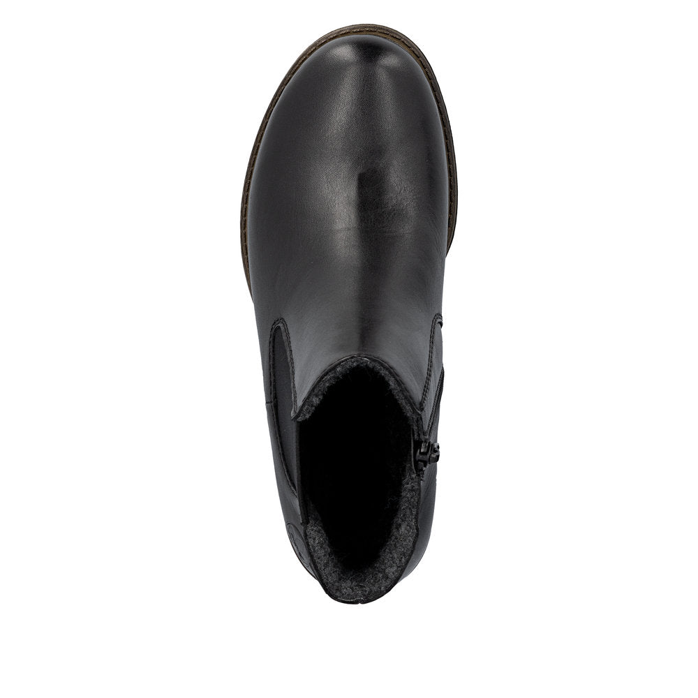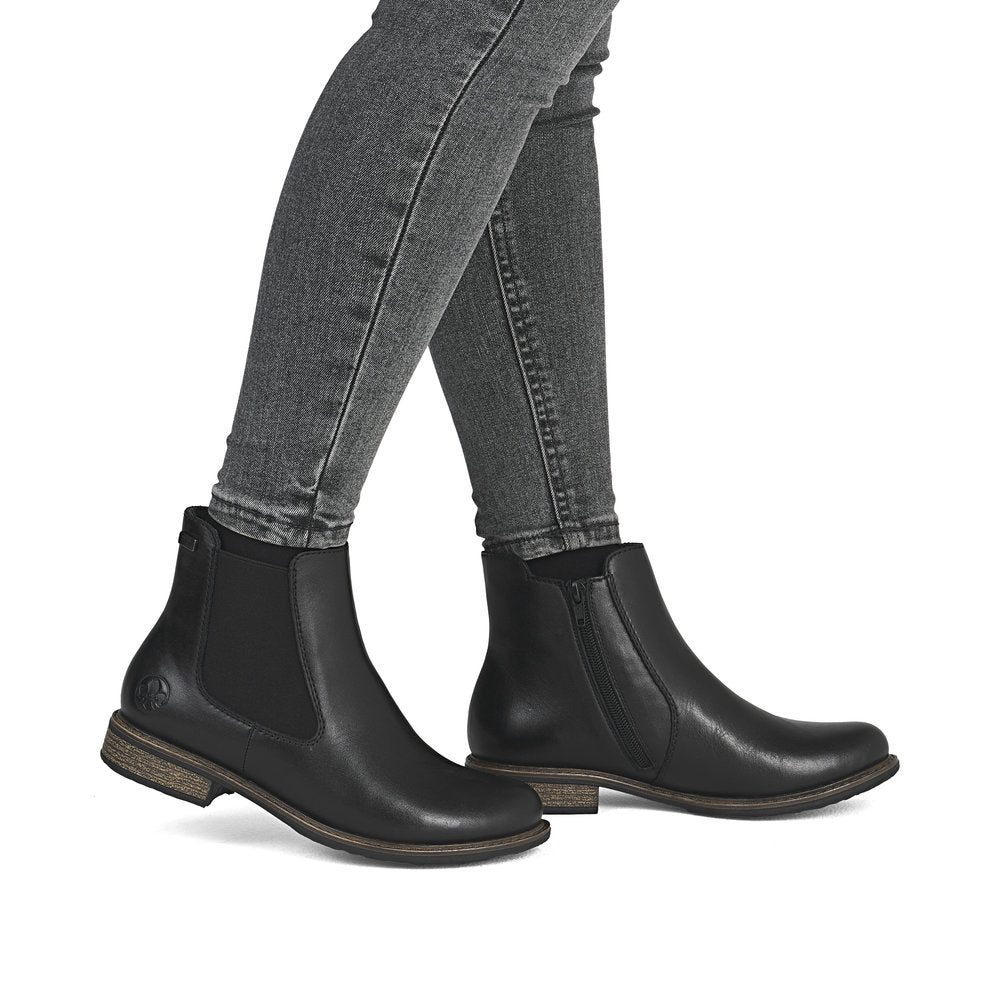 Confort maximal à chaque pas ! Ces bottines Chelsea Rieker noires en cuir lisse vous promettent une sensation de bien-être. Grâce à leur fermeture éclair et à leur empiècement élastique, les enfiler est un jeu d'enfant. La semelle adhérente assure une bonne adhérence en toutes circonstances. Leur semelle intérieure rembourrée et amovible offre un confort optimal. Leur largeur supplémentaire offre plus d'espace aux pieds. La membrane RiekerTEX protège de l'humidité et du vent. Vos meilleures alliées pour la nouvelle saison !