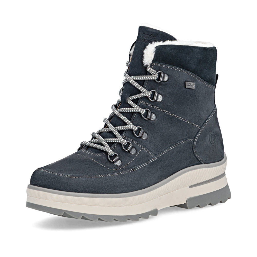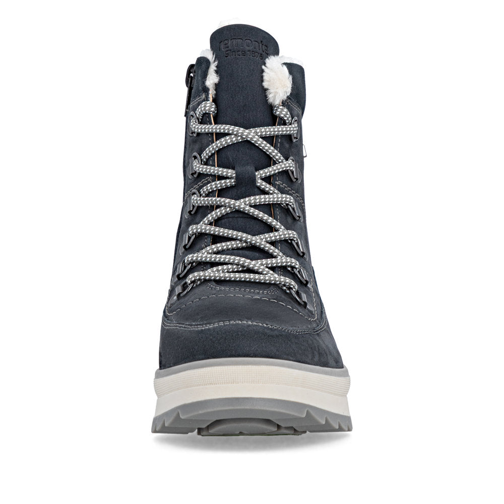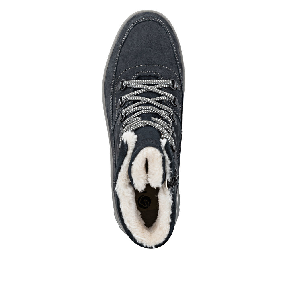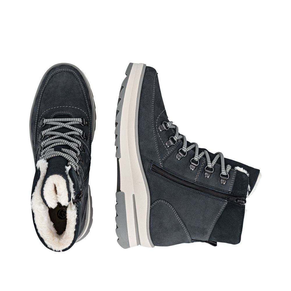 Profitez des journées froides ! Ces bottines Remonte bleues à lacets en cuir suédé vous séduiront. L'association astucieuse du laçage et de la fermeture éclair offre un maintien optimal et facilite l'enfilage et le déchaussage. Les œillets originaux complètent harmonieusement le look. La semelle souple et adhérente assure un bon maintien. La largeur confort offre suffisamment d'espace pour que vos pieds soient à l'aise, même en cas de port prolongé. La tige déperlante protège de l'humidité, la semelle intérieure thermique maintient l'intérieur de la chaussure au chaud et la technologie fibre de verre assure une adhérence optimale. La laine vierge douillette et très chaude protège du froid. Impossible de faire plus confortable !