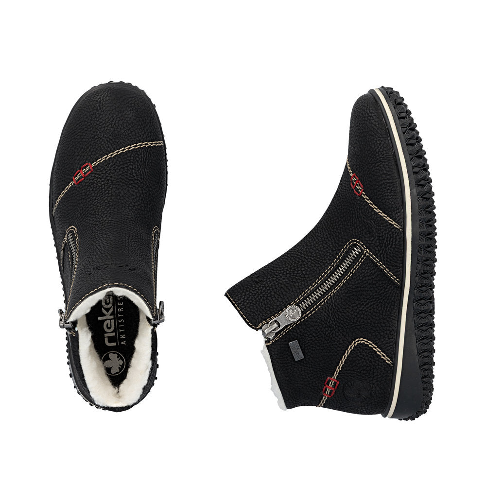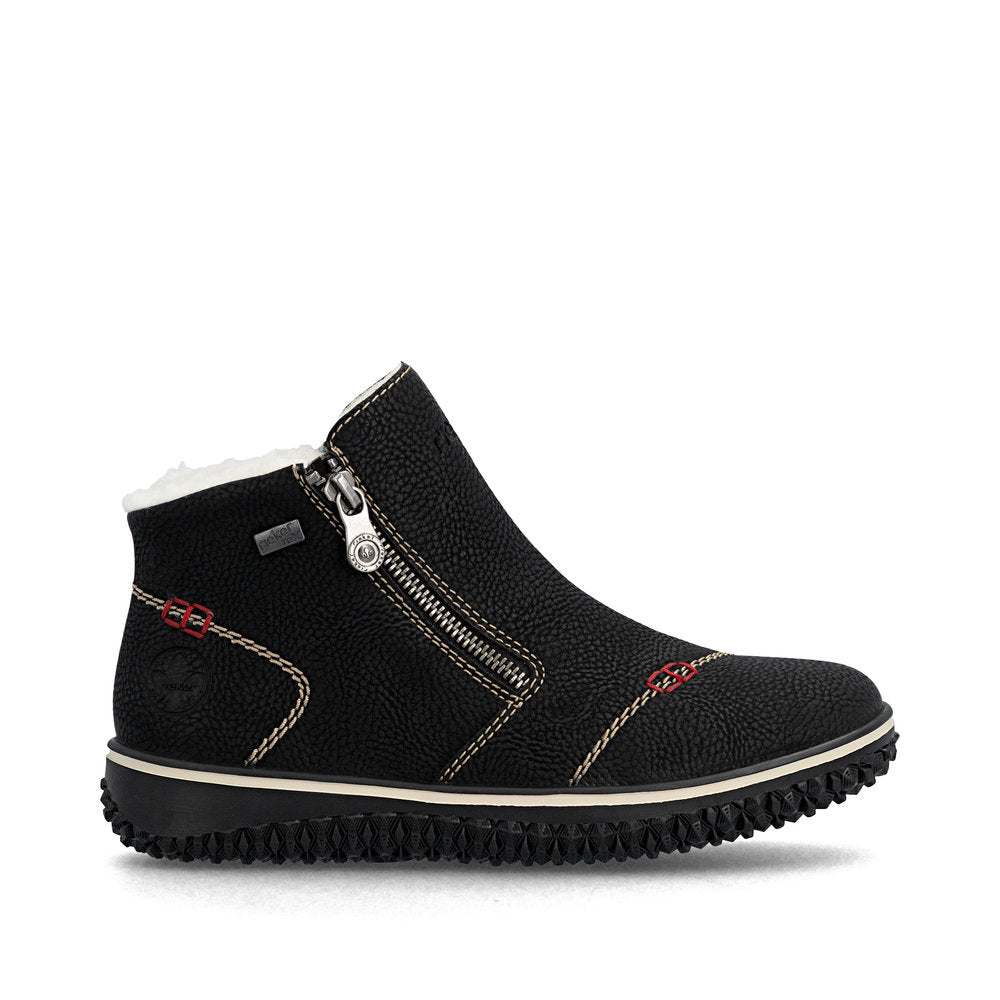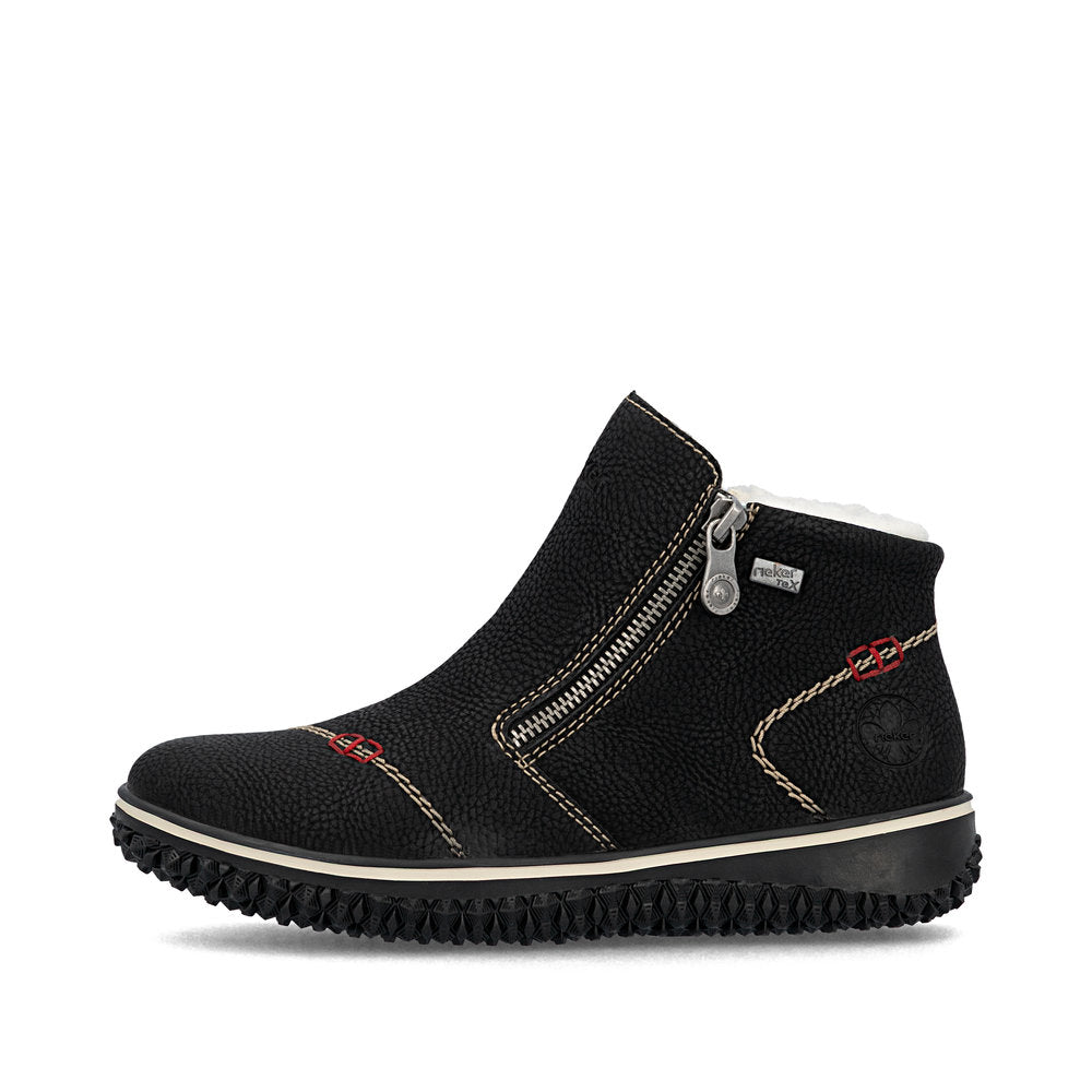 On n'a jamais entendu parler du froid ! Ces bottines Rieker noires impressionnent par leur design moderne et leur confort exceptionnel. La fermeture éclair permet de les enfiler très rapidement. Les coutures décoratives attirent tous les regards. La semelle adhérente assure une foulée sûre à chaque pas. La membrane RiekerTEX déperlante protège les pieds de l'humidité et du vent, tandis que la doublure douillette les garde longtemps au chaud. Attention, chaussures favorites !
