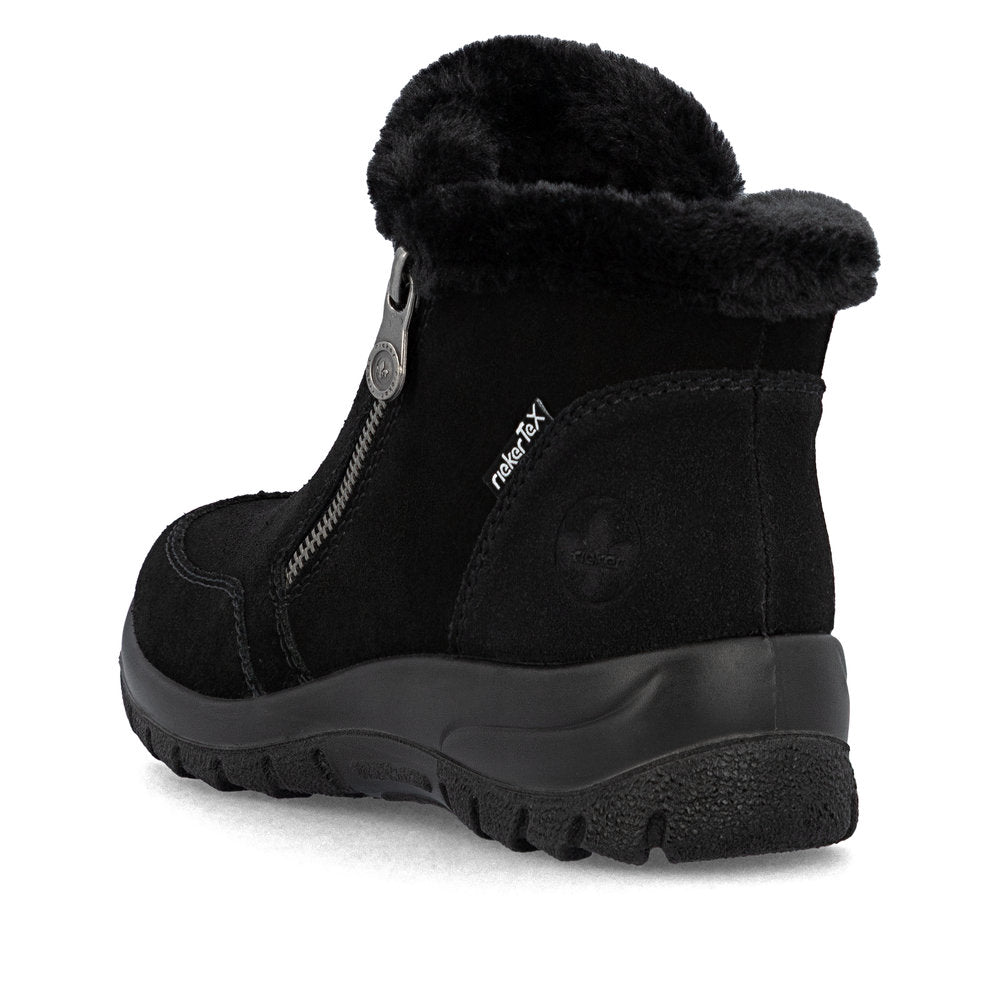 Enfilez-les et c'est parti ! Avec ces bottines Rieker noires en daim, impossible de geler. La fermeture éclair permet un enfilage ultra-rapide. Le bord de la tige en fourrure est un véritable accroche-regard. Grâce à la semelle légère et amortissante à talon compensé, vos pieds profiteront d'un confort optimal à chaque pas. La membrane RiekerTEX déperlante offre une protection fiable contre l'humidité, tandis que la fonction Ready2GO assure un enfilage rapide et facile. Vos pieds resteront au chaud toute la journée grâce à la doublure douce et chaude. Impossible de faire mieux !