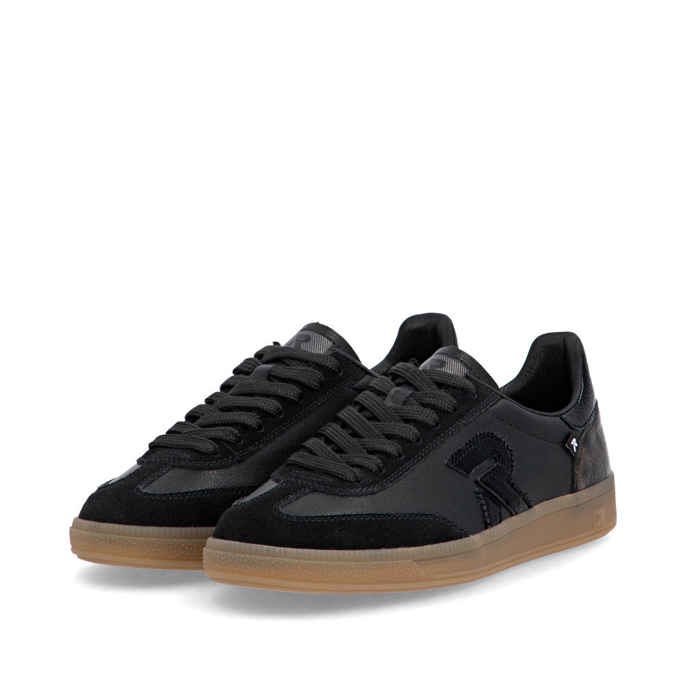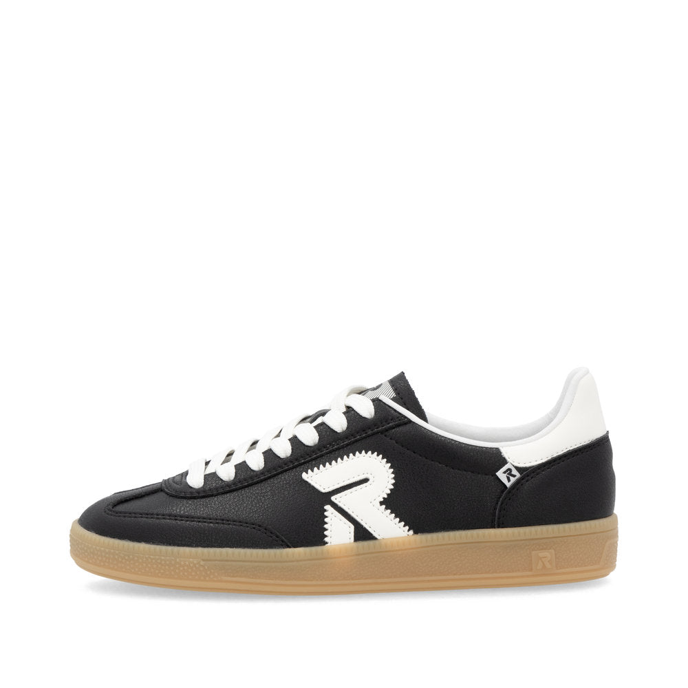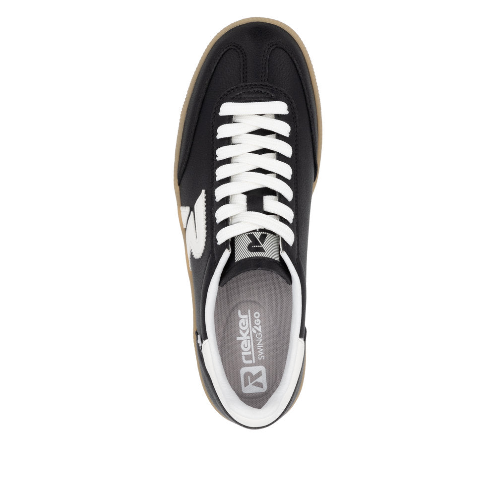Baskets basses Rieker noires en cuir lisse de haute qualité. La semelle intérieure Swing2GO avec soutien de la voûte plantaire amortit les chocs et offre un maximum d'énergie à chaque pas. Ce modèle est disponible en pointures homme et femme. La semelle extérieure en TR, résistante à l'usure et durable, assure une bonne adhérence. Doublure en micro-velours léger et cuir synthétique. De plus, la largeur confortable garantit un chaussant parfait.