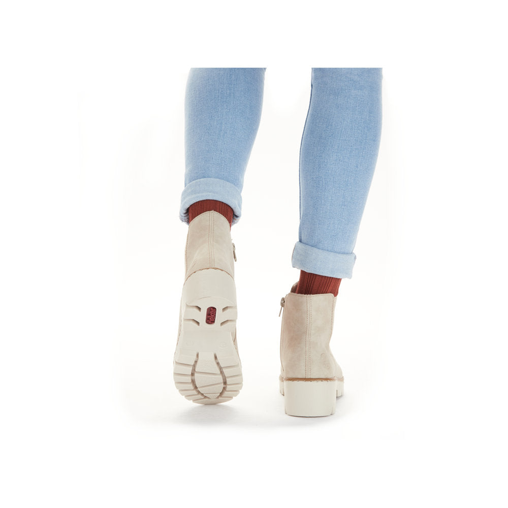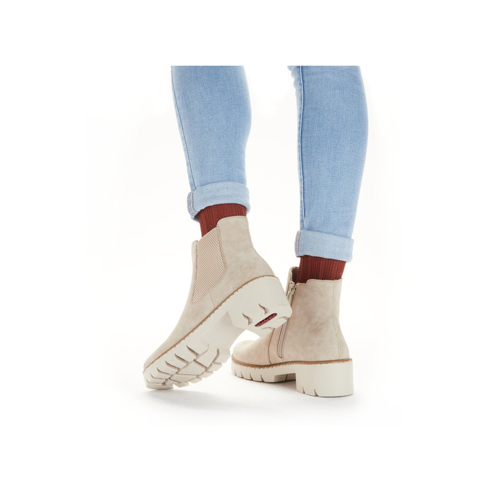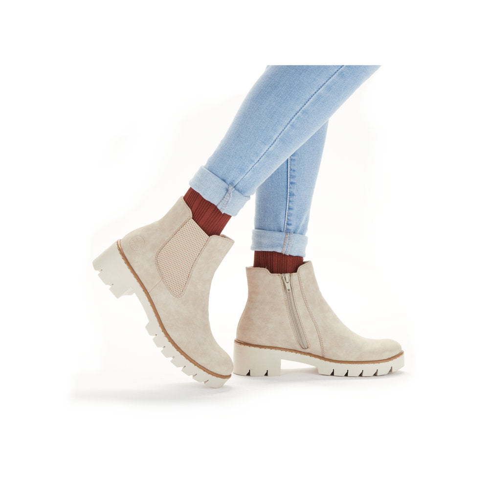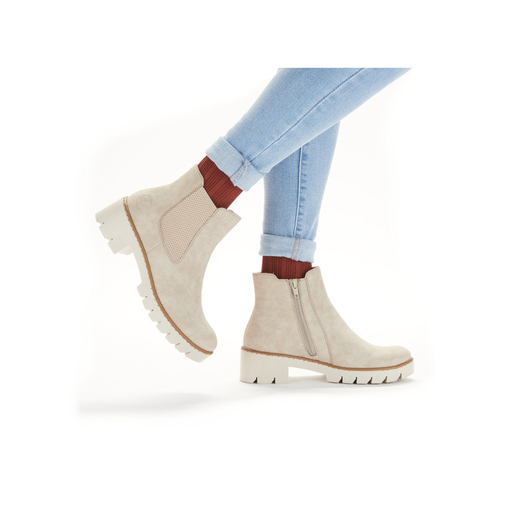 Presque trop souples pour être vraies ! Vous ne voudrez plus quitter ces bottines Chelsea beige clair de Rieker. Leur construction traditionnelle cousue rend la chaussure particulièrement souple et robuste, et assure un ajustement parfait. Grâce à la fermeture éclair et à l'empiècement élastique, l'enfiler est un jeu d'enfant. Grâce à la semelle adhérente à talon bloc, la marche est assurée, et la semelle de recouvrement extra-souple assure un confort optimal. Tout en un : le top !