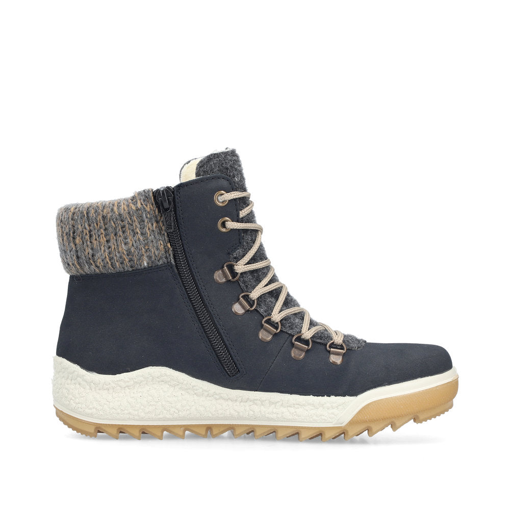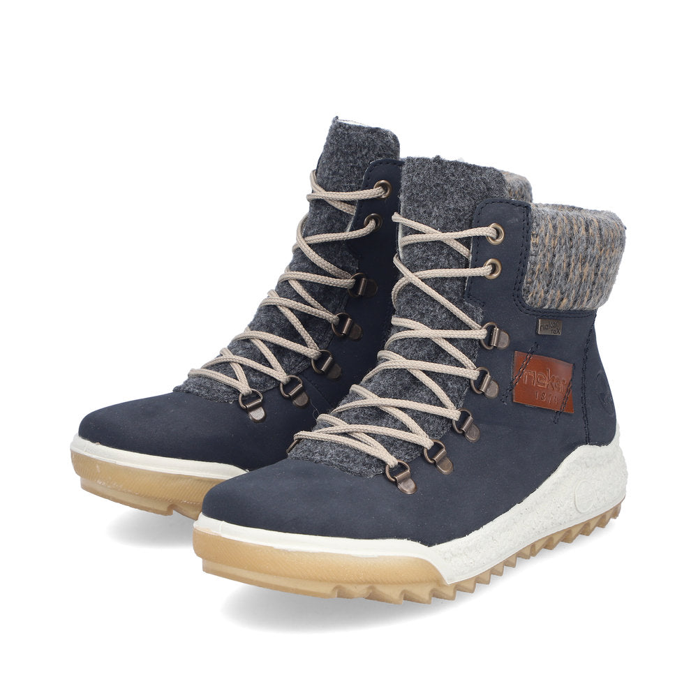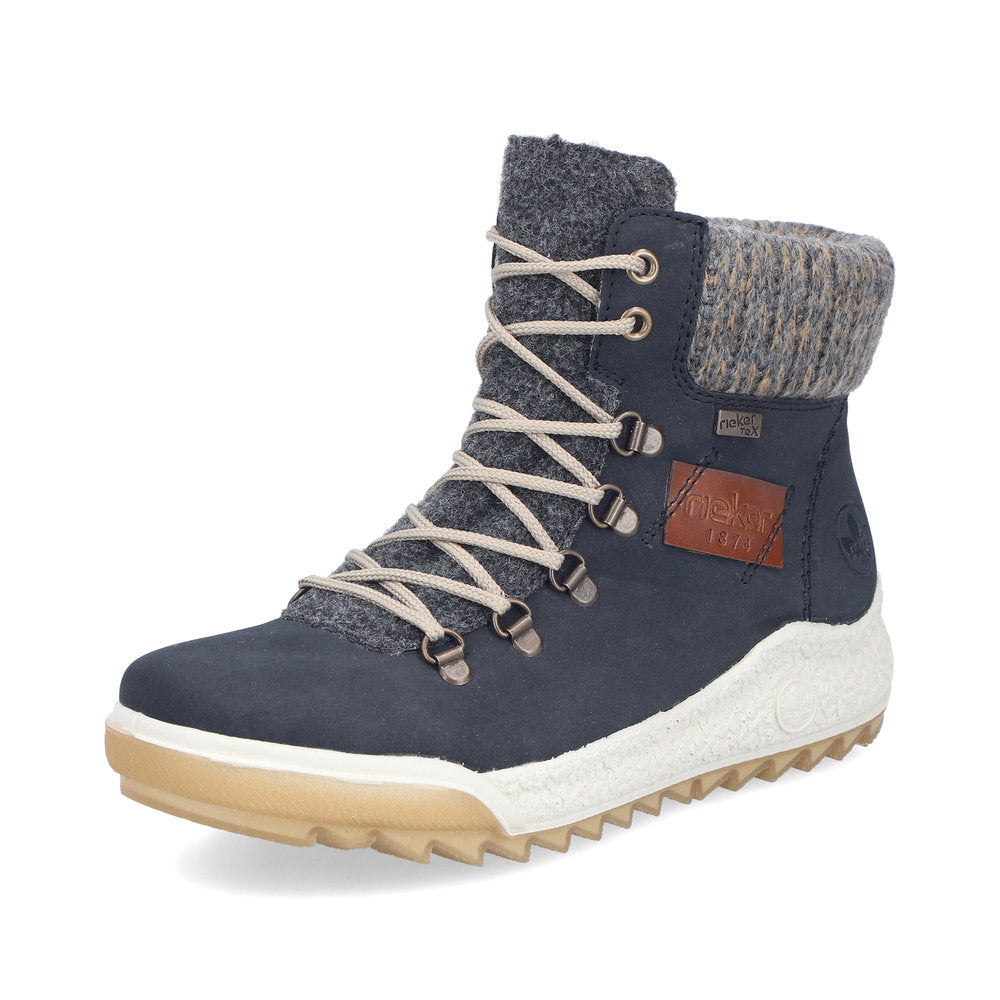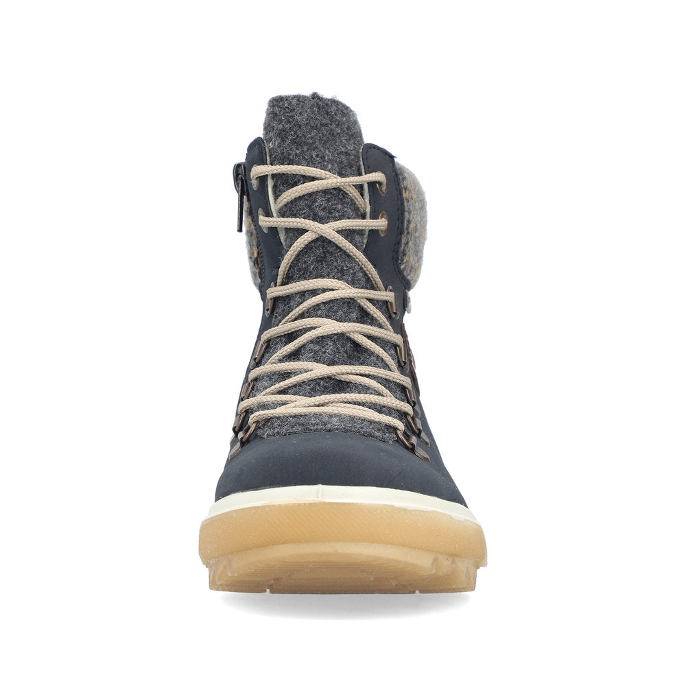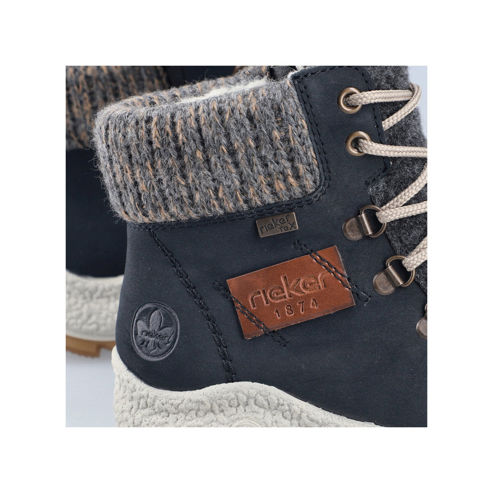 Avec style et confort tout au long de l'hiver ! Vous ne voudrez plus quitter ces bottes à lacets Rieker bleu foncé. L'association astucieuse du laçage et de la fermeture éclair offre un maintien optimal et facilite l'enfilage et le retrait. Le col de la tige en maille attire tous les regards. Grâce à la semelle légère et amortissante, vos pieds profiteront d'un confort optimal à chaque pas. Autre atout : la semelle de recouvrement extra-souple. Ce modèle est coupé dans une largeur confortable qui offre un espace suffisant au pied. Vous avez également une longueur d'avance en termes de confort grâce à la membrane RiekerTEX déperlante et à la doublure en laine vierge très chaude et douillette. Attention, chaussures potentiellement préférées !