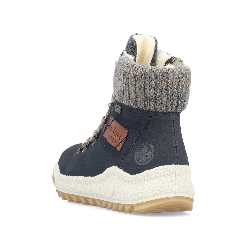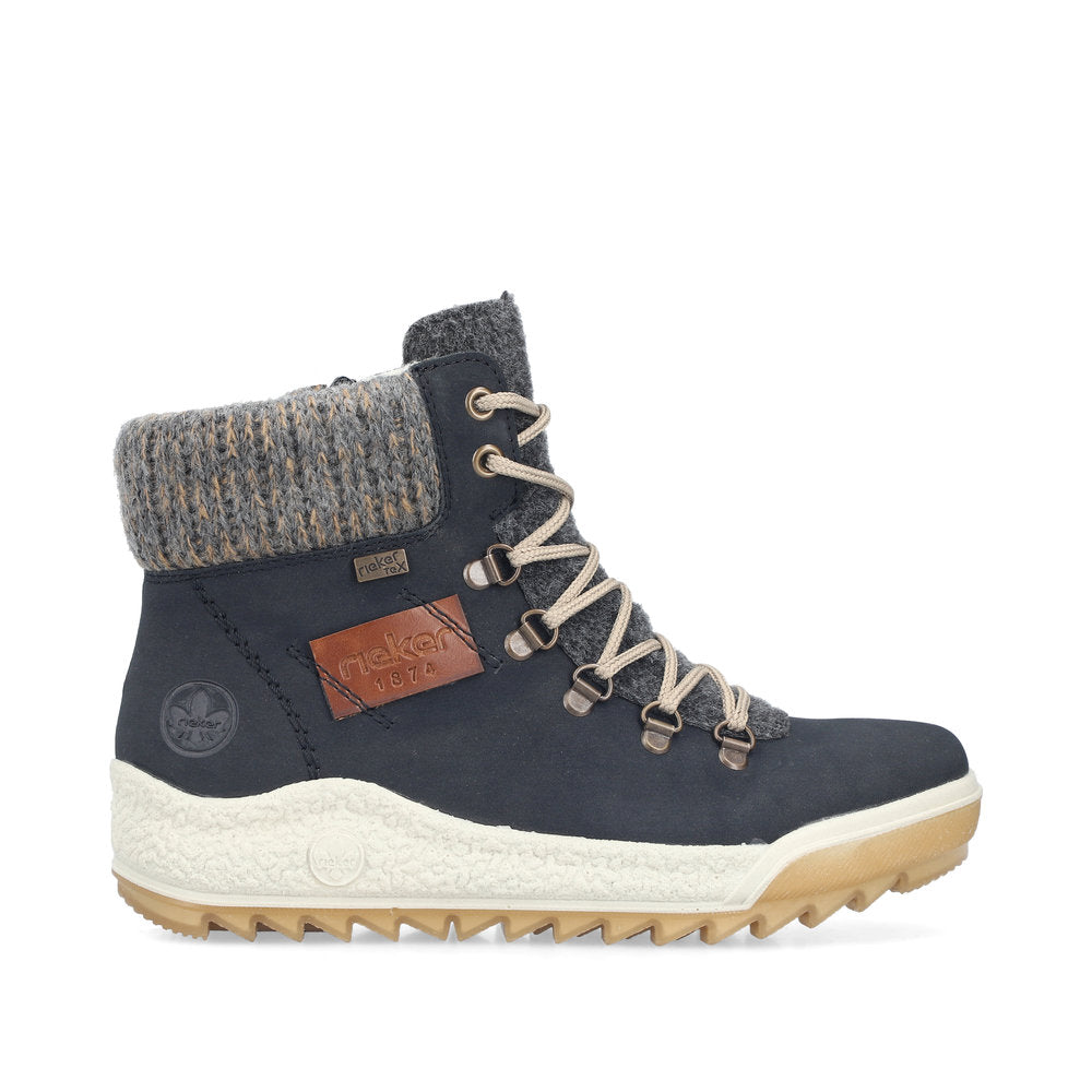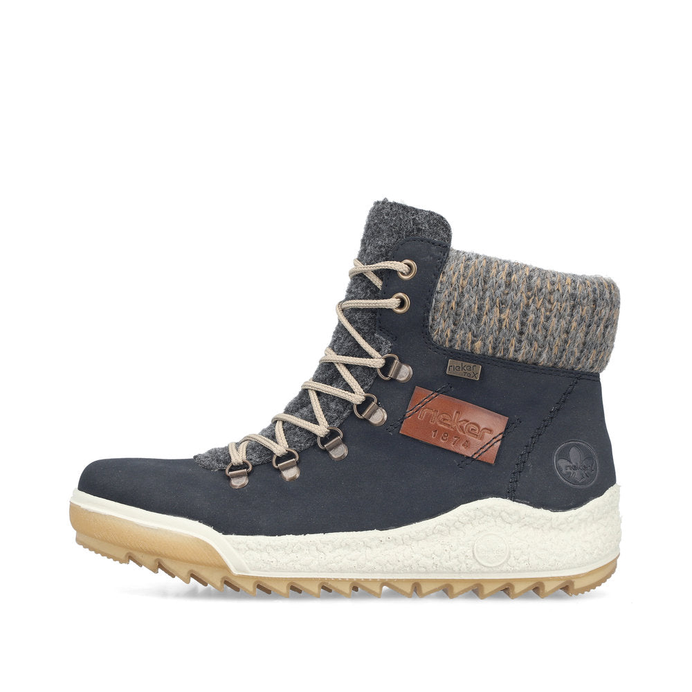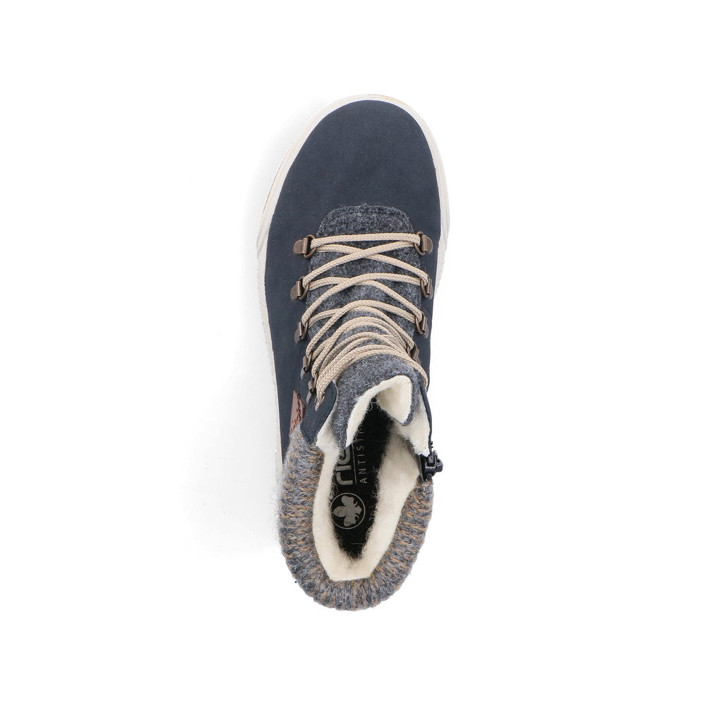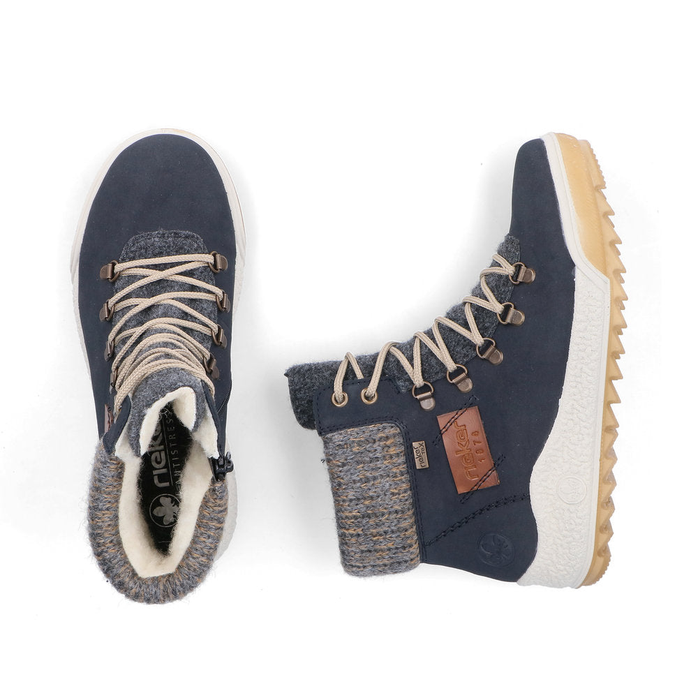 Avec style et confort tout au long de l'hiver ! Vous ne voudrez plus quitter ces bottes à lacets Rieker bleu foncé. L'association astucieuse du laçage et de la fermeture éclair offre un maintien optimal et facilite l'enfilage et le retrait. Le col de la tige en maille attire tous les regards. Grâce à la semelle légère et amortissante, vos pieds profiteront d'un confort optimal à chaque pas. Autre atout : la semelle de recouvrement extra-souple. Ce modèle est coupé dans une largeur confortable qui offre un espace suffisant au pied. Vous avez également une longueur d'avance en termes de confort grâce à la membrane RiekerTEX déperlante et à la doublure en laine vierge très chaude et douillette. Attention, chaussures potentiellement préférées !