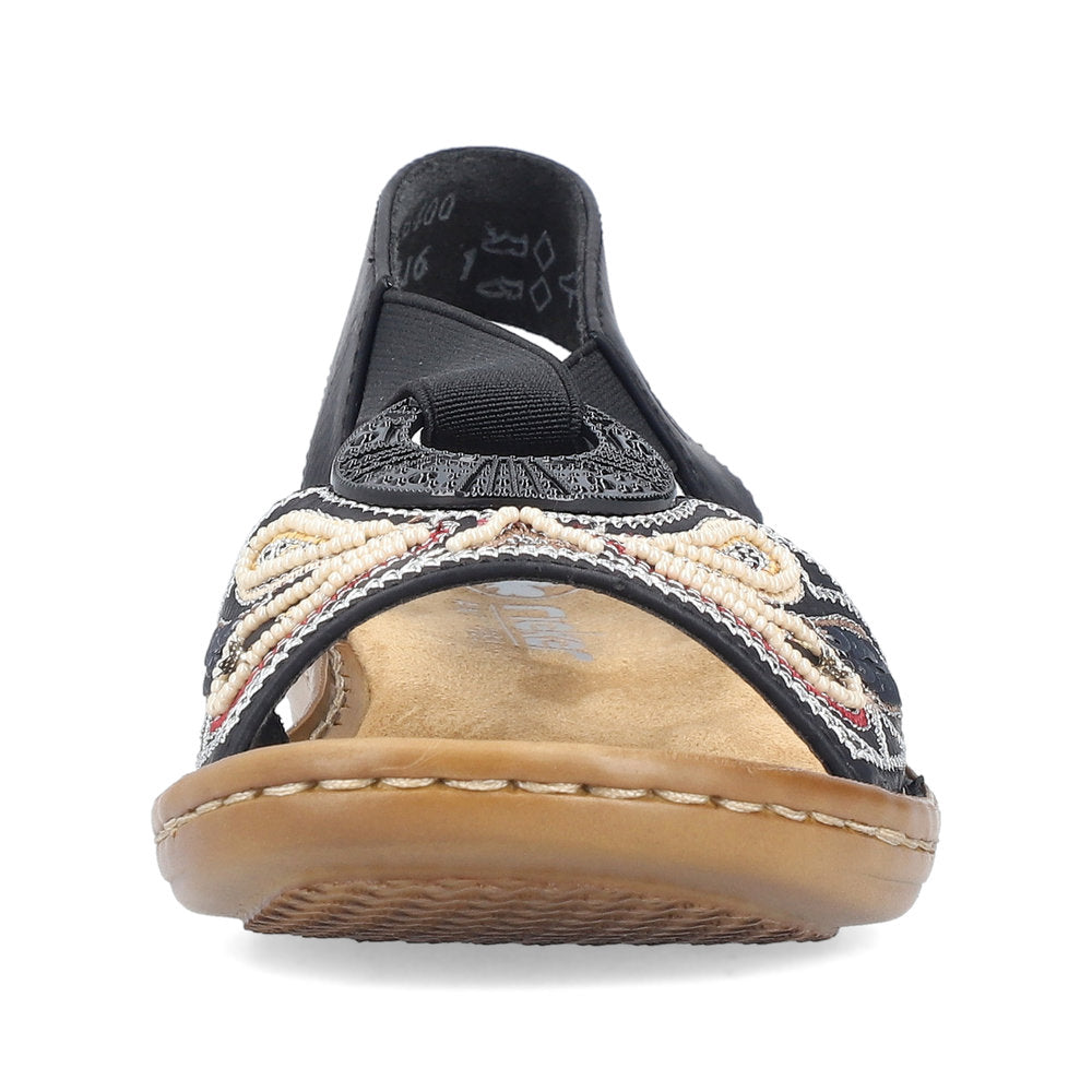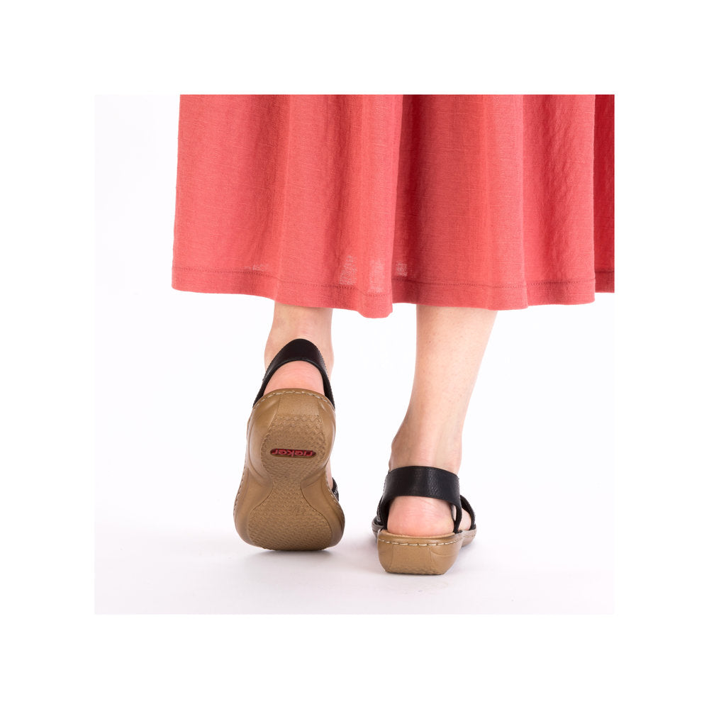 Un pur sentiment d'été ! Ces sandales noires à brides Rieker allient style et confort à la perfection. Confectionnées selon la technique traditionnelle cousue-collée, elles offrent une robustesse et une souplesse exceptionnelles. Un élastique facilite grandement l'enfilage et le retrait. Les détails décoratifs de haute qualité apportent une touche d'élégance. Grâce à leur semelle légère et amortissante avec talon compensé, vos pieds profiteront d'un confort optimal à chaque pas. Leur coupe étroite offre un maintien supplémentaire. Trouvées !