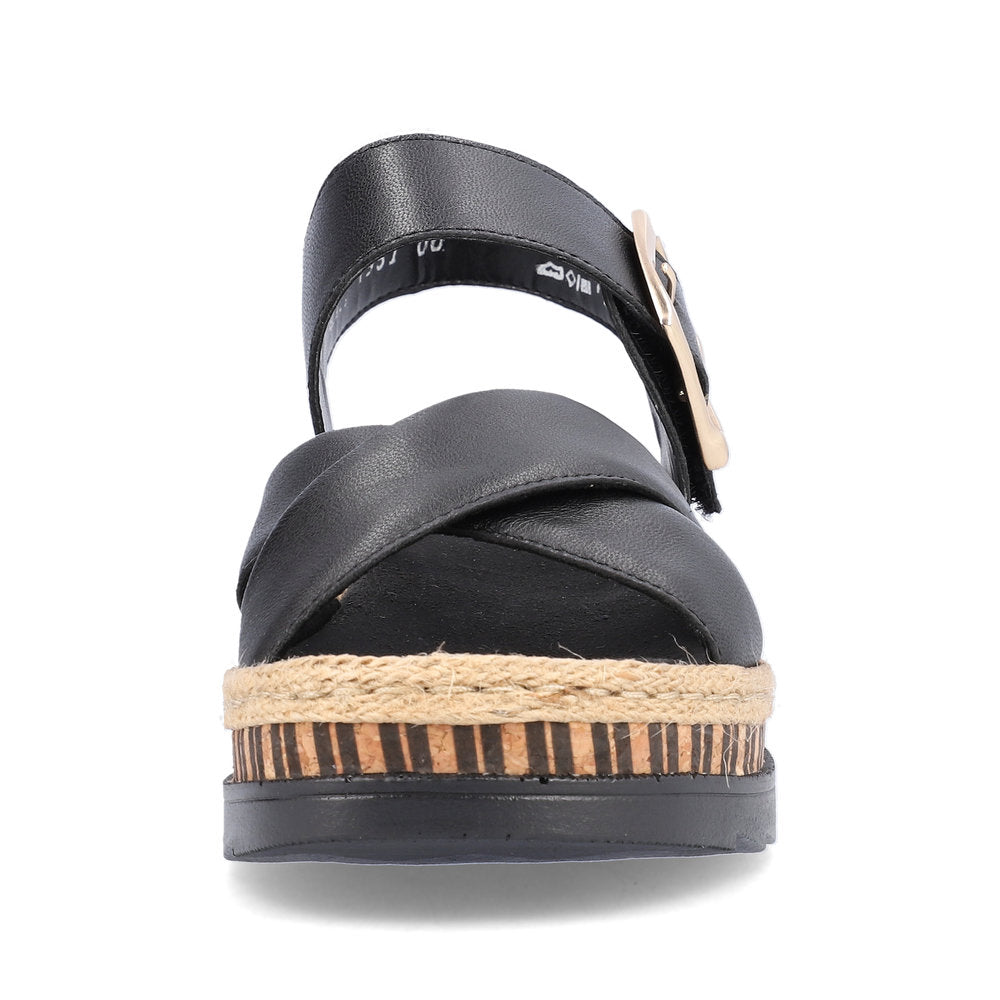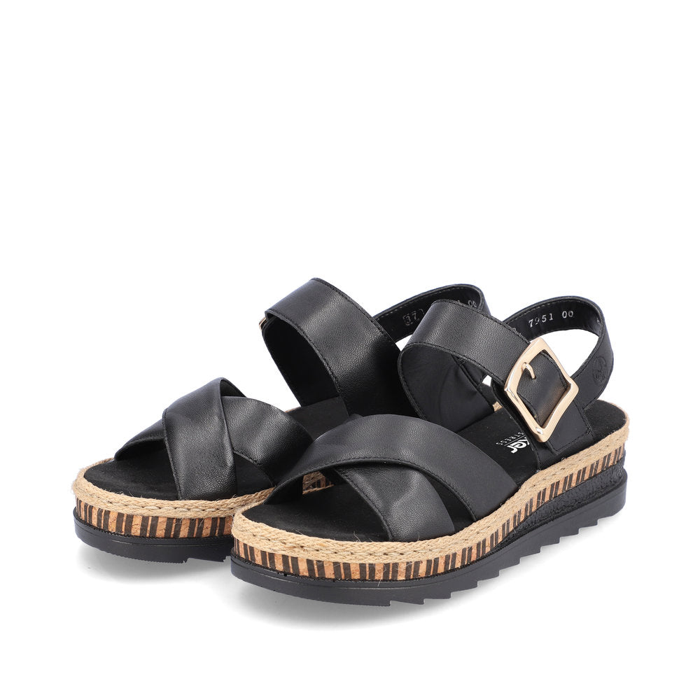 Toujours une longueur d'avance ! Ces sandales compensées Rieker noires en cuir lisse sont confectionnées avec un grand savoir-faire. Leur montage cousu traditionnel leur confère une souplesse et une robustesse exceptionnelles, tout en assurant un excellent maintien. Une fermeture auto-agrippante permet de les enfiler facilement et rapidement. La boucle tendance apporte une touche d'élégance supplémentaire. La semelle intérieure, légère et amortissante, avec son talon compensé, garantit un confort optimal à chaque pas. La semelle extérieure est également d'une douceur incomparable. Grâce à leur coupe étroite, ces sandales offrent un maintien confortable et ajusté. Tout ce dont vous rêvez dans une seule chaussure !